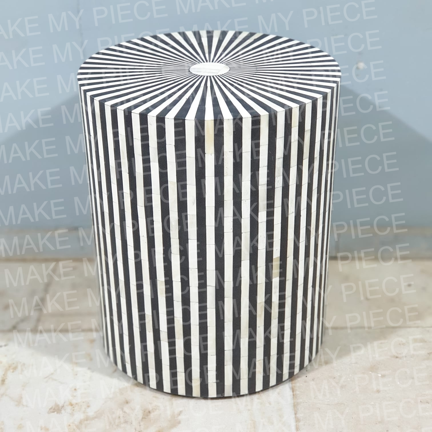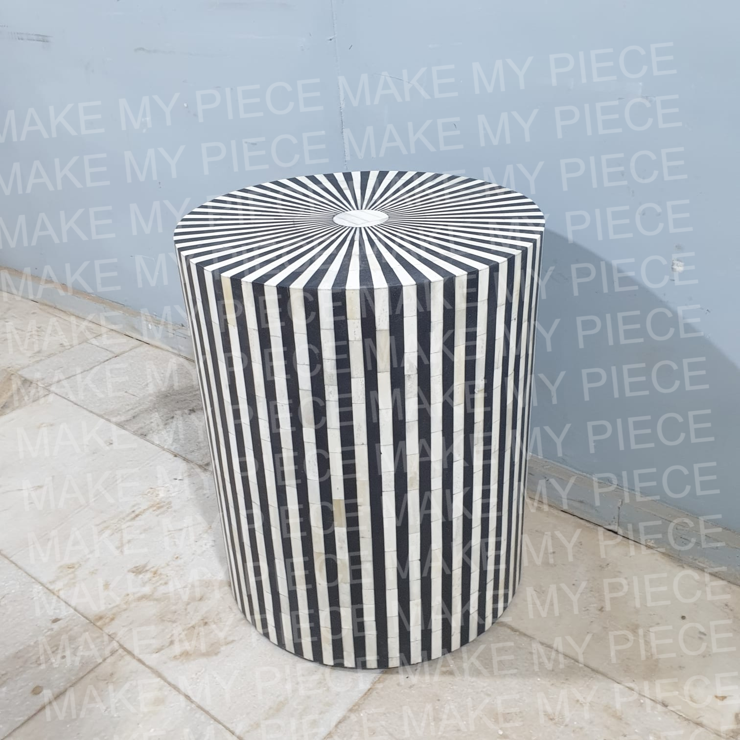 ANNETTE Bone Inlay Round Drum Side Table Black Stripe Pattern