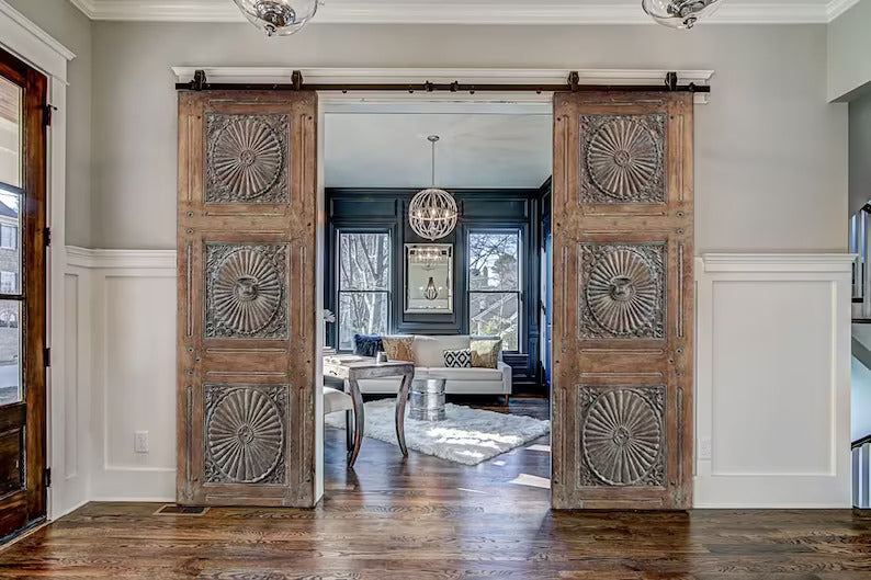 Any size or color is available double or single doors, We can make for your home unique hand-carved barn doors, dining table, coffee table, bed headboard, wood wall decor.