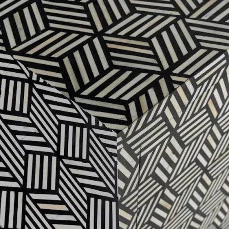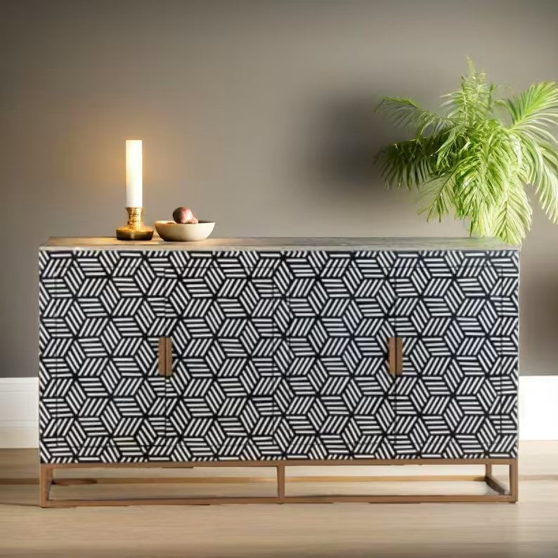 Bone Inlay Handmade Solid Hard Wood Modish Sideboard Black Geometric Pattern