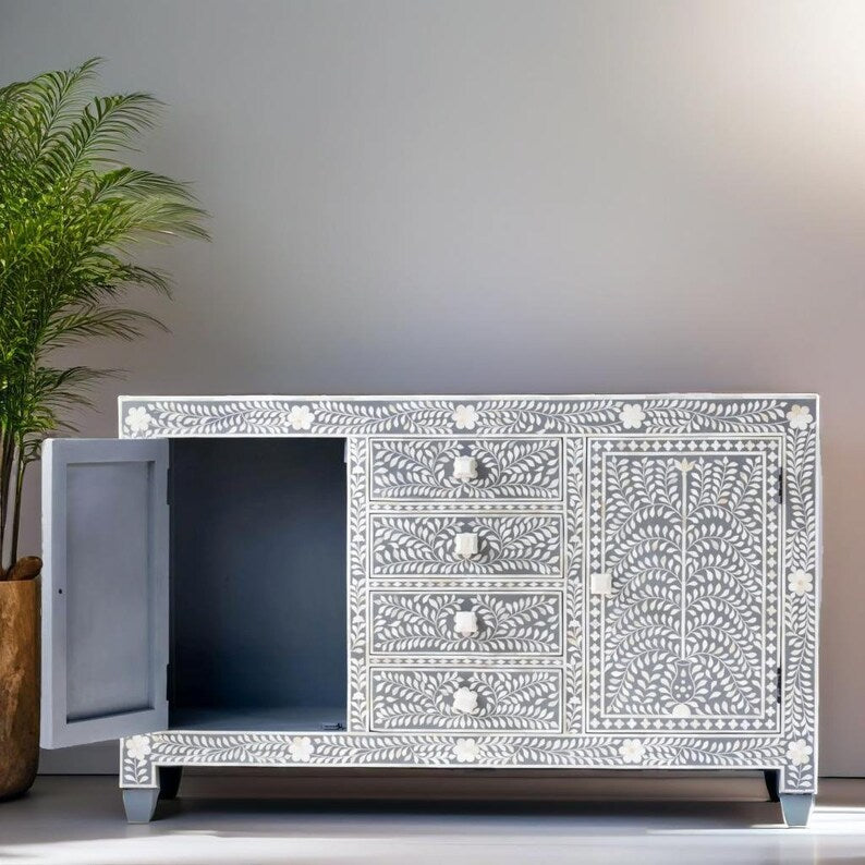 Bone Inlay Handmade Solid Hard Wood Modish Sideboard Grey Floral Pattern