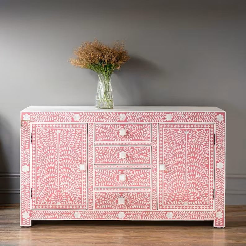 Bone Inlay Handmade Solid Hard Wood Modish Sideboard Pink Floral Pattern