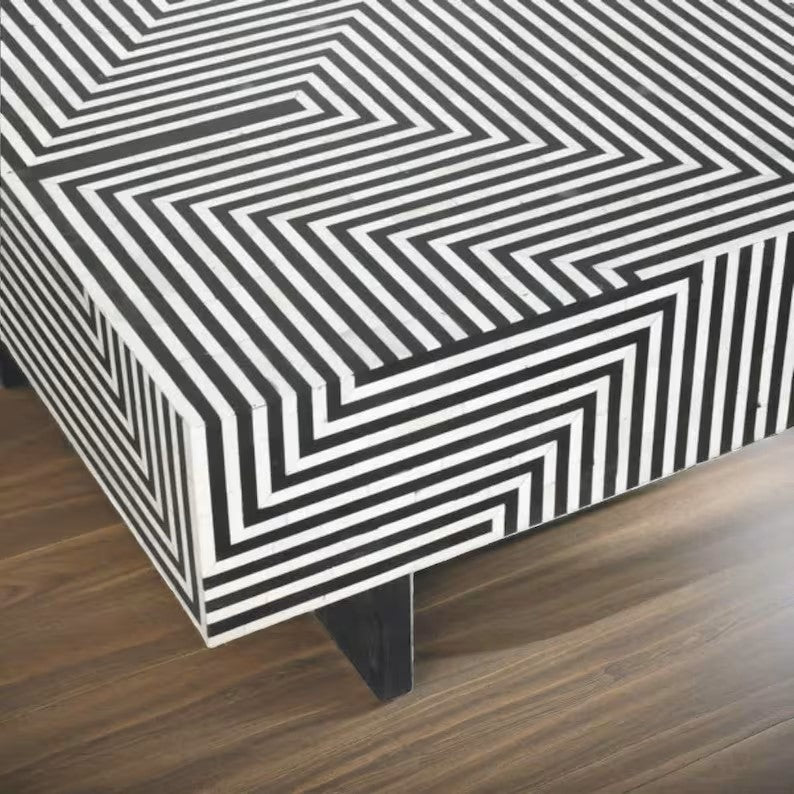 Bone Inlay Handmade Solid Wood Coffee Table in Black Strip Pattern