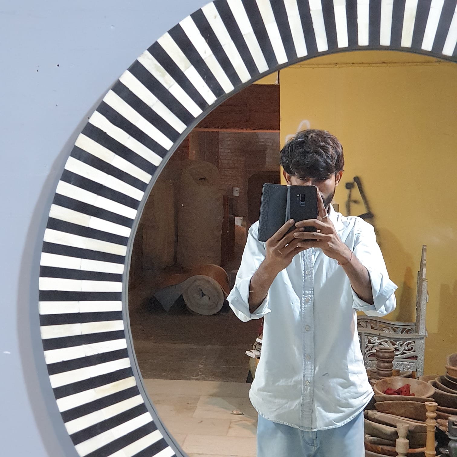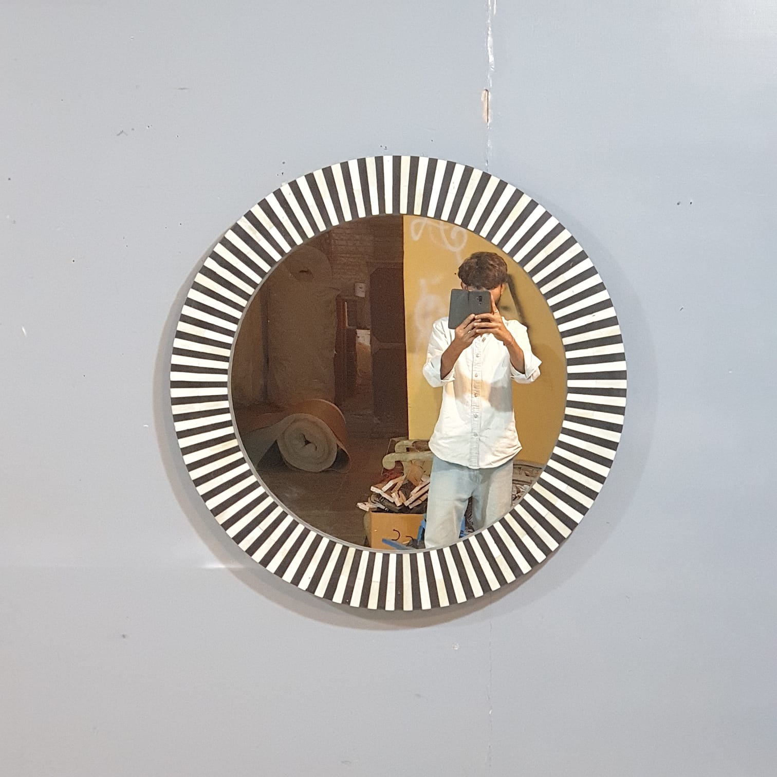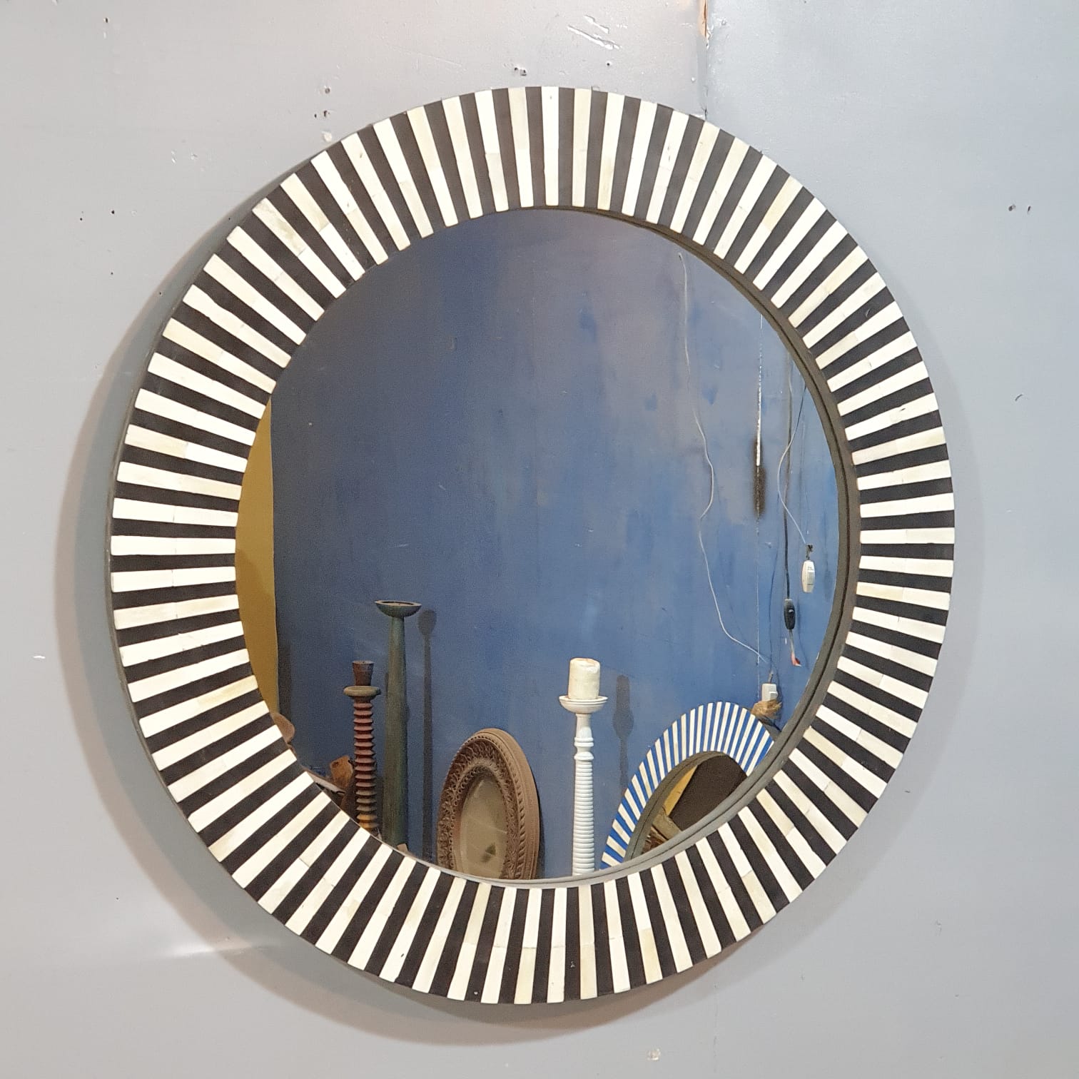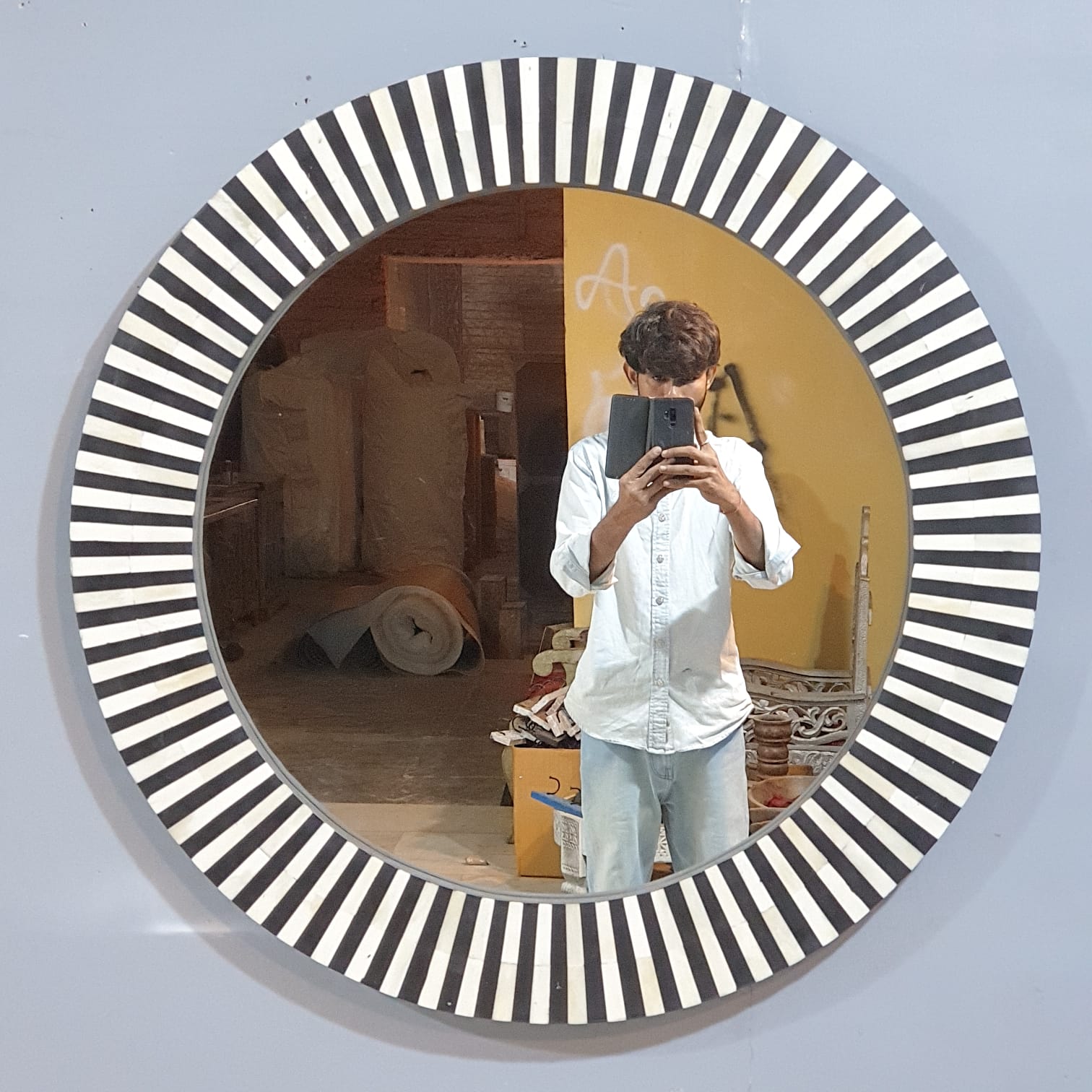Bone Inlay Stripe Pattern Mirror Frame Black and White 90x90 cm