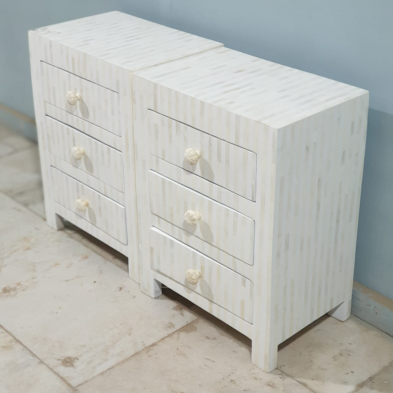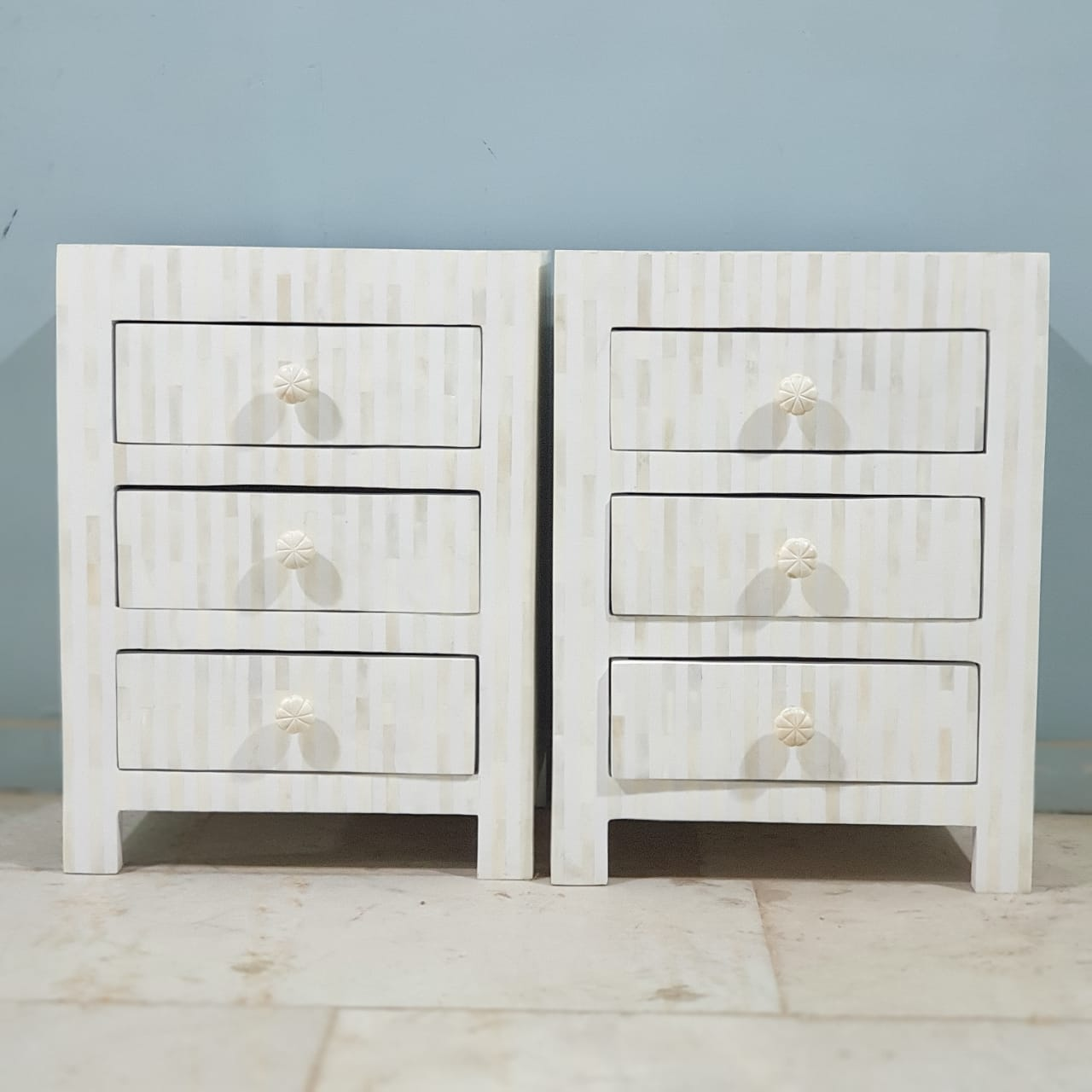 Bone Inlay White Stripe Pattern Bedside Table With 3 Drawers 45X30X60 Cm