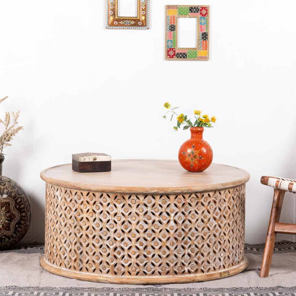 Bristol Hand Carved Indian Solid Wood Round Coffee Table With Jali (White)