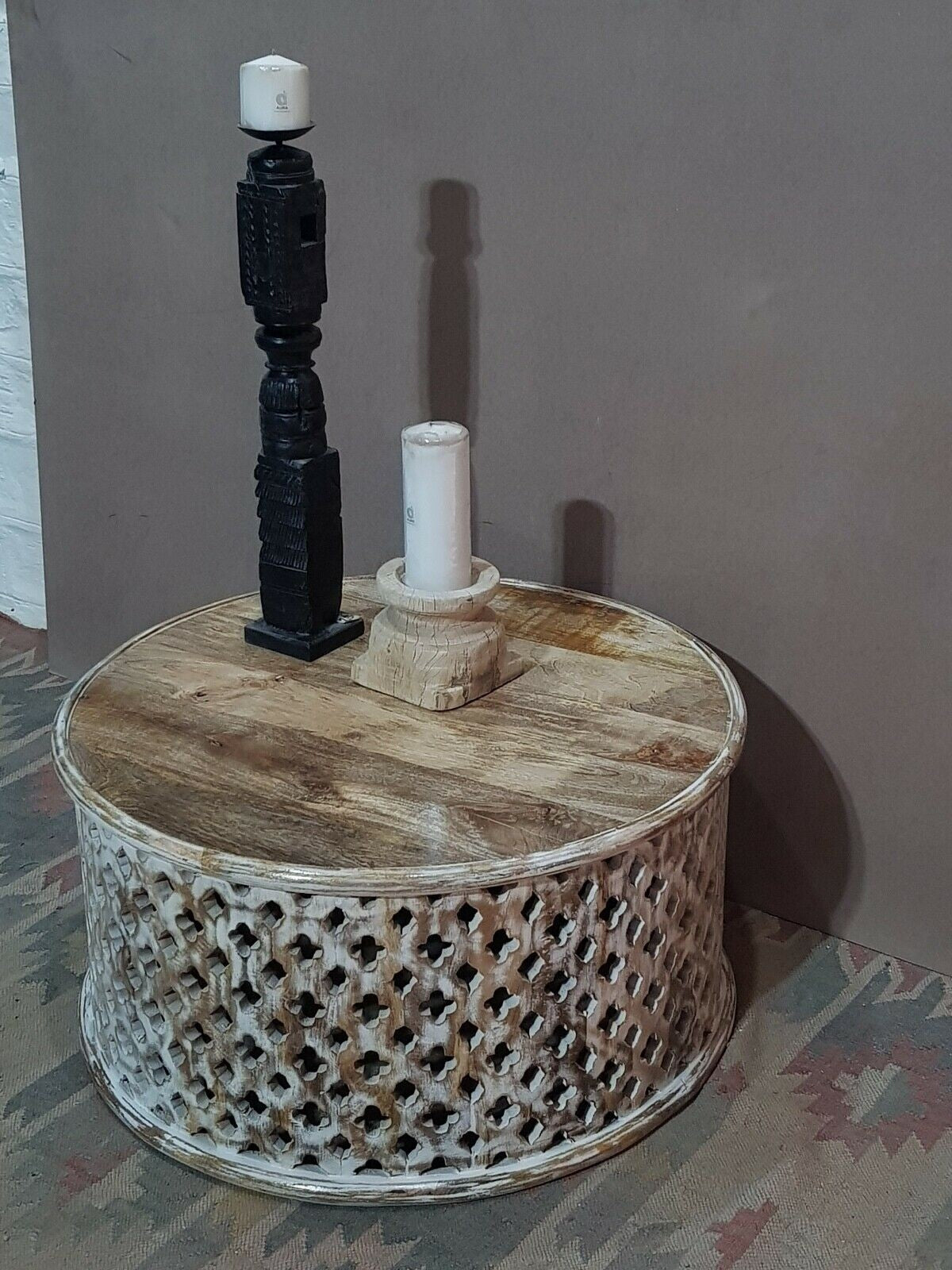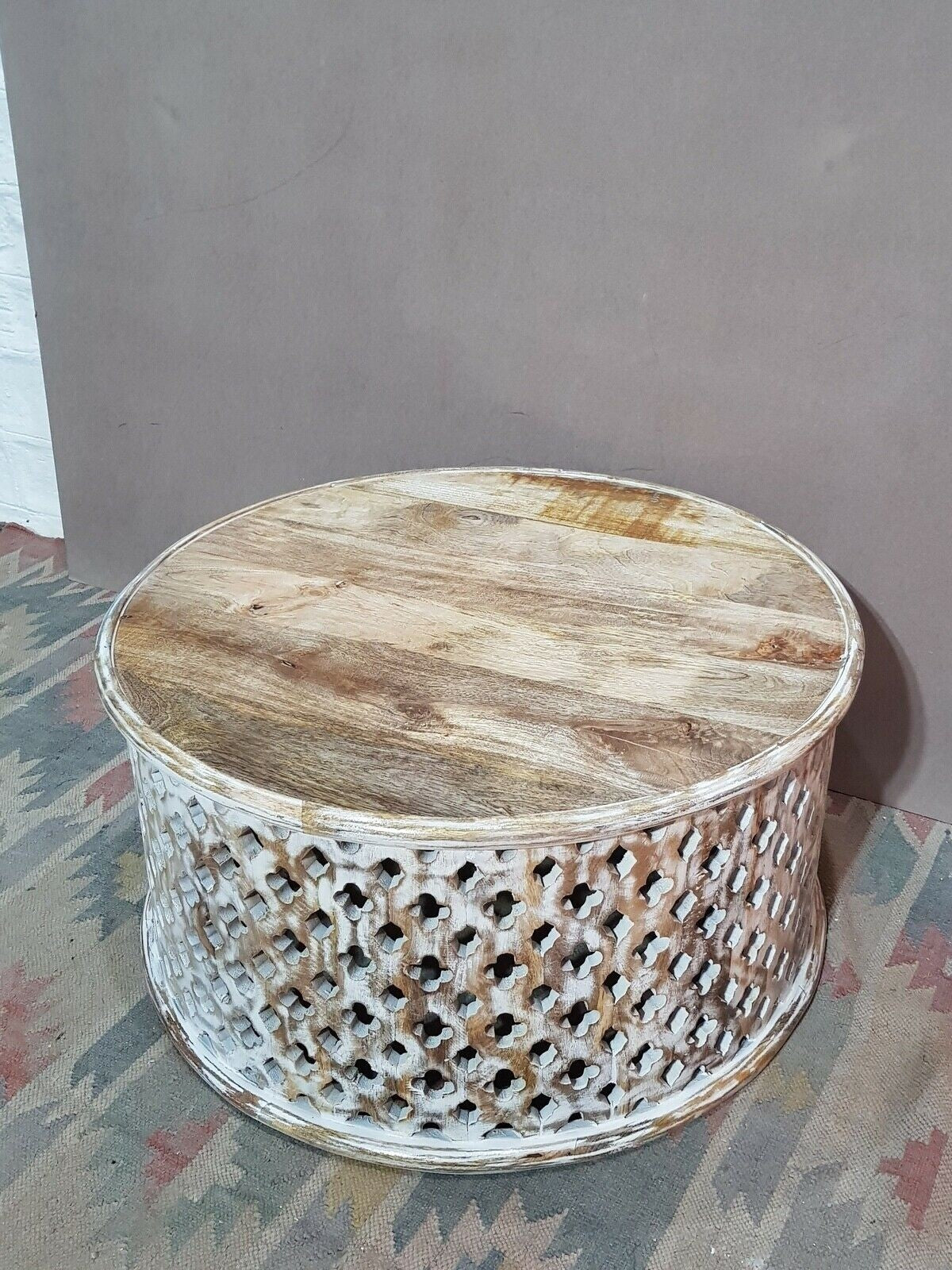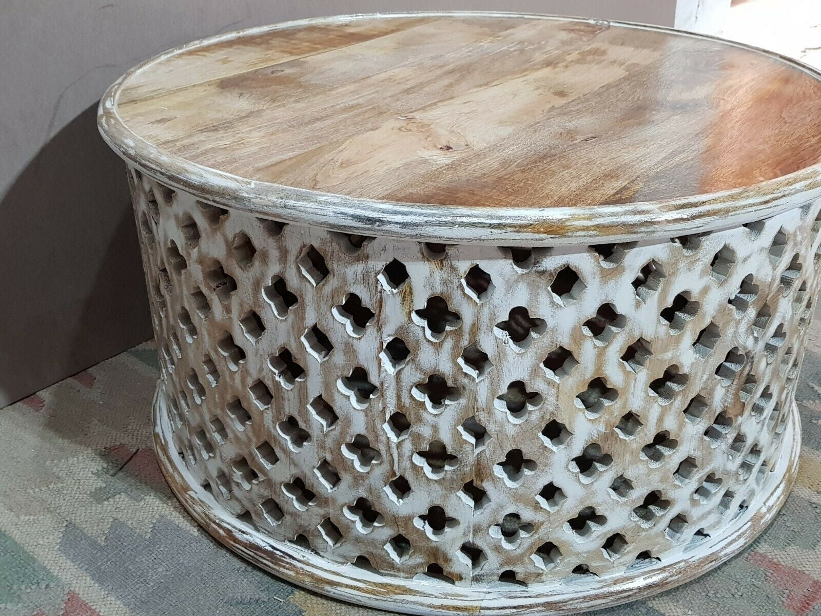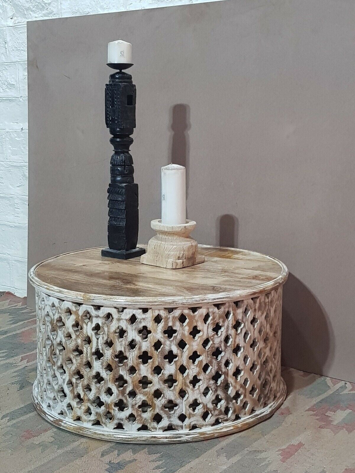 Bristol Indian Solid Wood Hand Carved Round Coffee Table White 80x80x40 cm