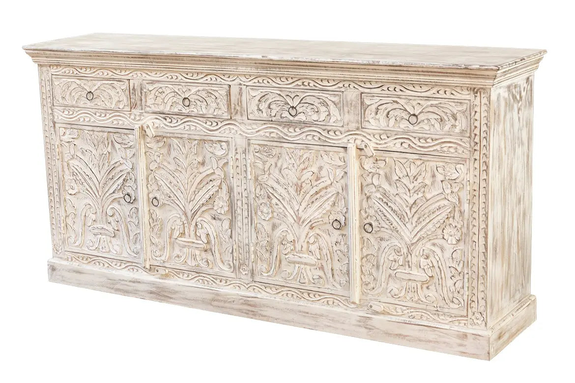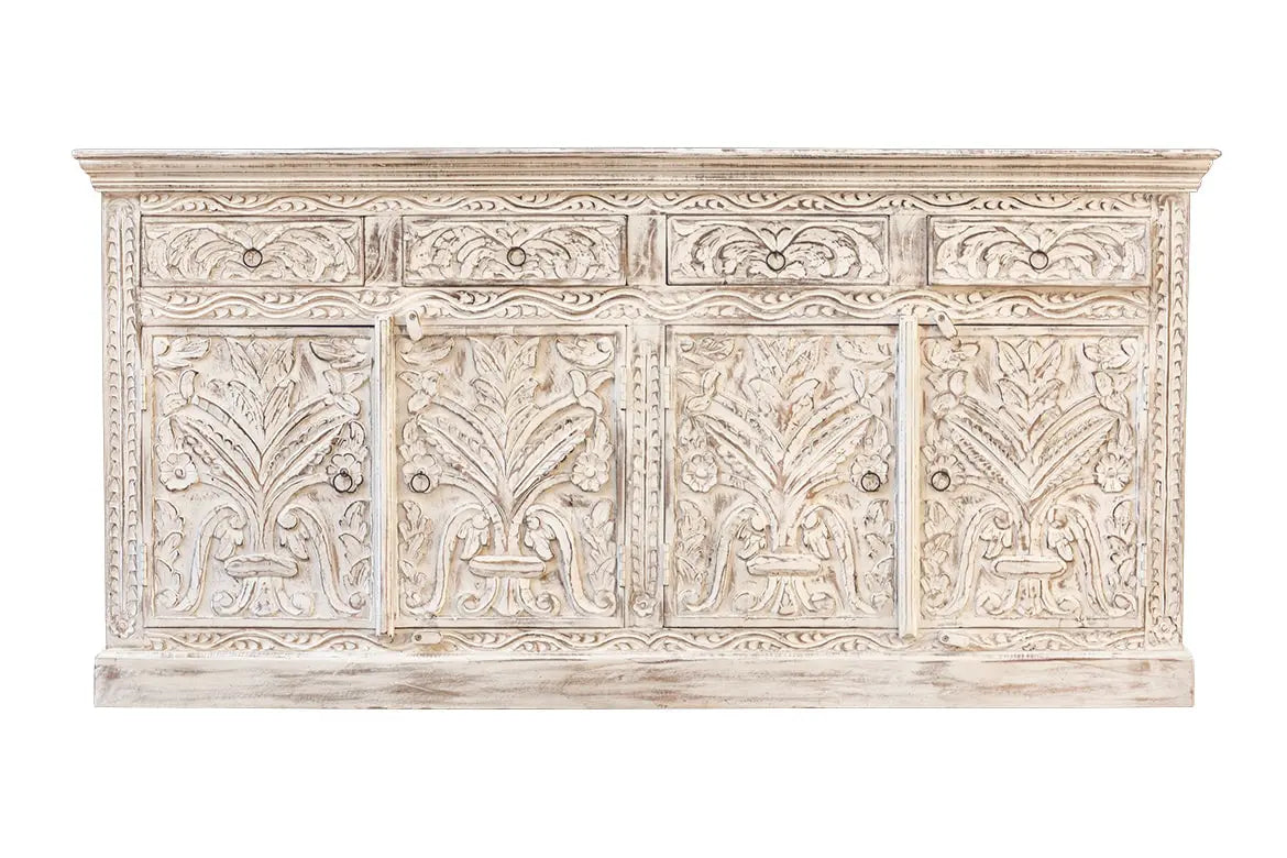Carved Oasis Hand Carved Mango Wood 4 Doors 4 Drawers Sideboard Distressed