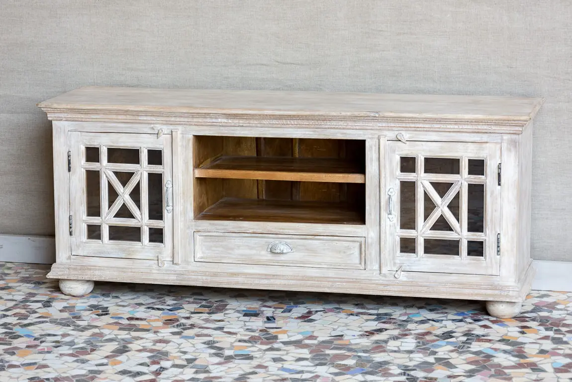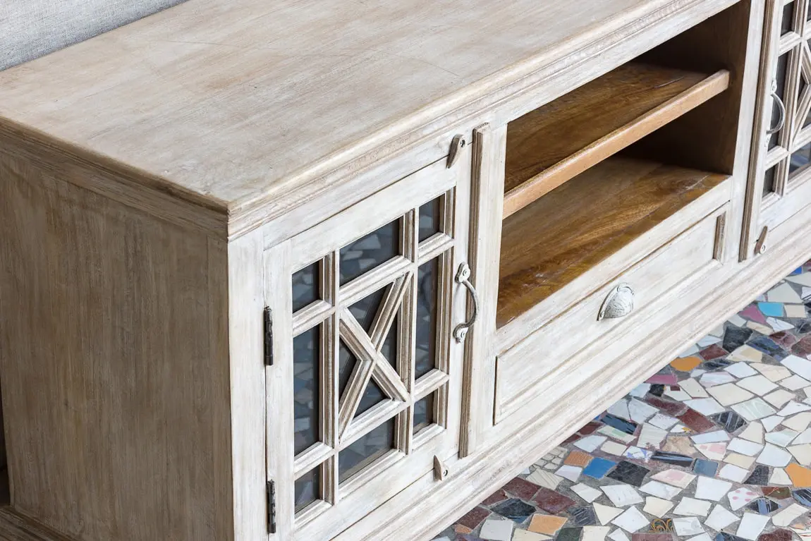 Indian Hand French Arched Solid Wooden Glass Doors Entertainment TV Unit Plasma Solid Whitewash 160×43×66cm