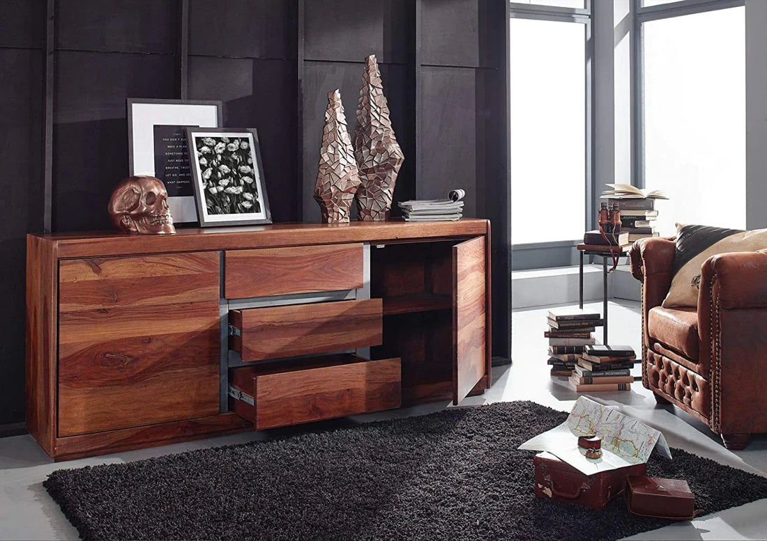 Gfine Sideboard with two doors and three drawers made of solid Sheesham wood 178x45xx75Cm