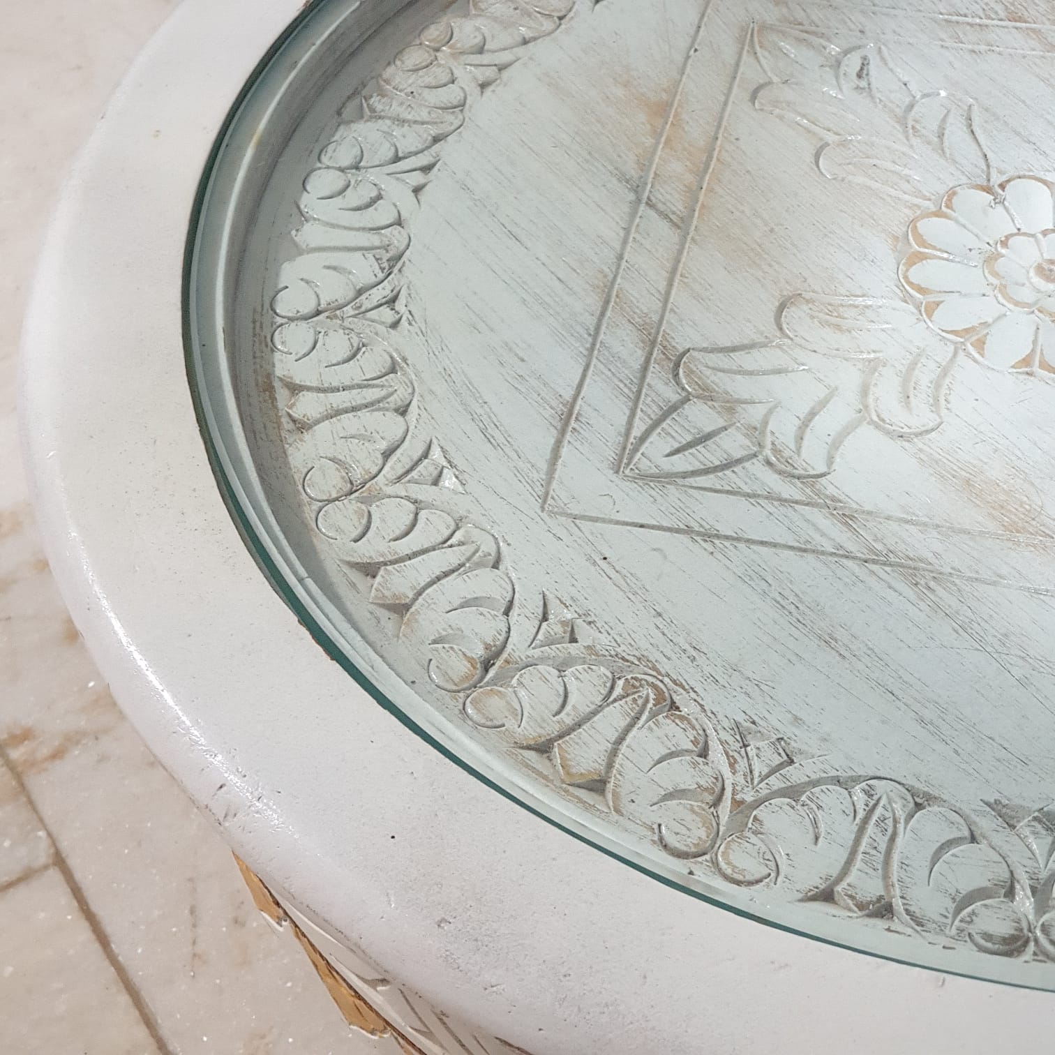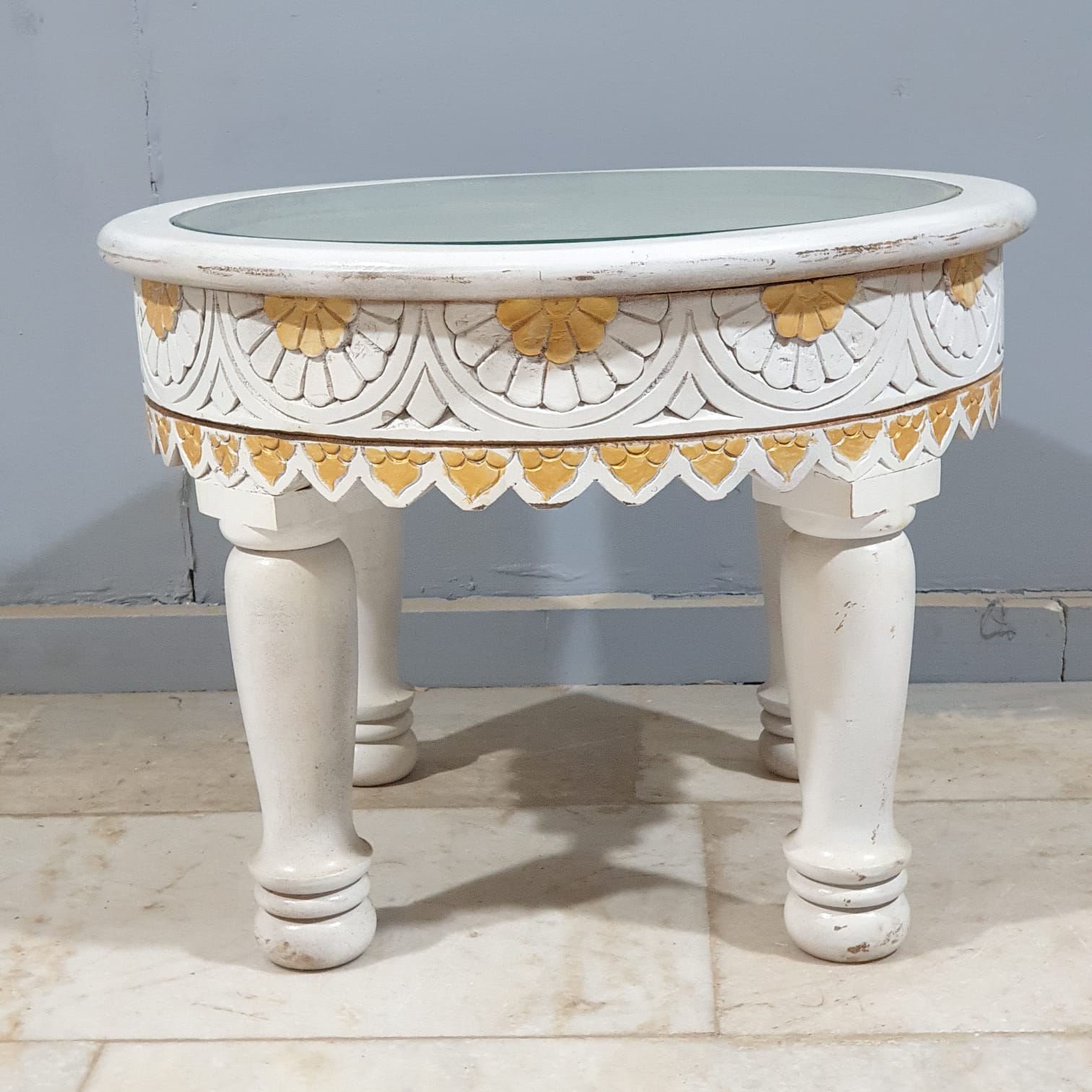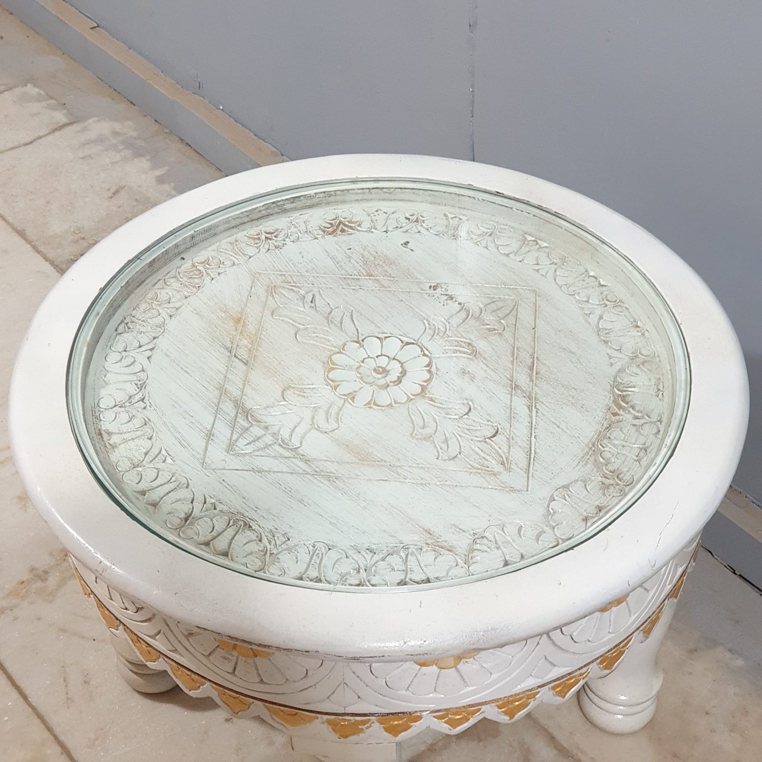 Hand Carved Indian Solid Wood Round Top Glass Coffee Table 60X60X45 cm