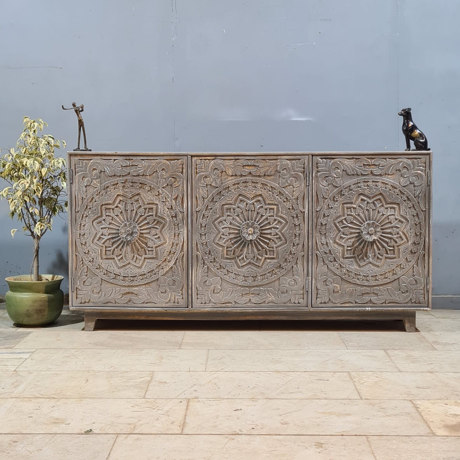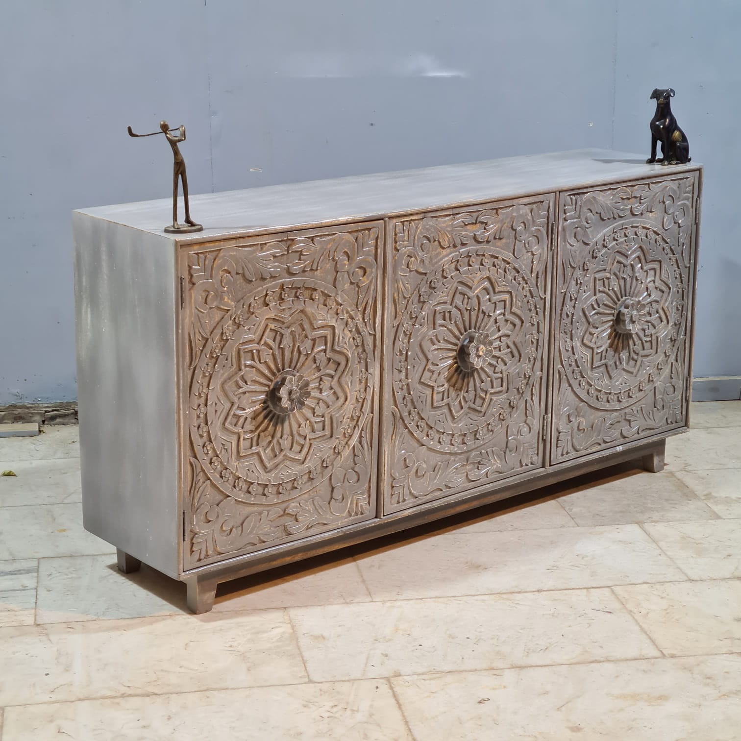 Hand Carved Solid Wood 3 Door Sideboard Grey 170x40x85 cm