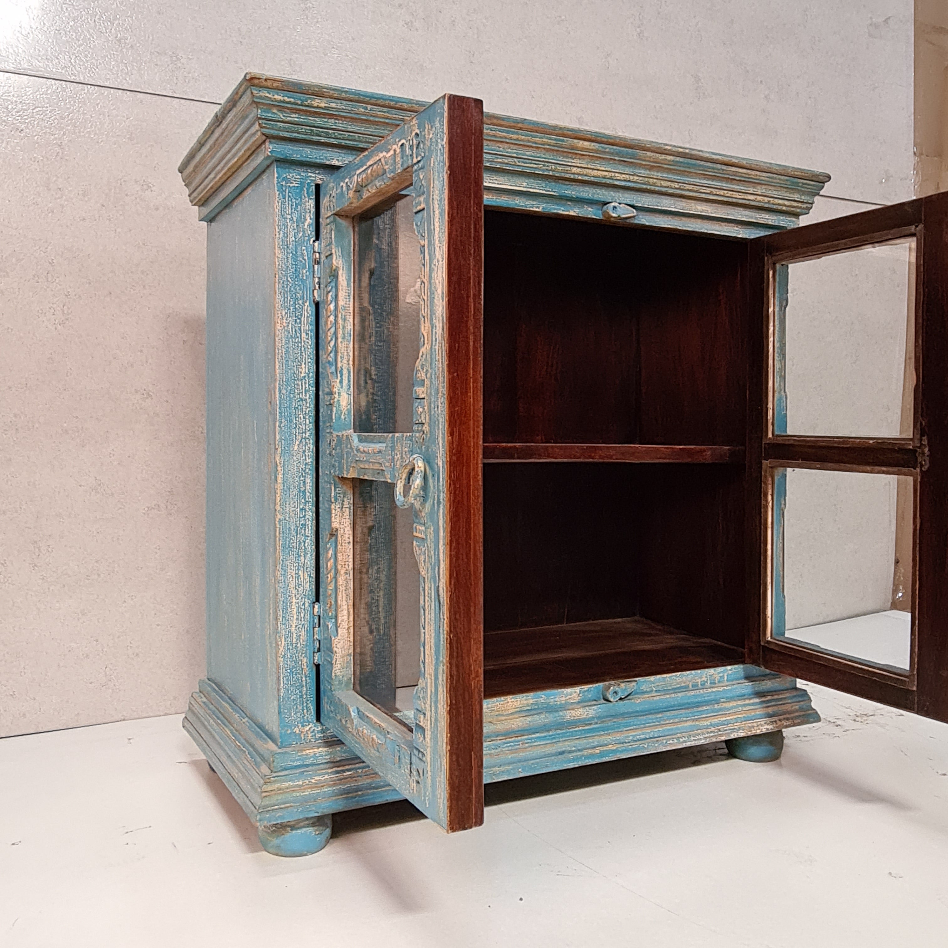 Handcrafted Indian Furniture Carved Solid Hard Wood 2 Doors Cabinet Blue 96x45x97Cm