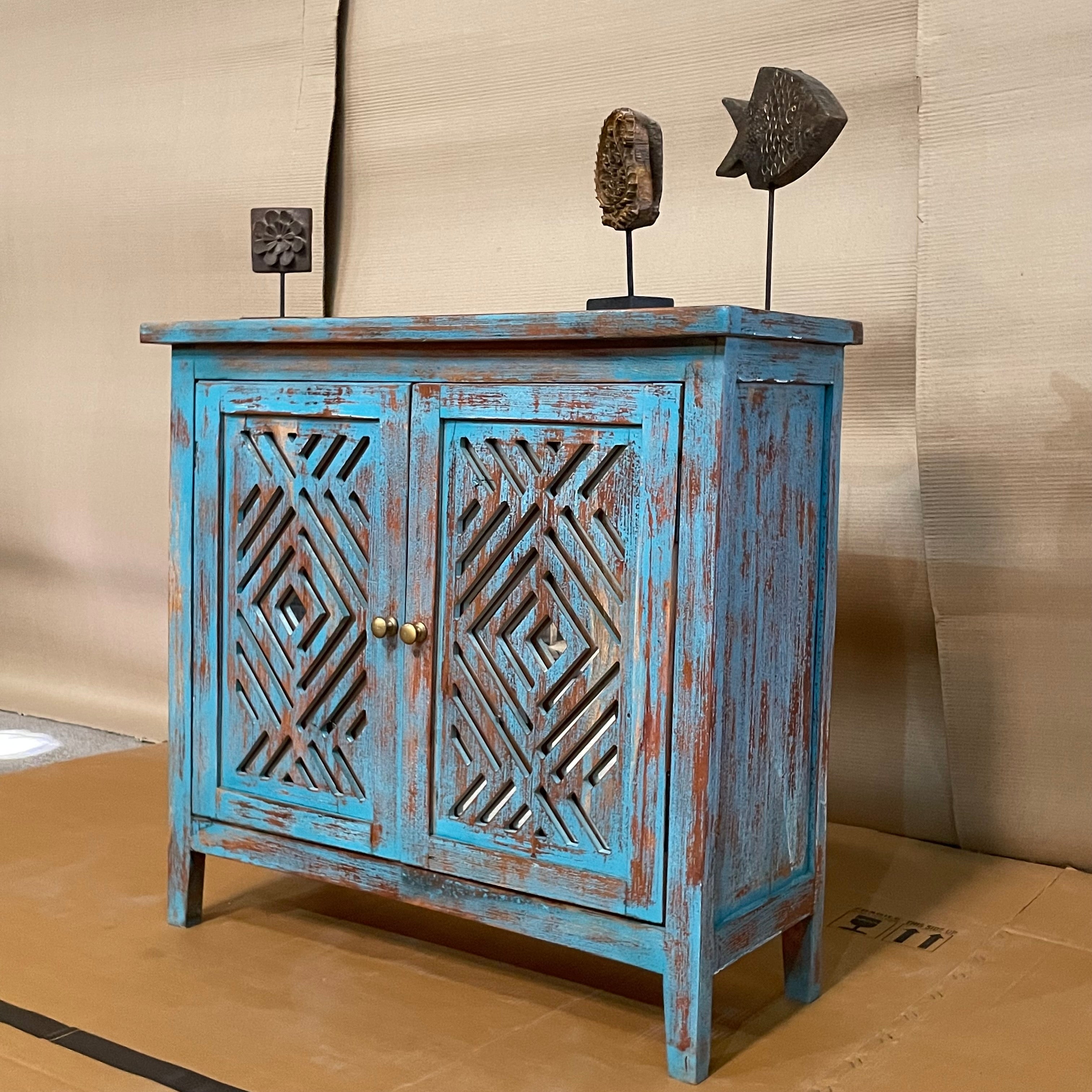 Handcrafted Indian Furniture Carved Solid Hard Wood 2 Mirror Doors Cabinet Blue