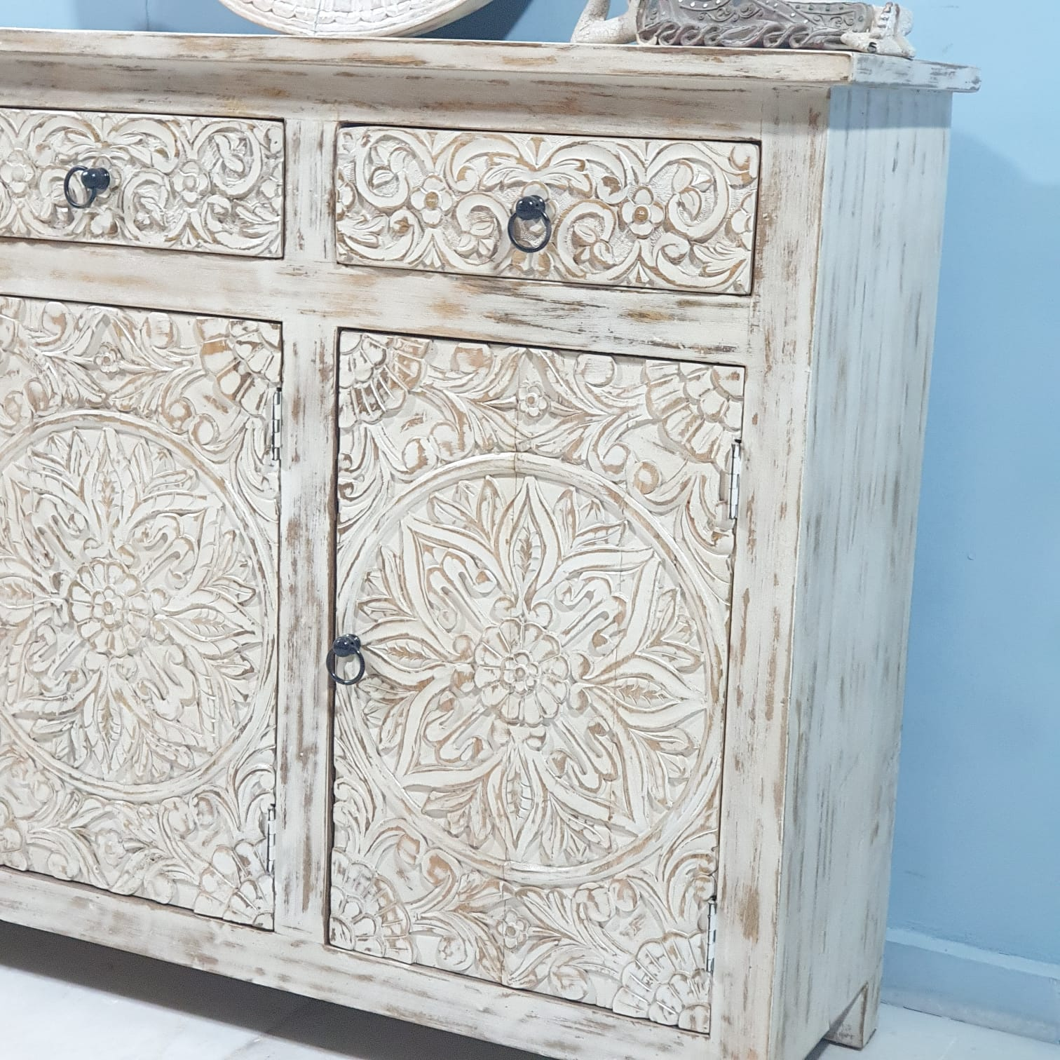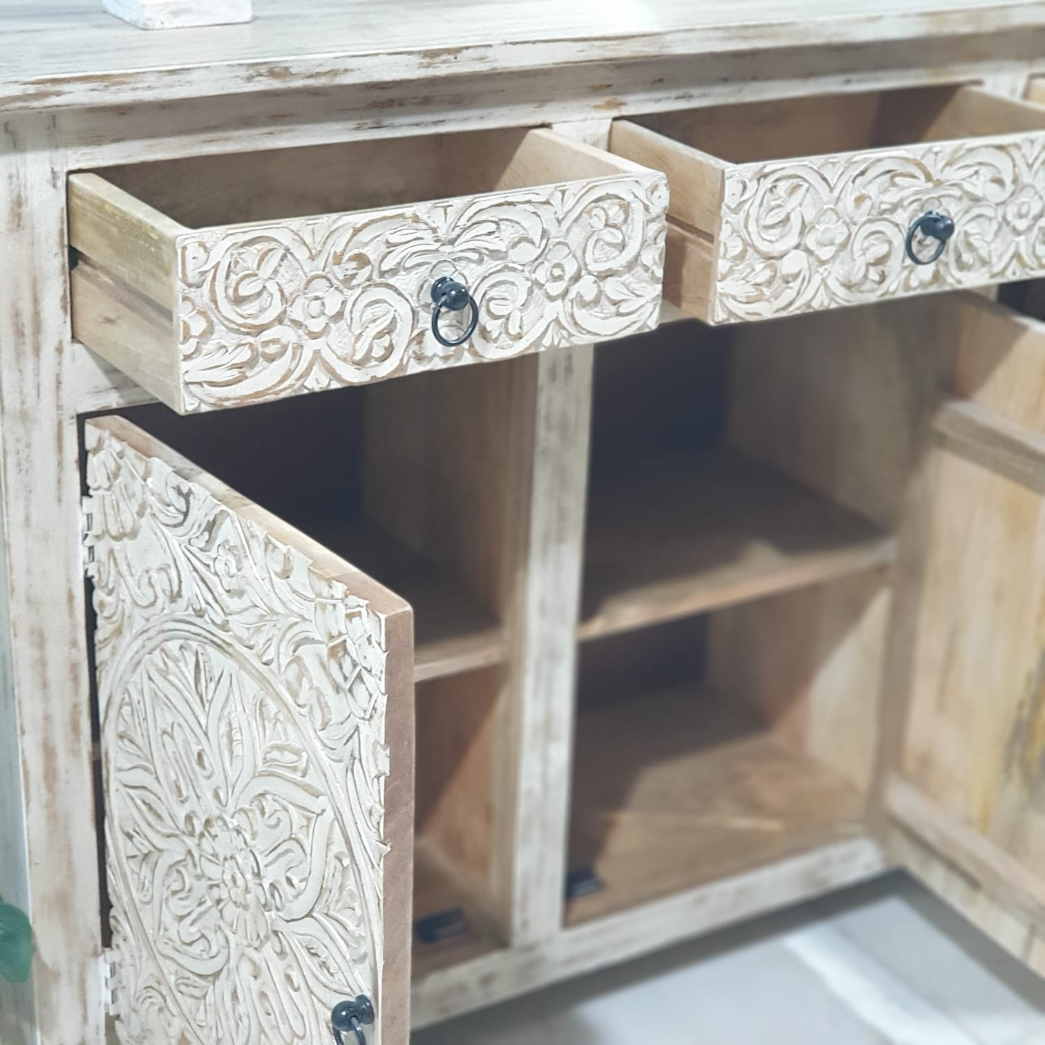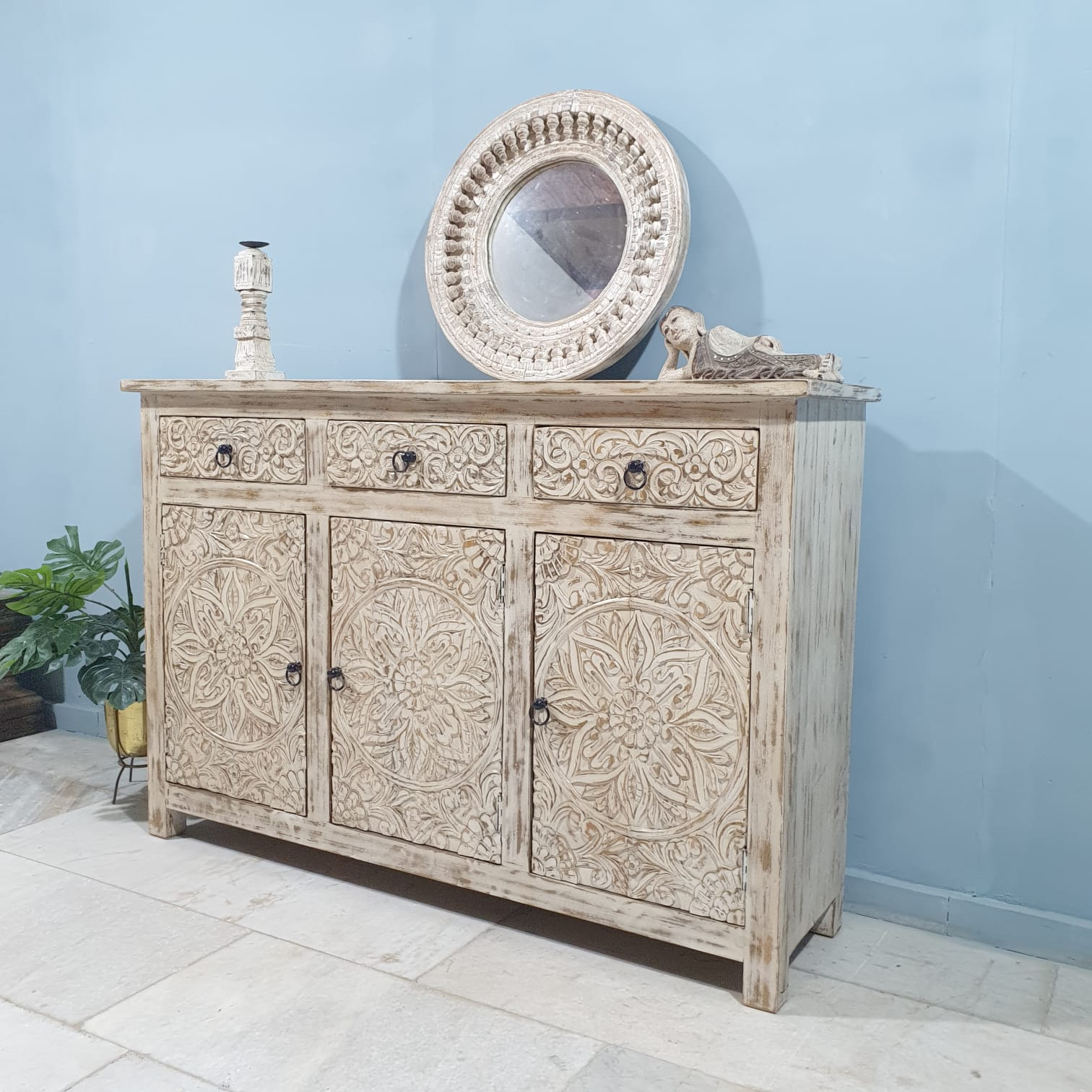 Handmade Carved Indian Furniture Mango Hard Wood 3 Drawers 3 Doors Sideboard Creamwash