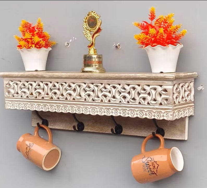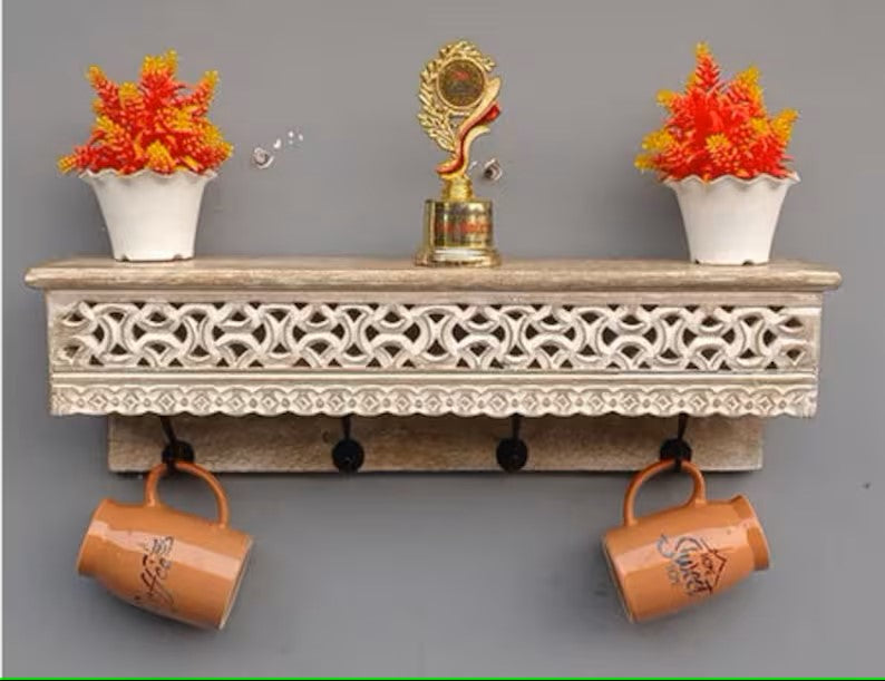 Handmade Home Decor Carved Mango Wood Floating Wall Shelf in White
