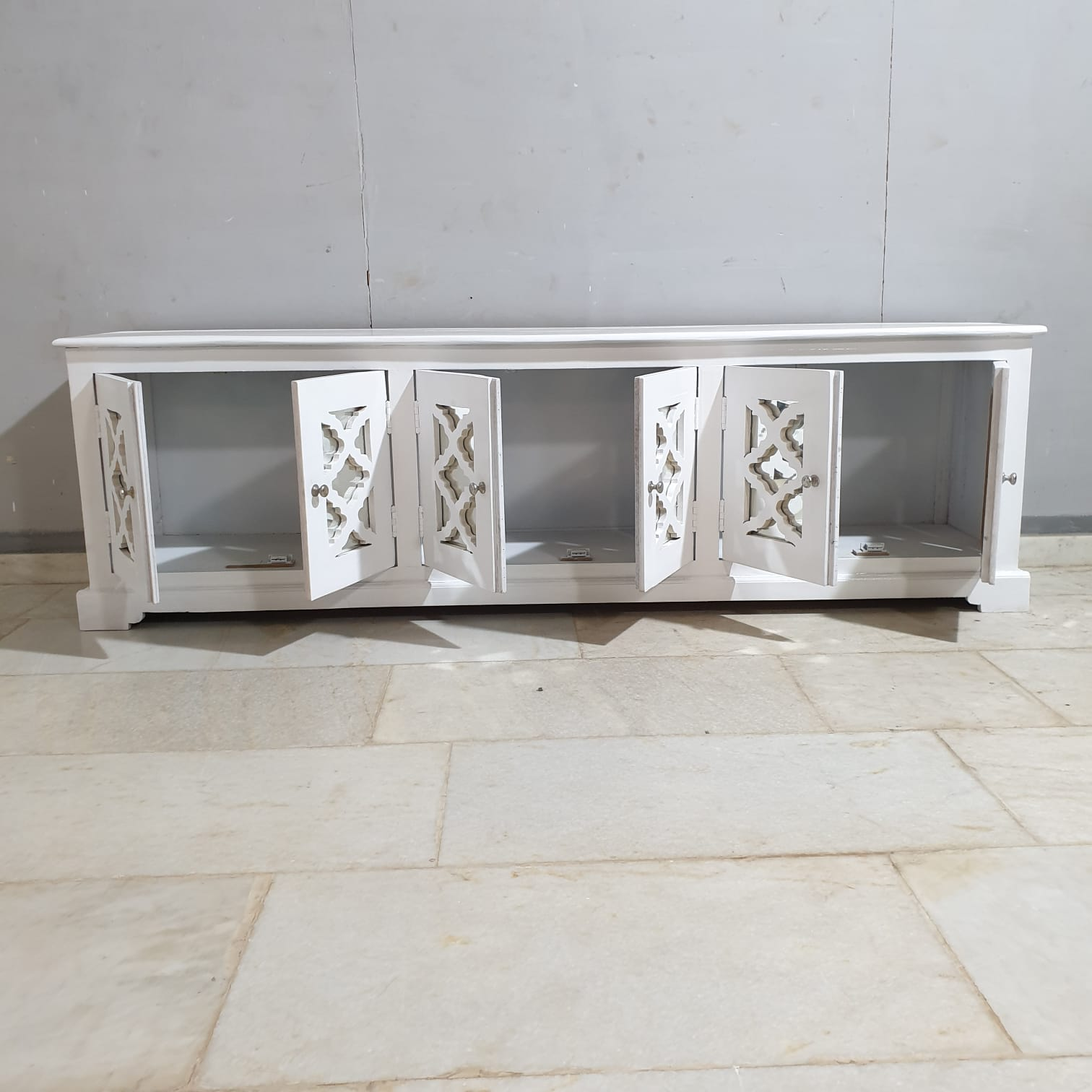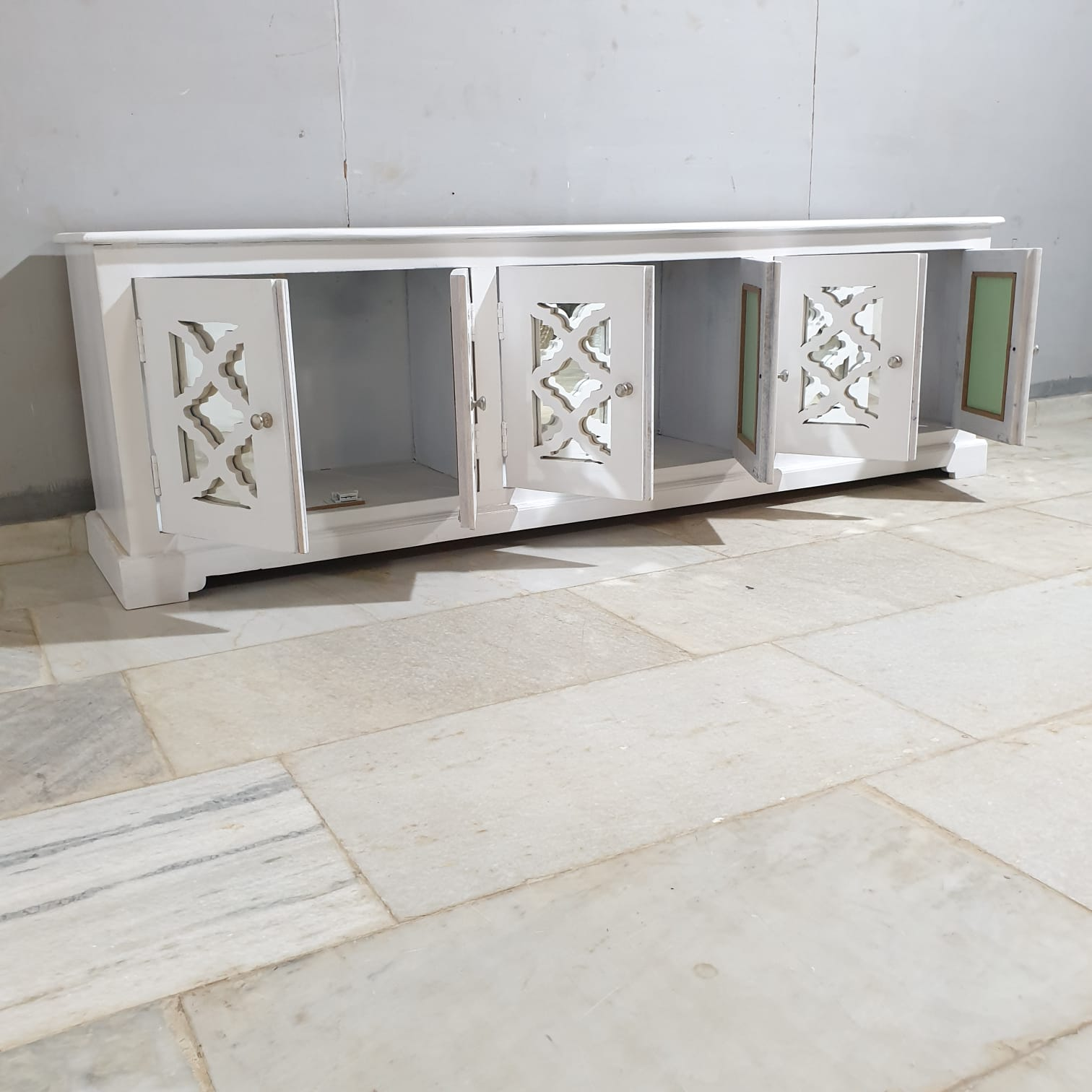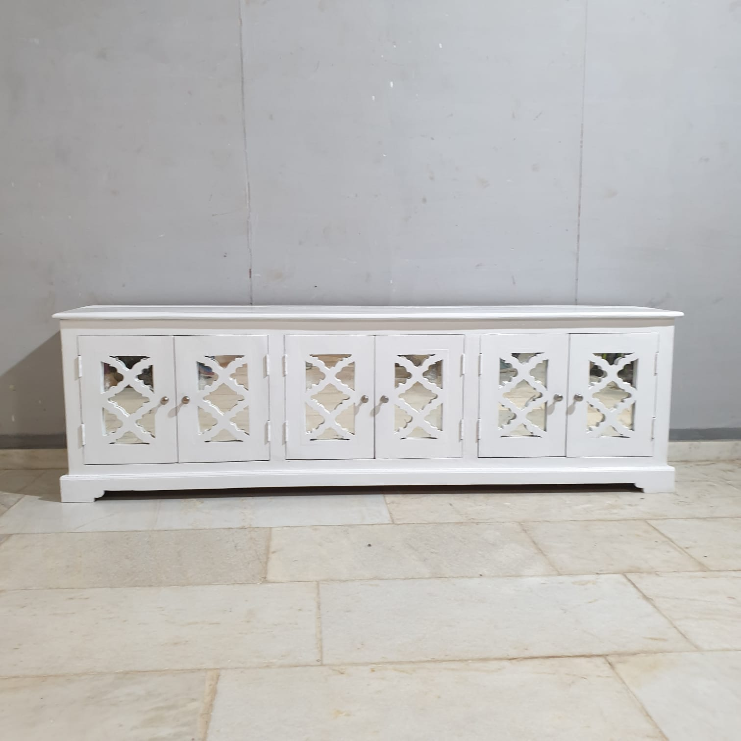 Handmade Indian Furniture Solid Hard Wood TV Unit with 6 Mirror Doors All White 200x40x60Cm