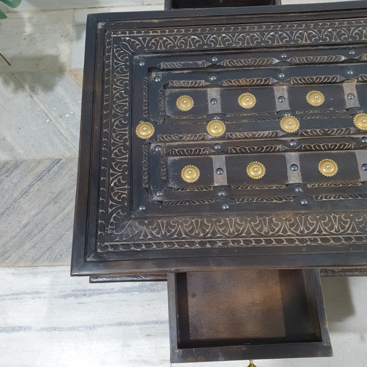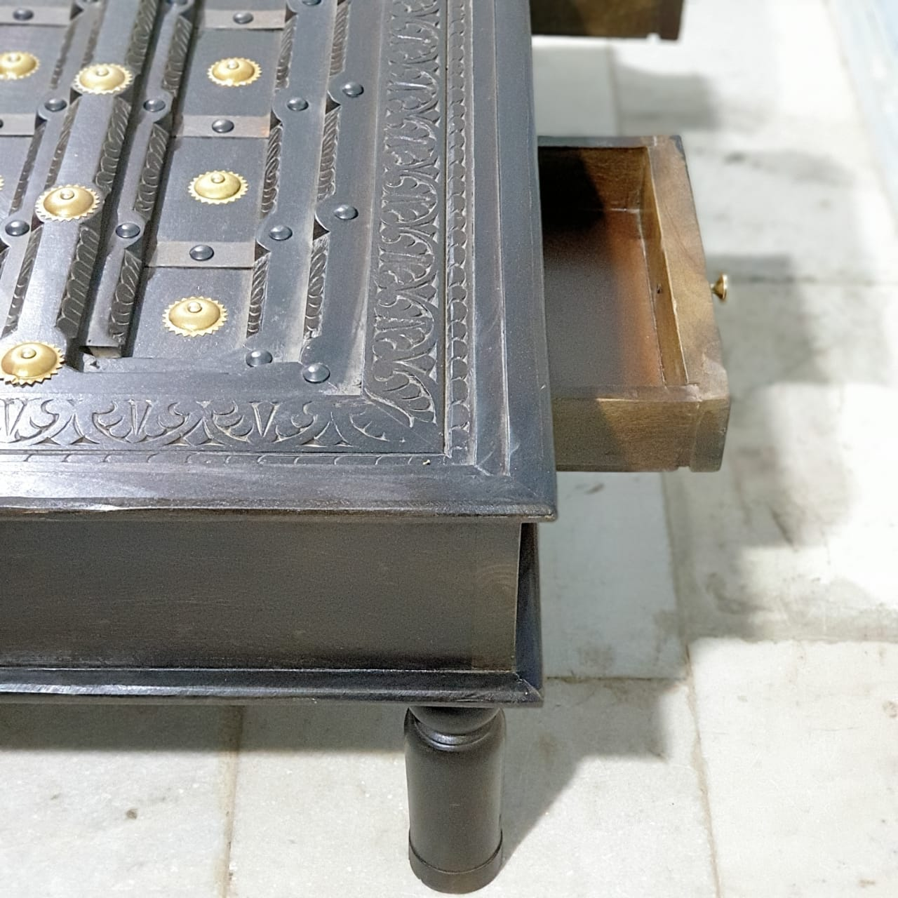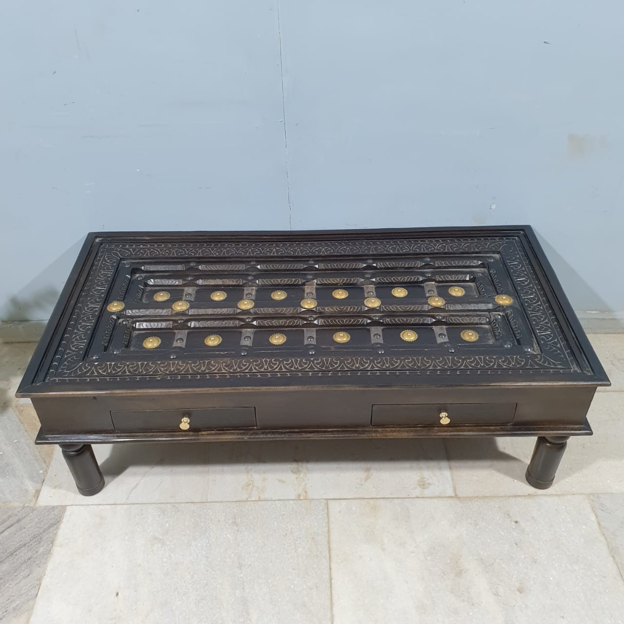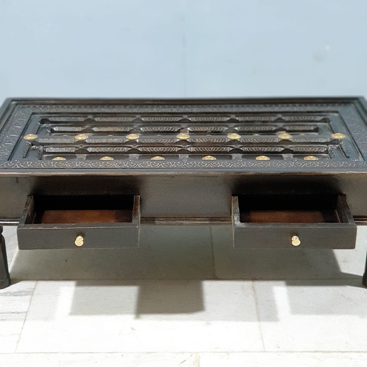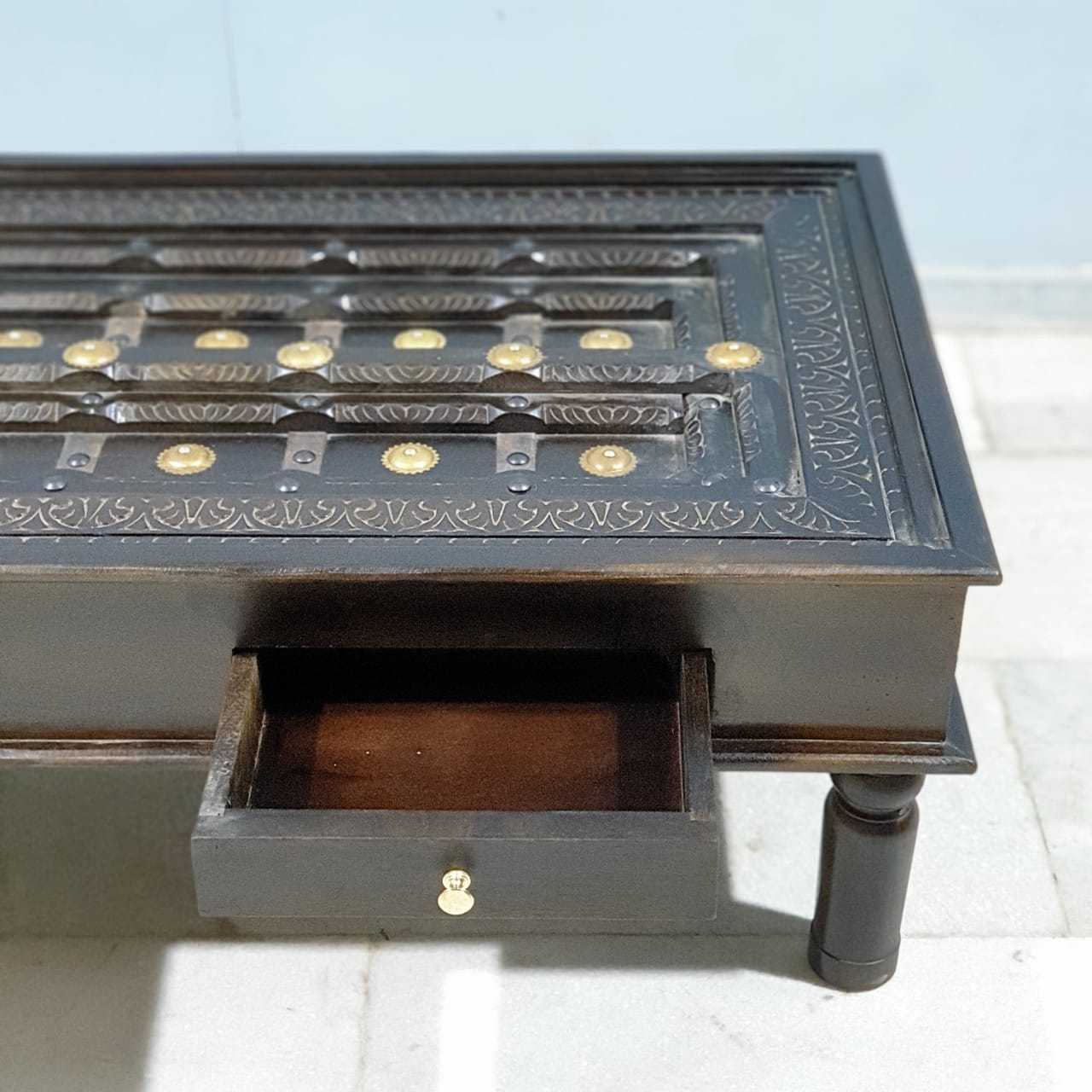 Handmade Indian Furniture Solid Mango Wood Carved Coffee Table With 2 Drawers Brass Work