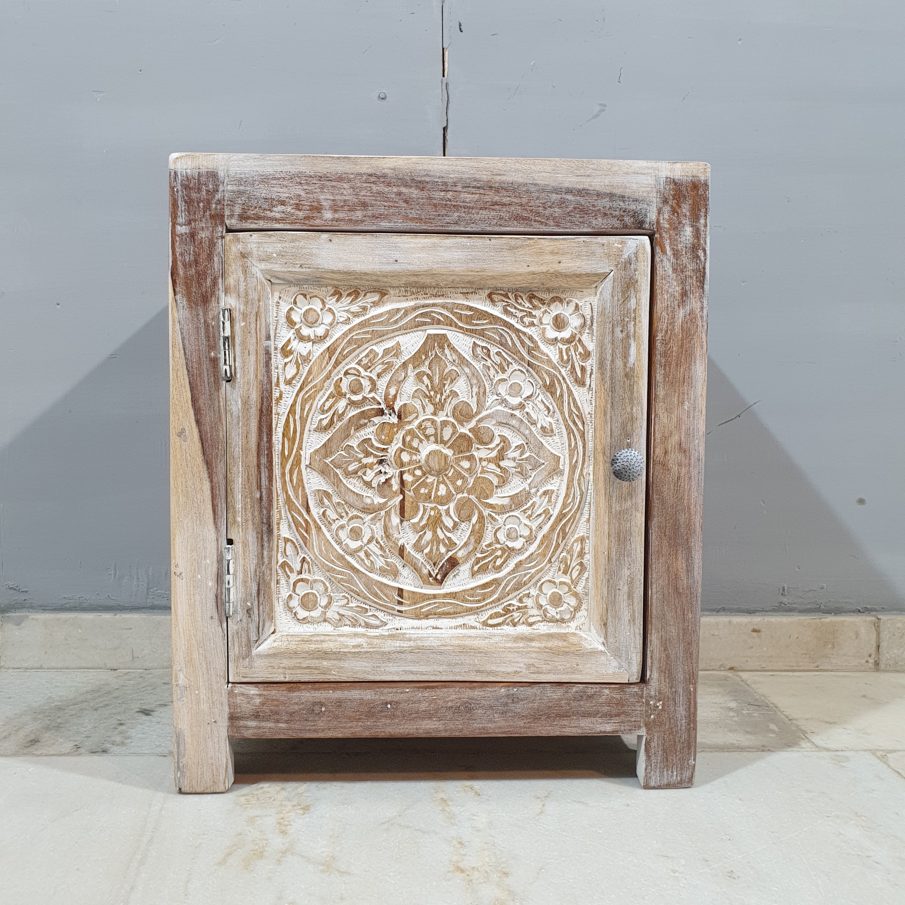 Indian Antique Tribal Hand Carved Art Solid Wooden Bedside Whitewash