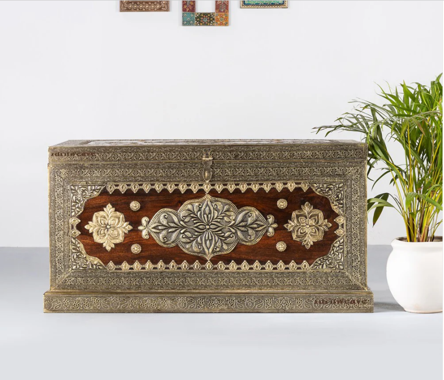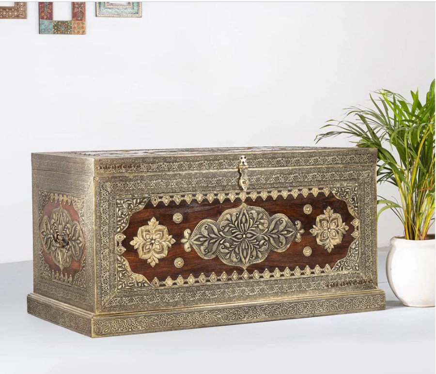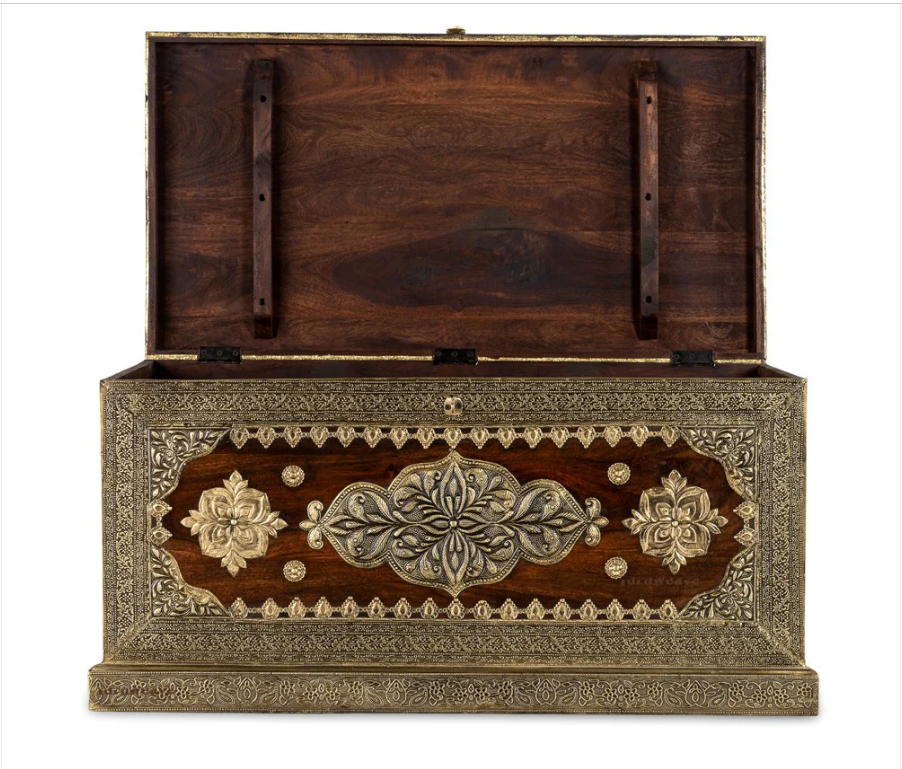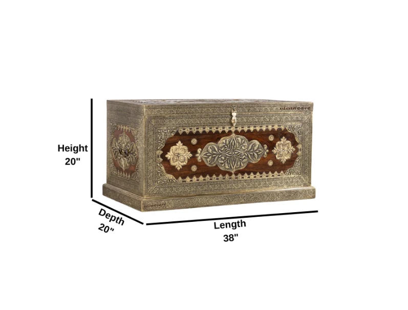 Indian Brasswork Antique Solid Wood Blanket Box Chest C11