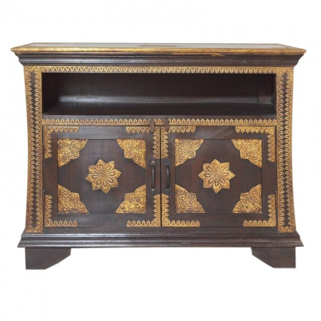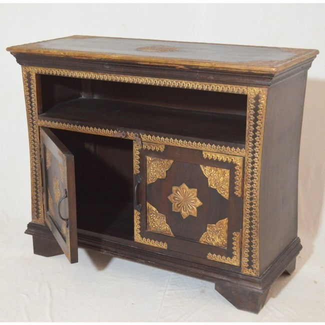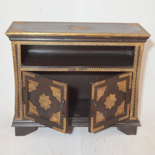 Indian Embossed Antique Brass work Solid wood Sideboard Brown Small Buffet 1m