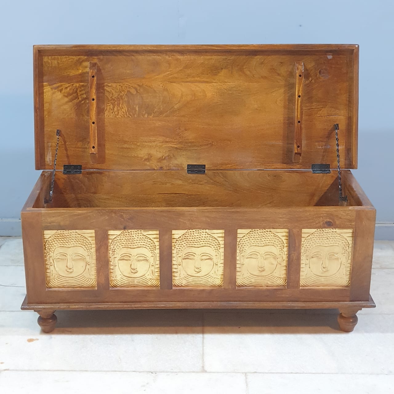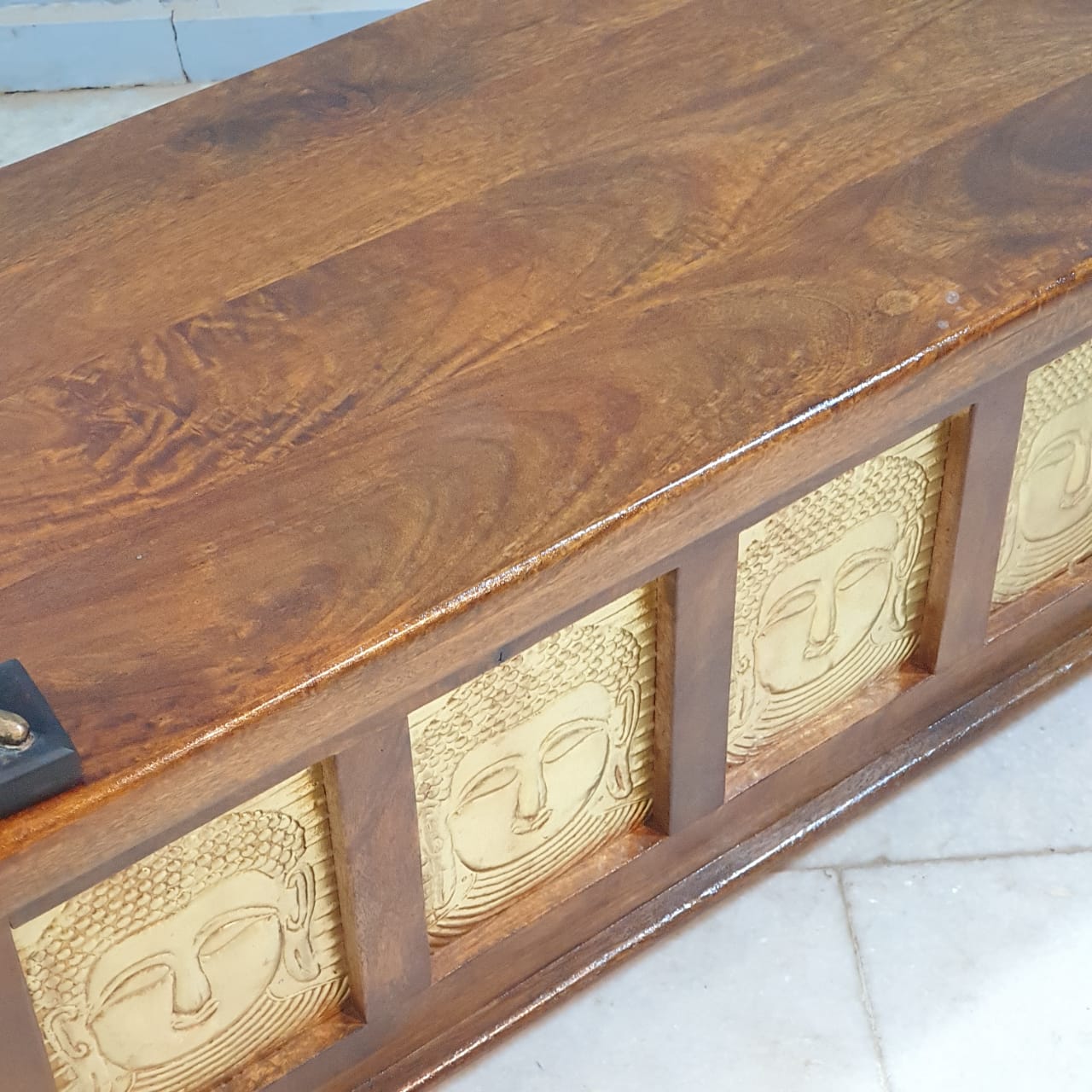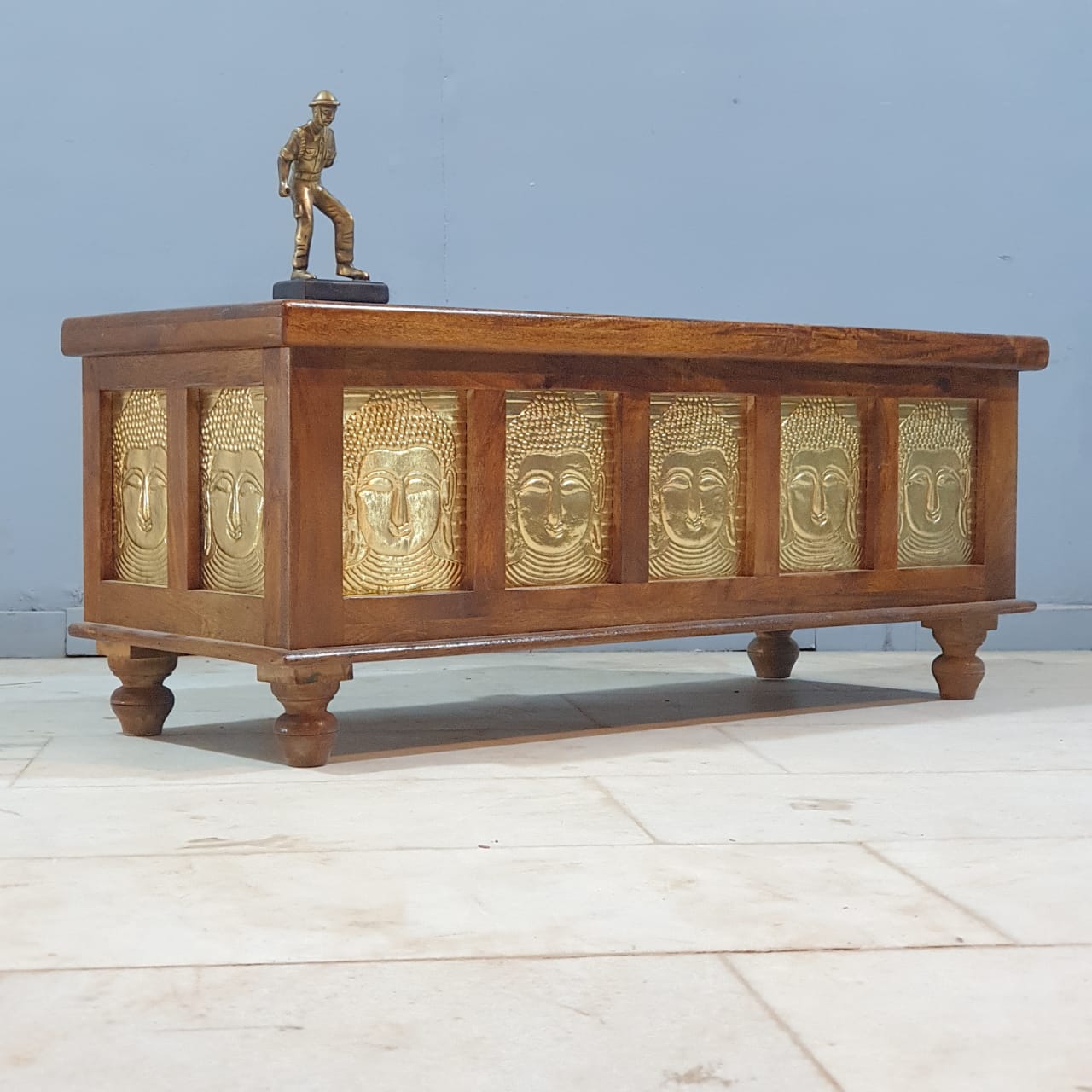 Indian Embossed Buddha Brass Work Solid Wood Blanket Box Coffee Table Chest