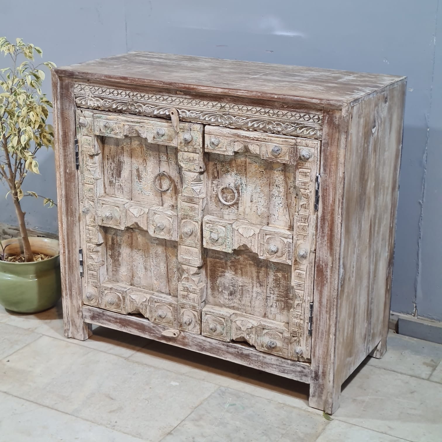 Indian Furniture Hand Carved Old Door Solid Wood Cabinet Natural 102X50X90 Cm