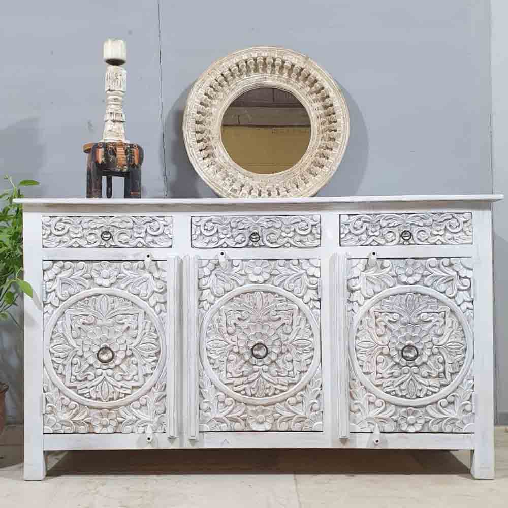 Indian Furniture Handmade Solid Wood Sideboard 3 Drawers & 3 Doors Carved Whitewash