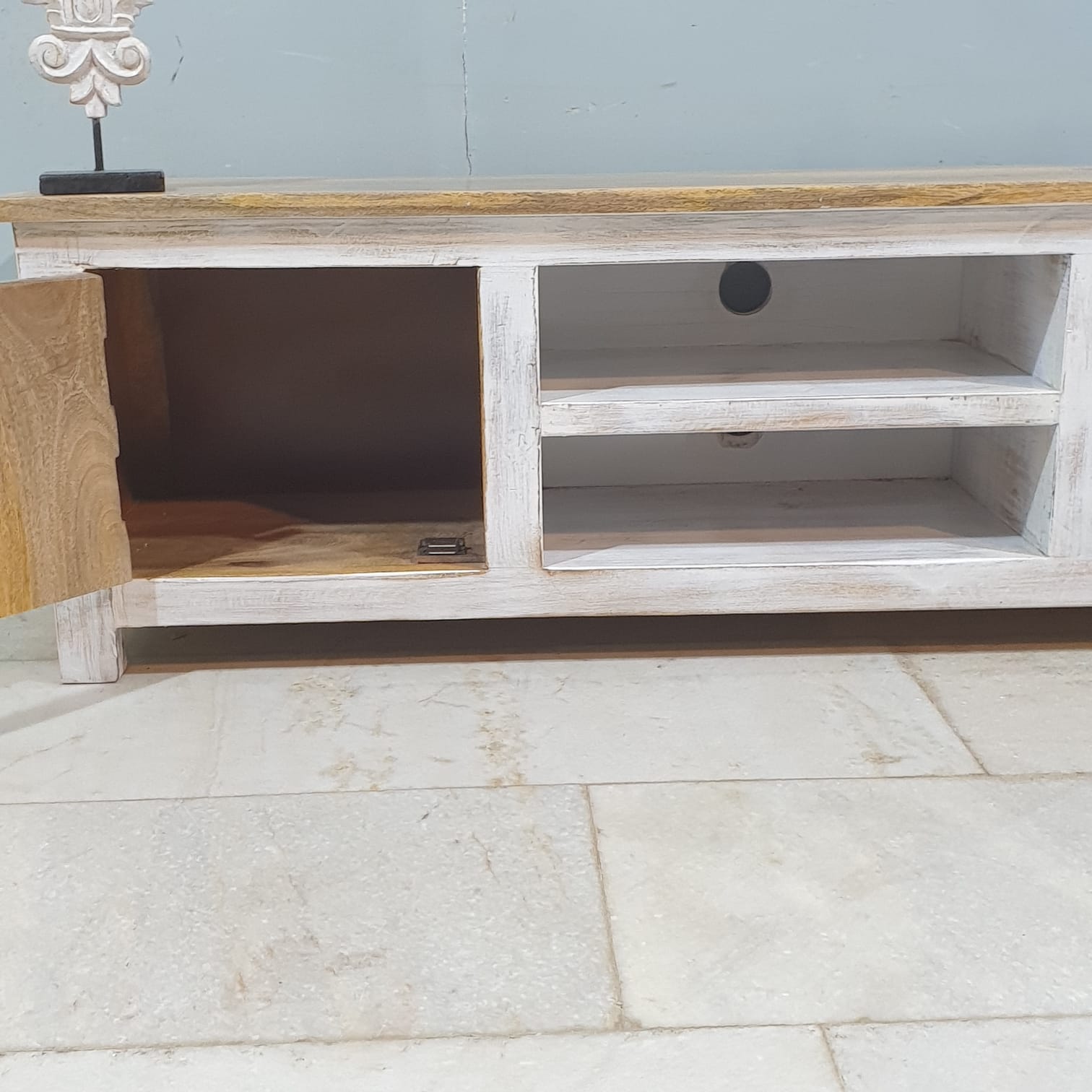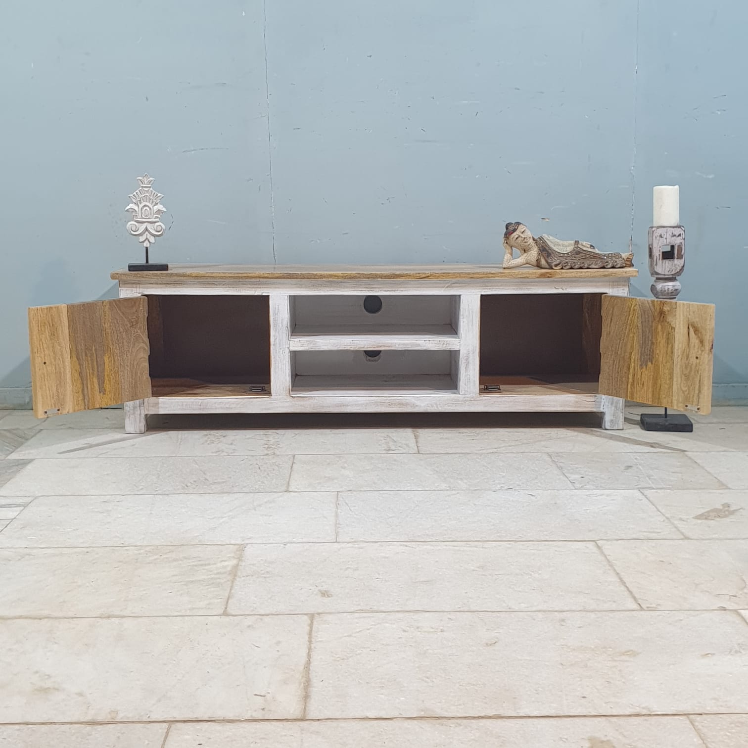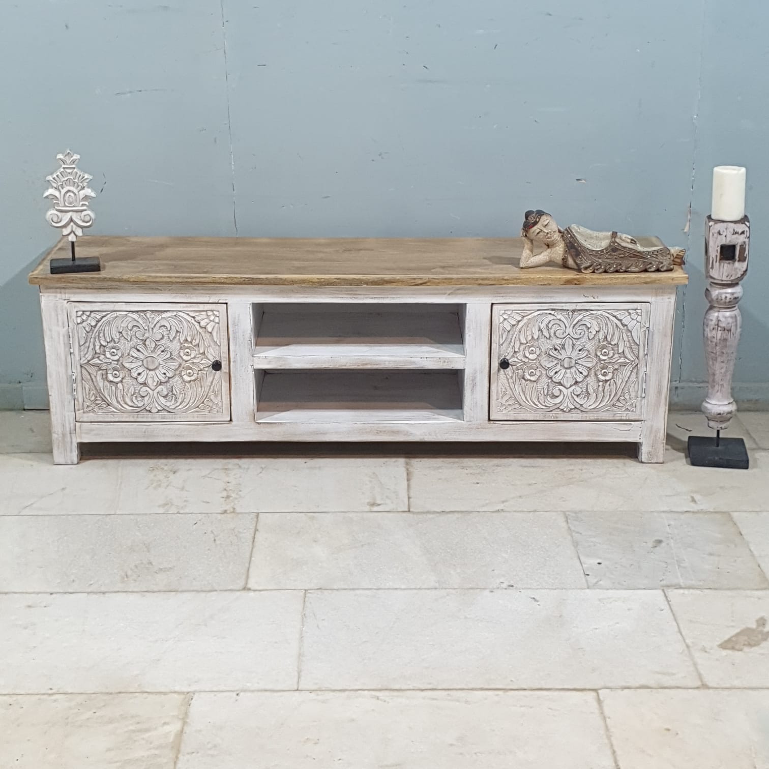 Indian Hand Carved Solid Hard Wood TV Unit with 2 Doors And Shelf 160X40X50 Cm Whitewash