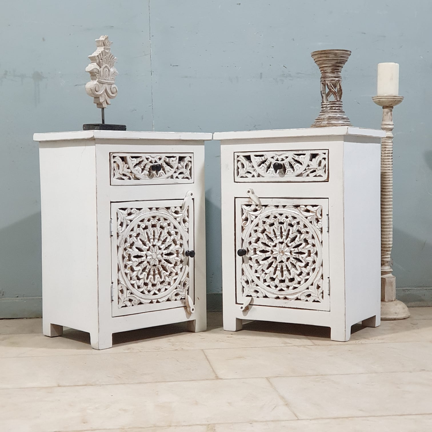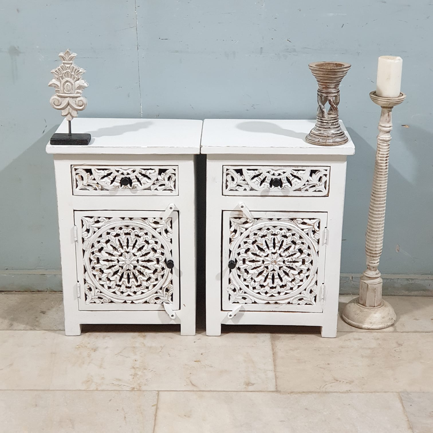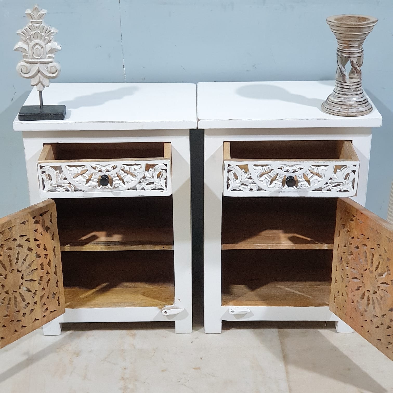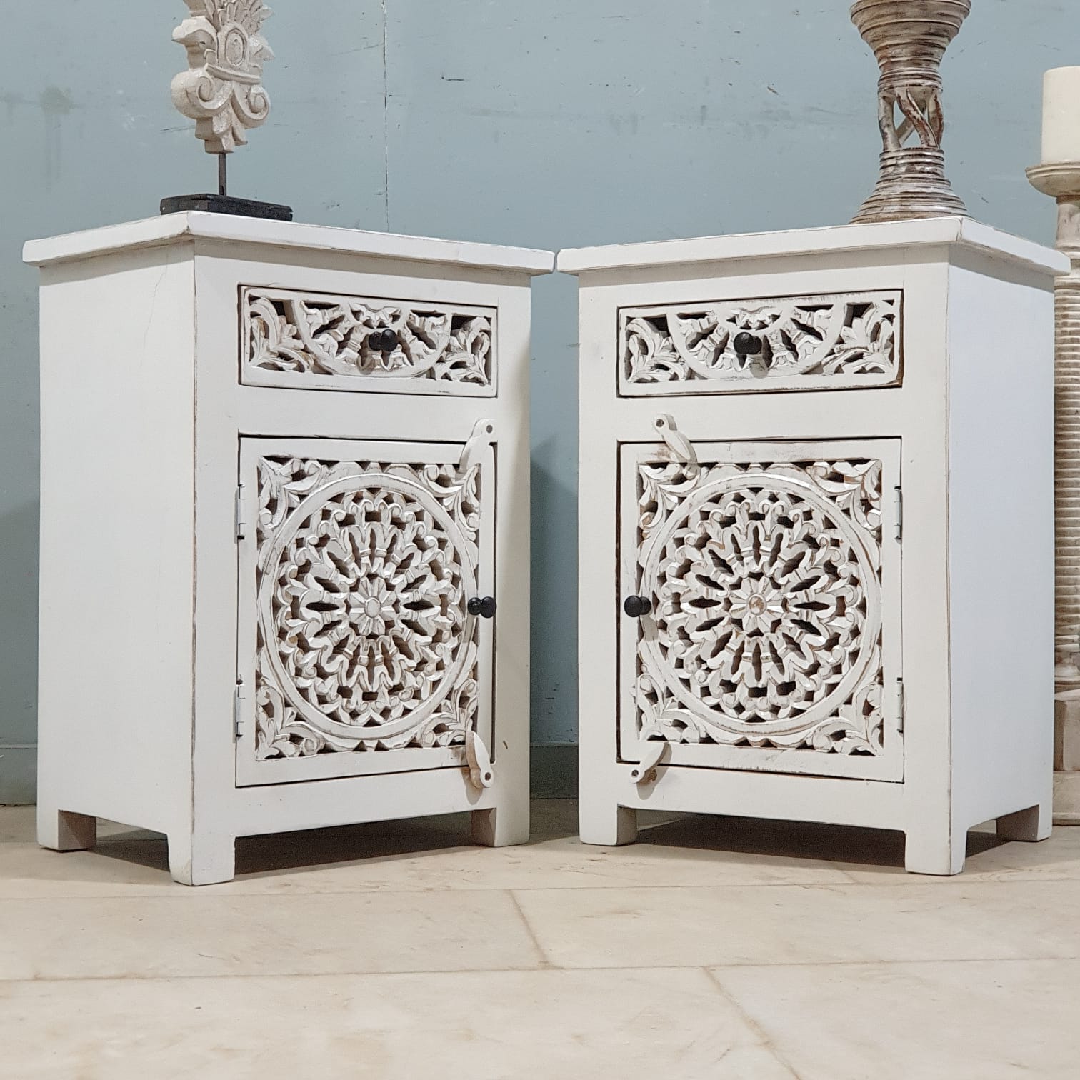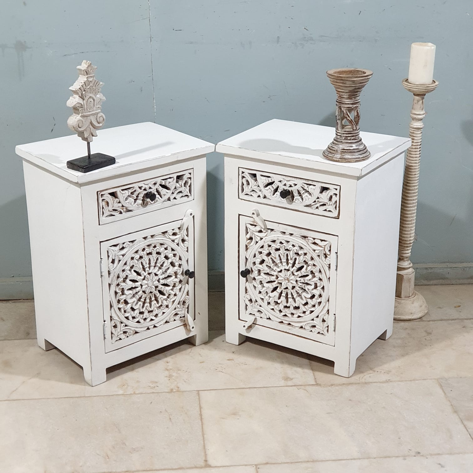 Indian Hand Carved Solid Wooden Bedside Table (Set Of 2) 48X35X68 cm White