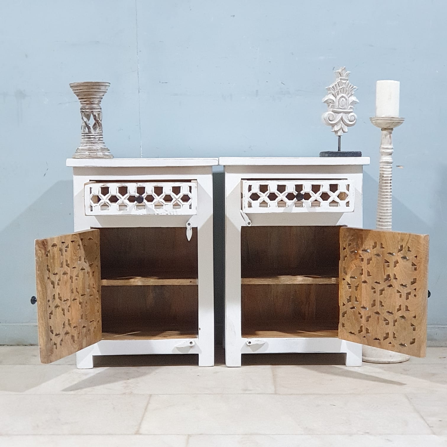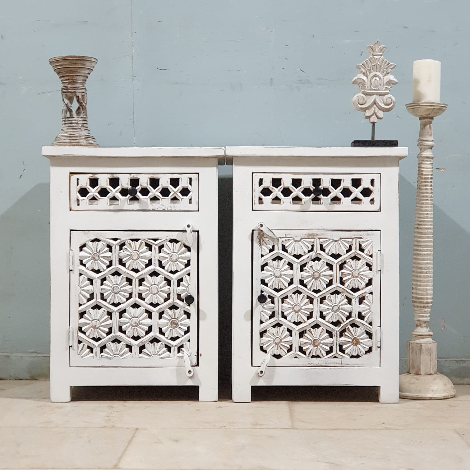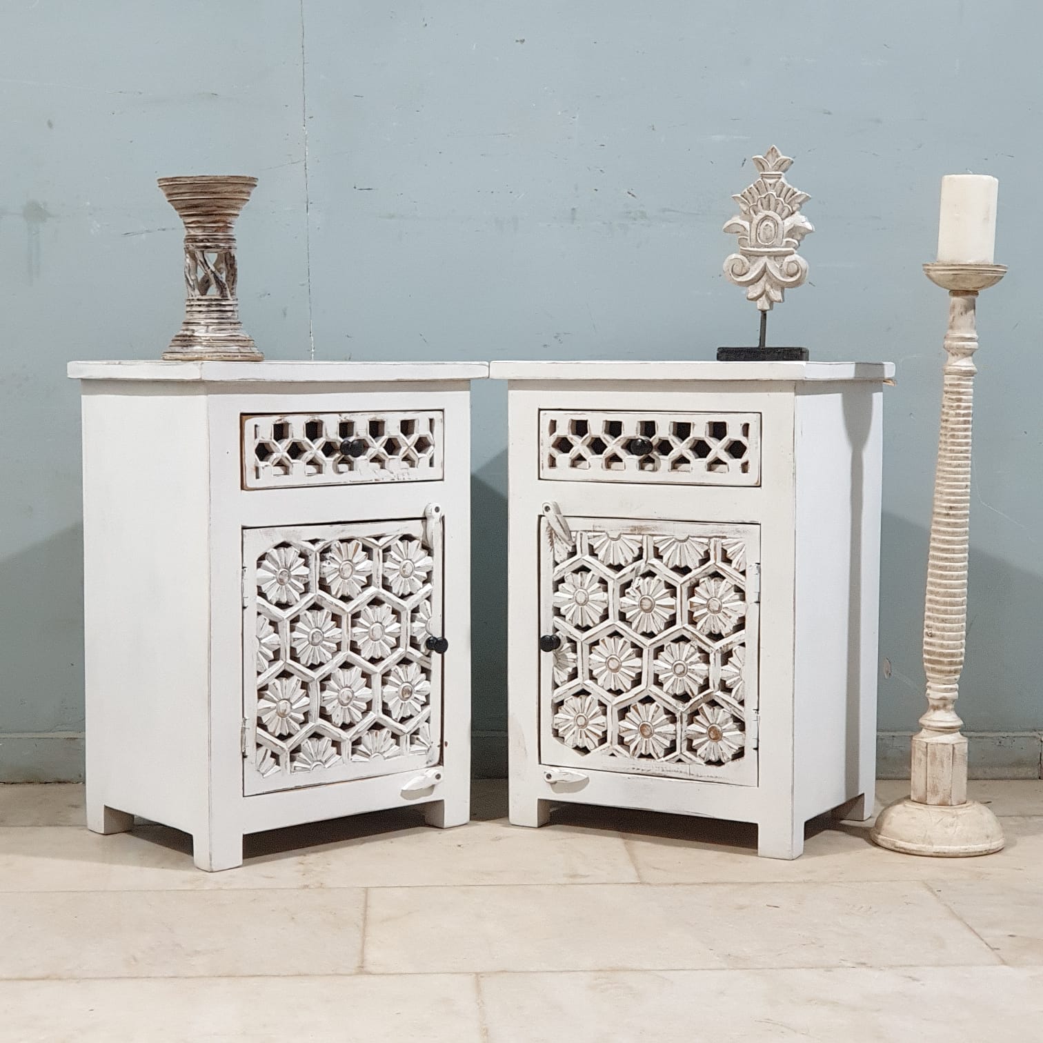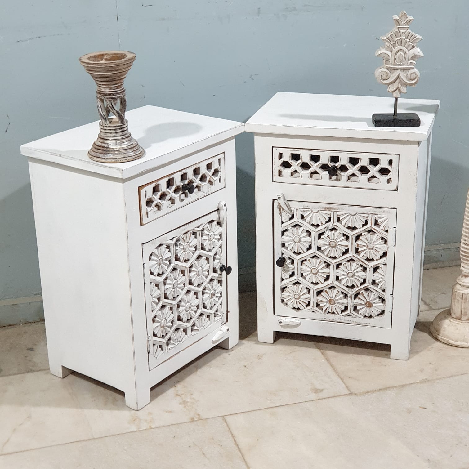 Indian Hand Carved Solid Wooden Bedside Table (Set Of 2) 48X35X68 cm White