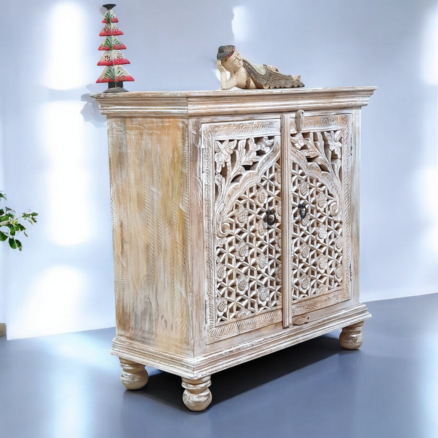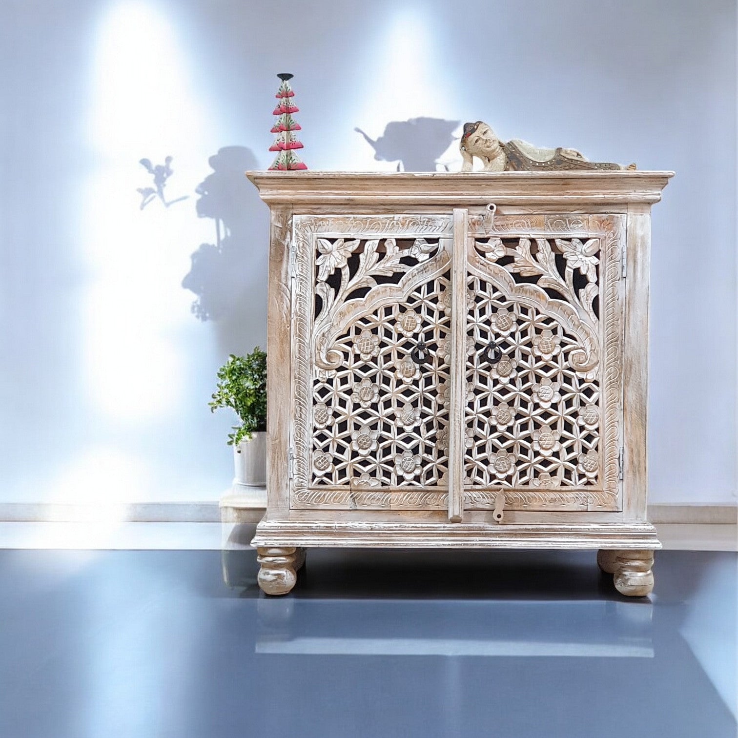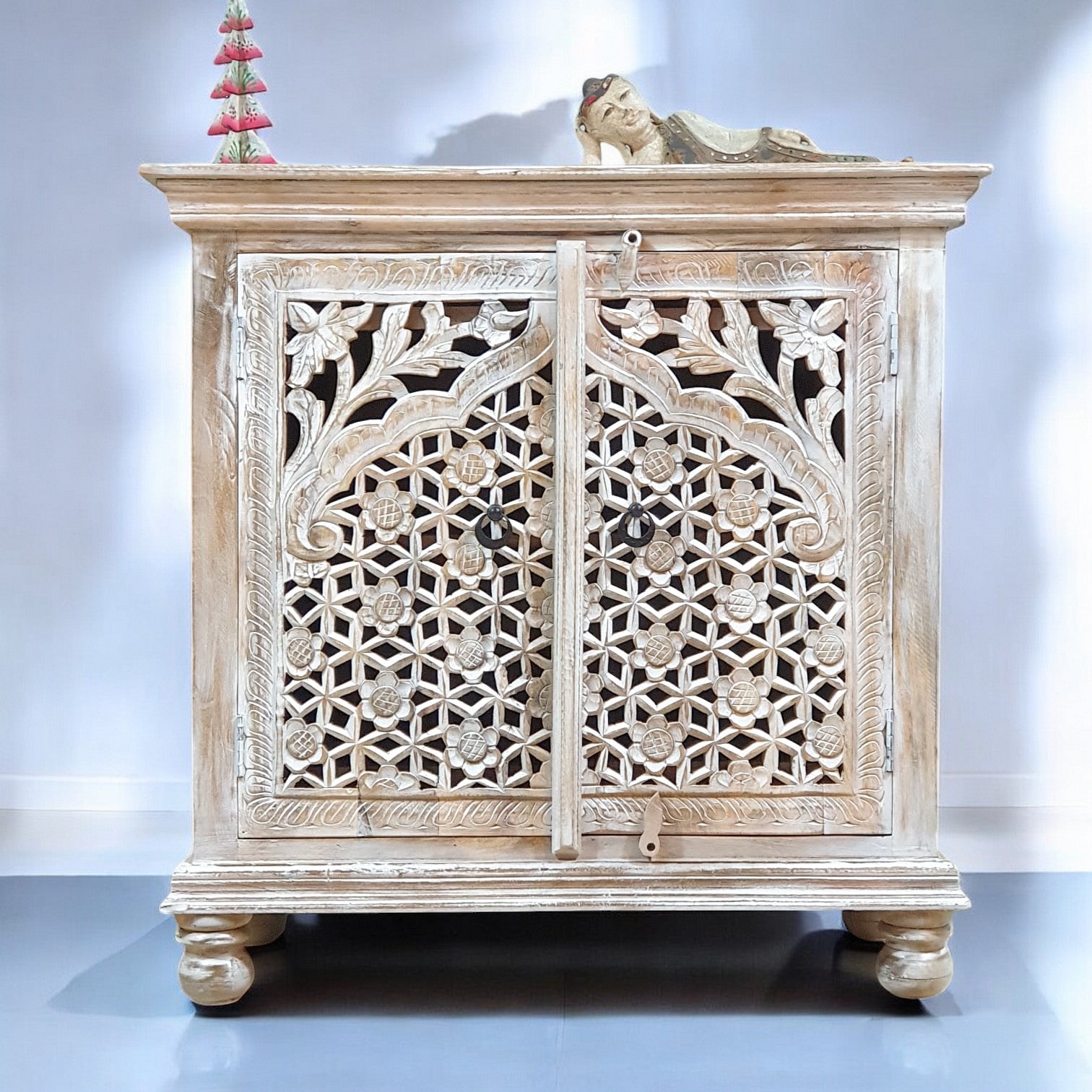 Indian Hand Carved Solid Wooden Cabinet 90x40x90cm  Whitewash 01