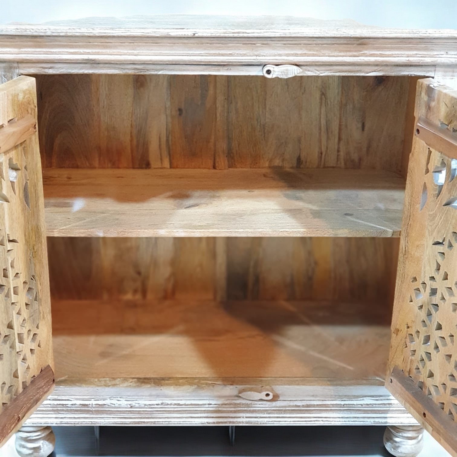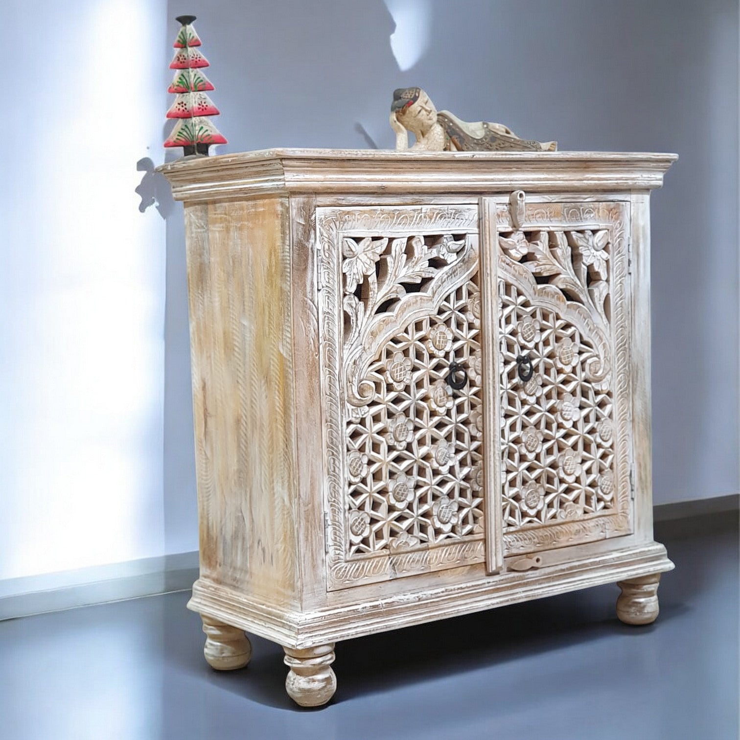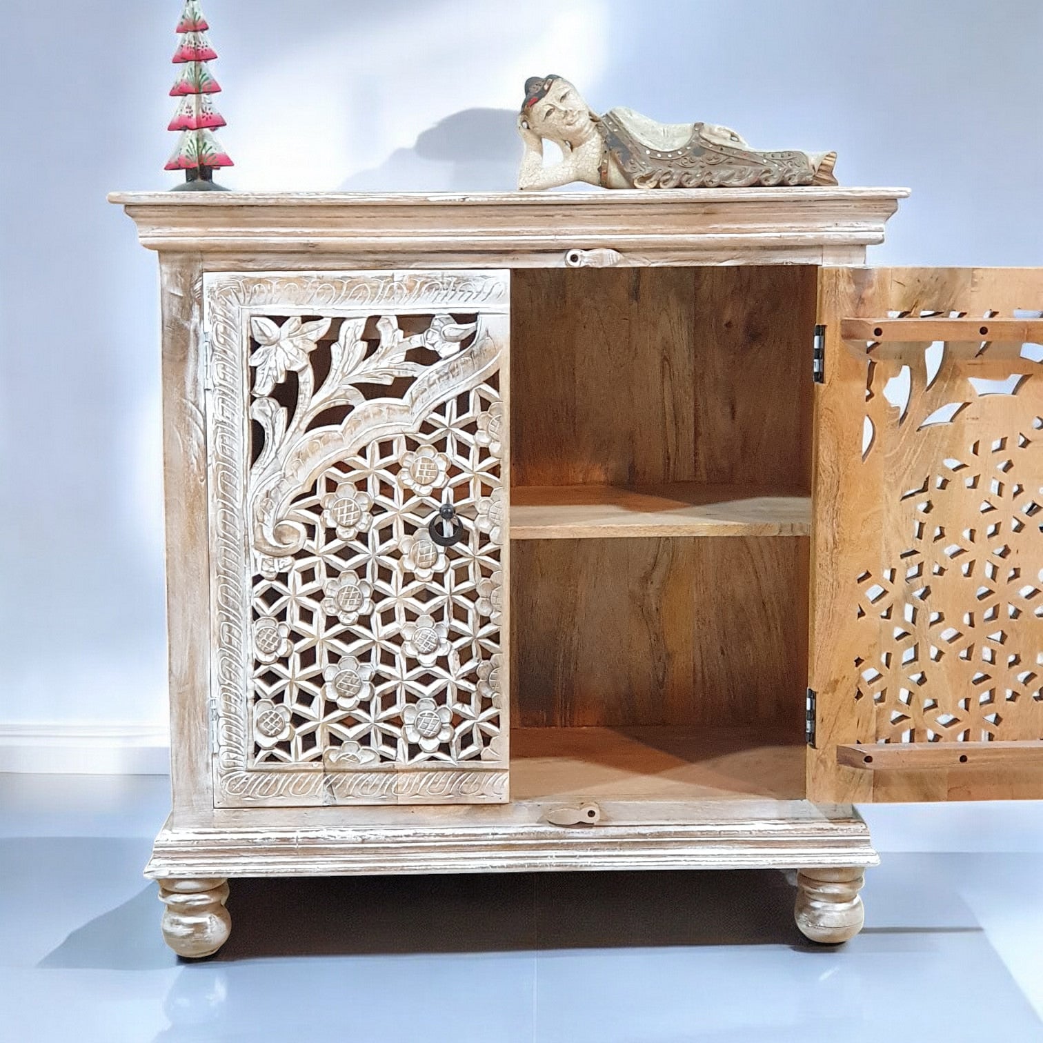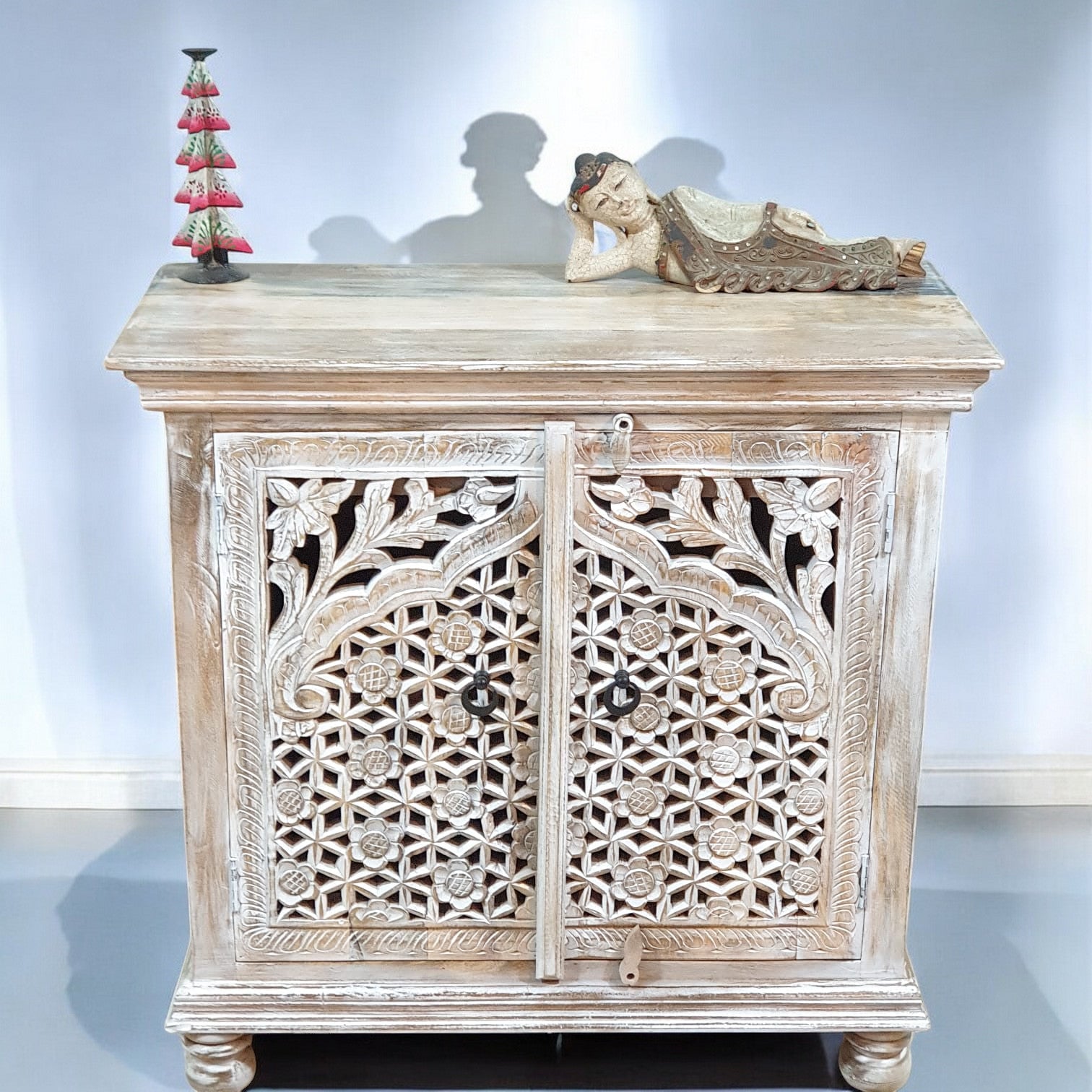 Indian Hand Carved Solid Wooden Cabinet 90x40x90cm  Whitewash 01