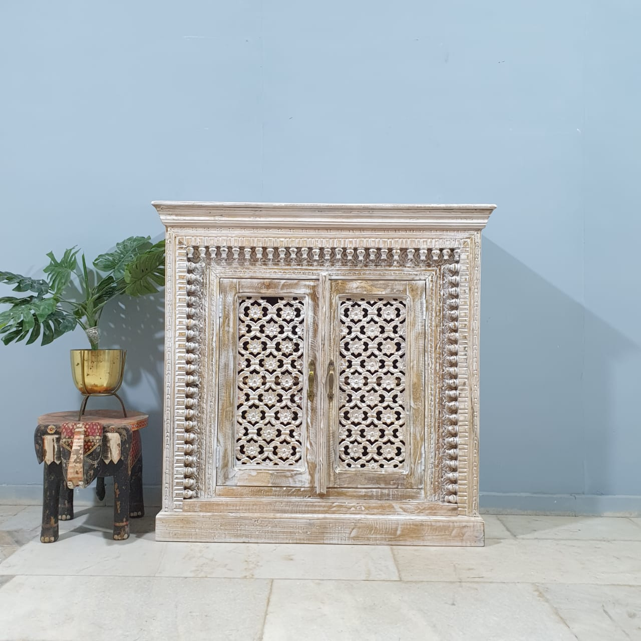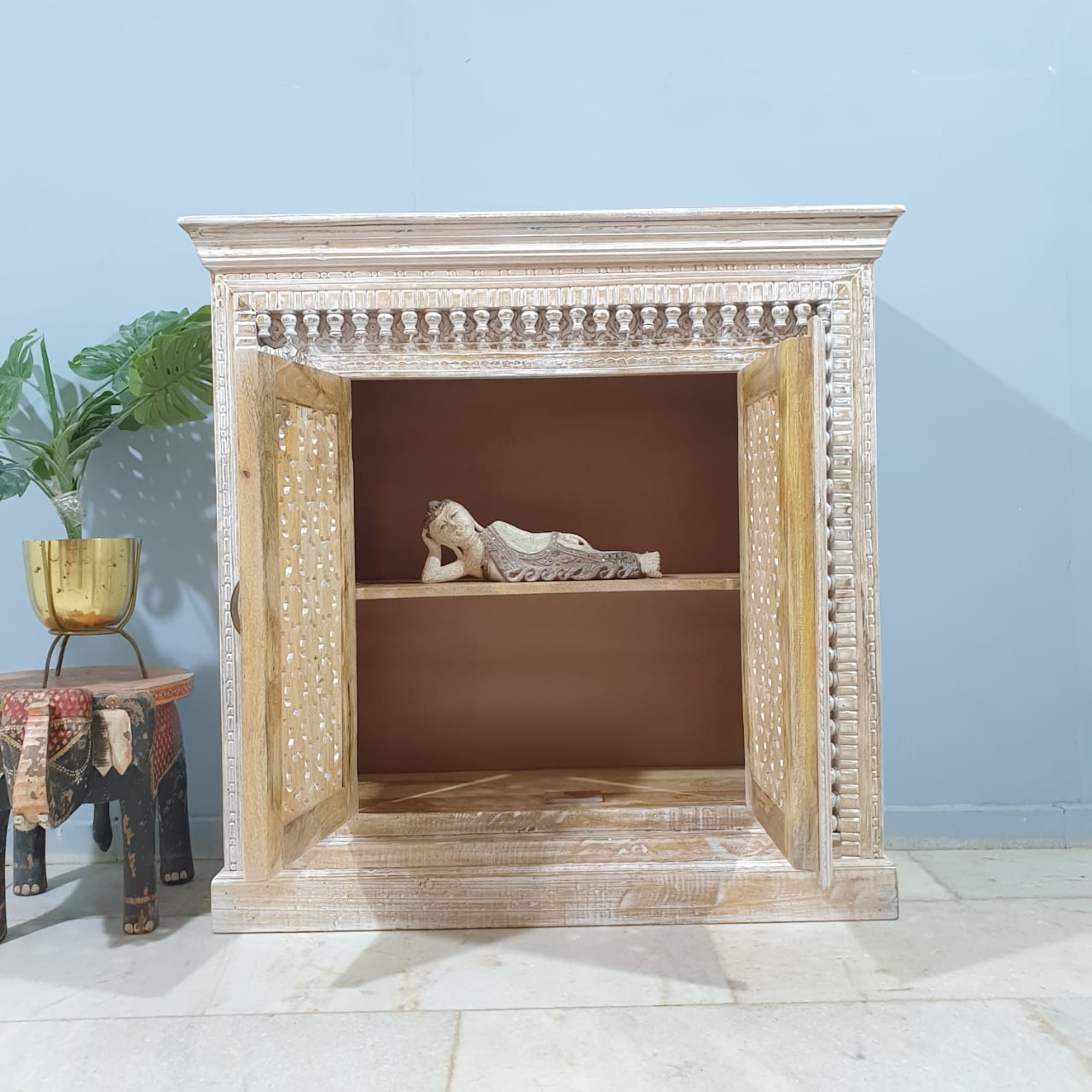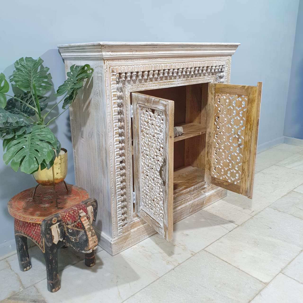 Indian Handmade Carved Solid Hard Wood Floral Design 2 Door Cabinet 110x40x110 Cm