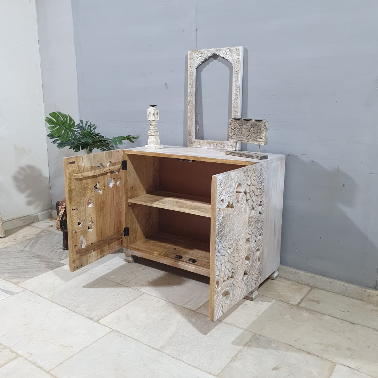 Indian Handmade Carved Solid Hard Wood Floral Design Sideboard Natural 100x40x80Cm