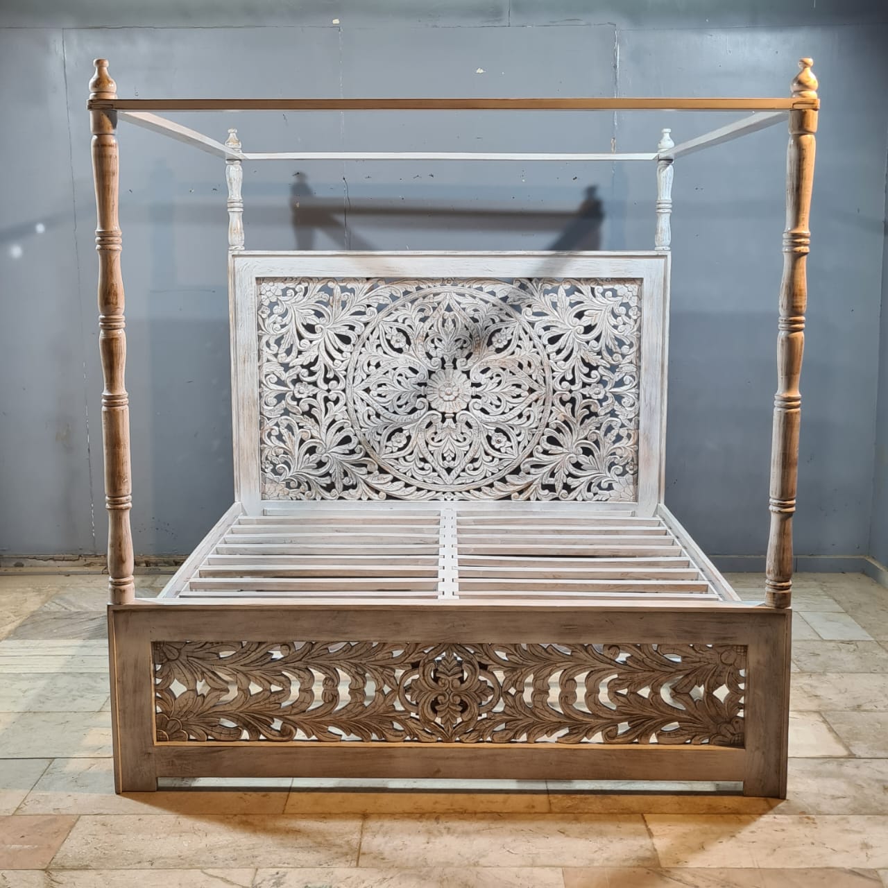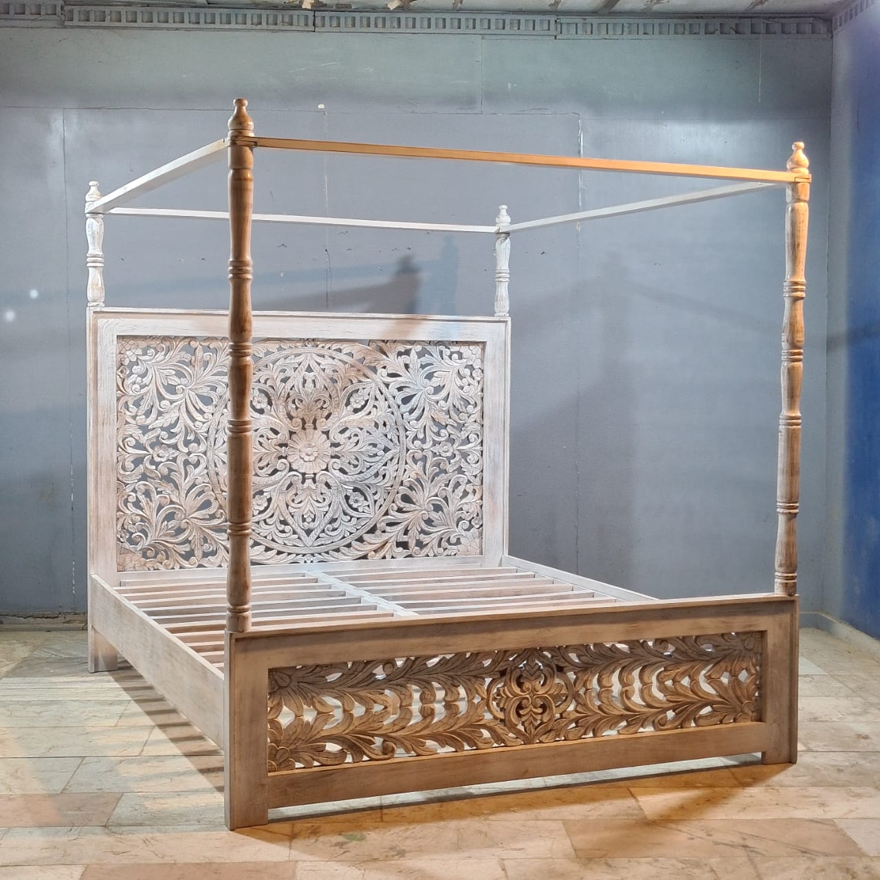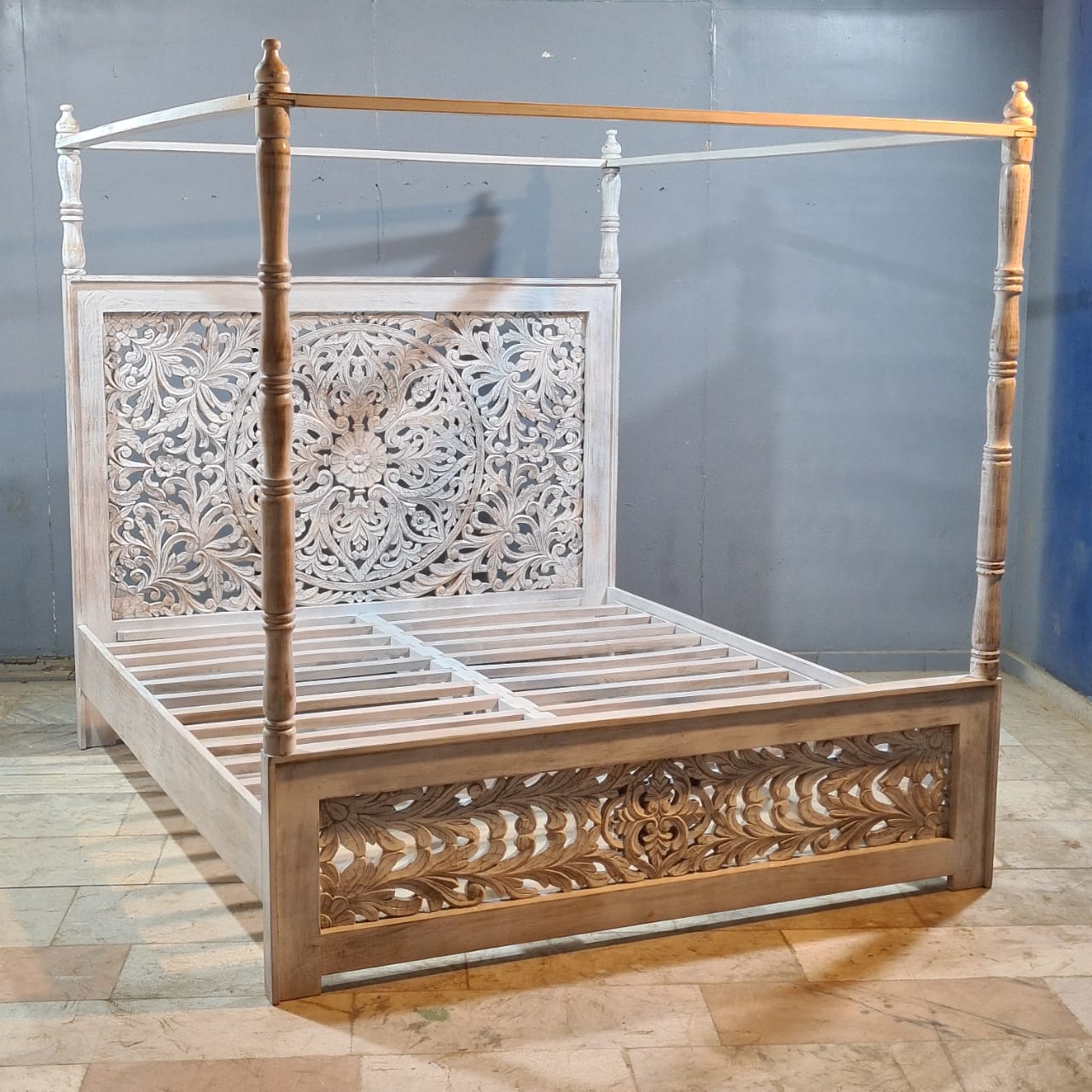 Indian Handmade Carved Solid Hard Wood King Sized Bed Frame With 4 Posters
