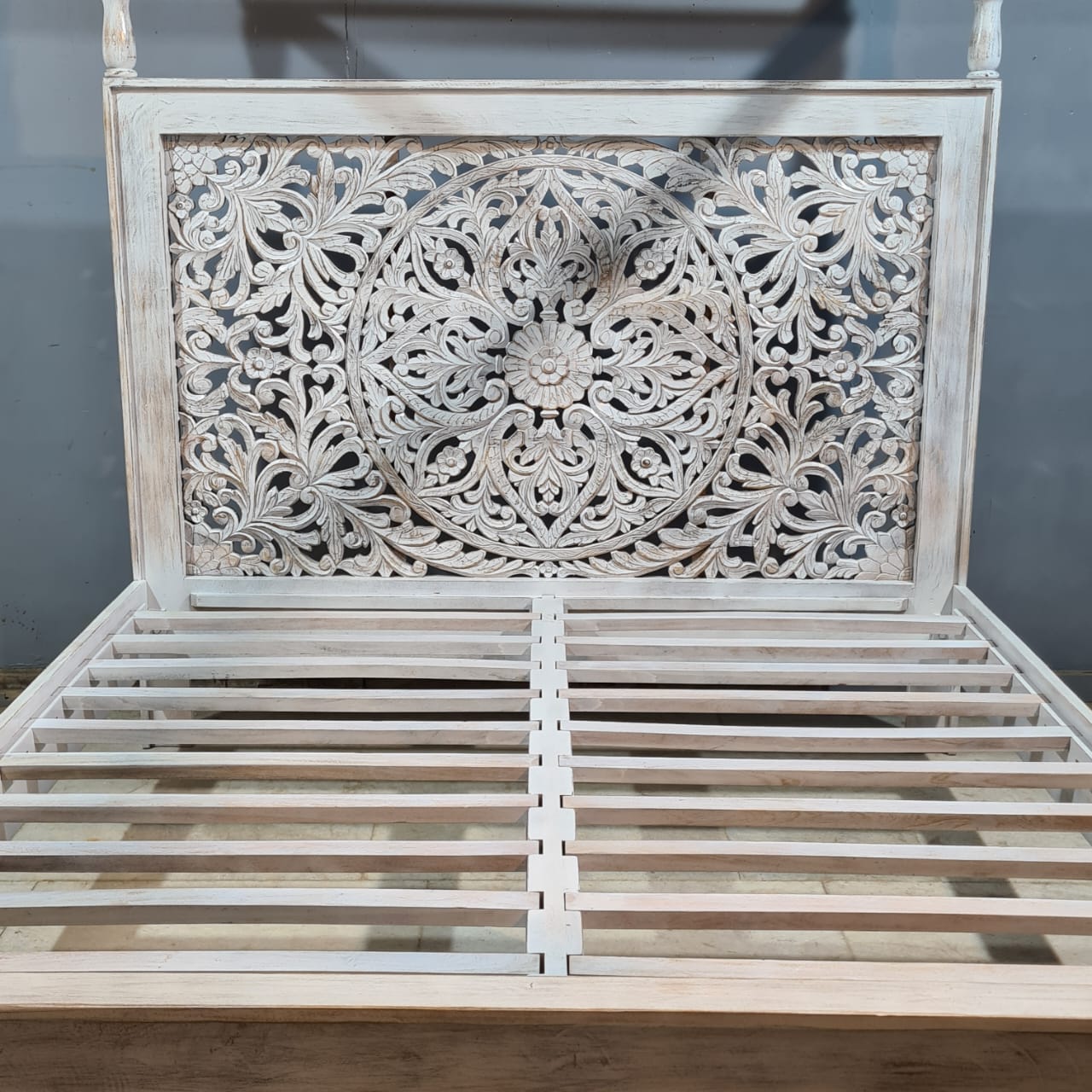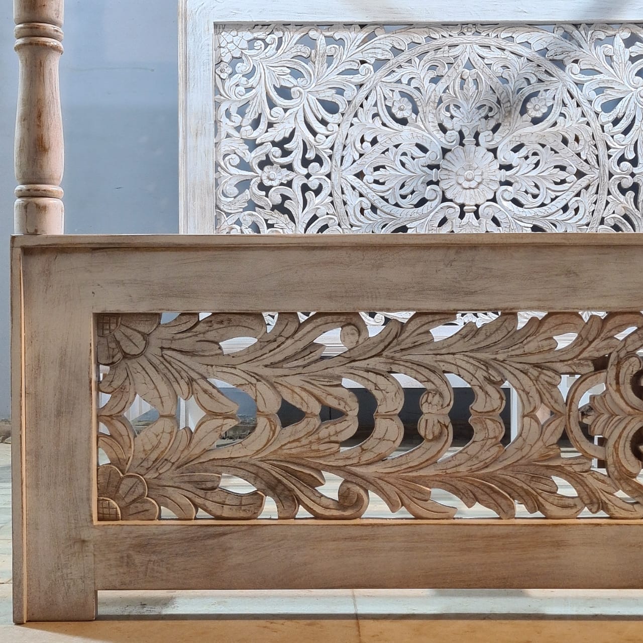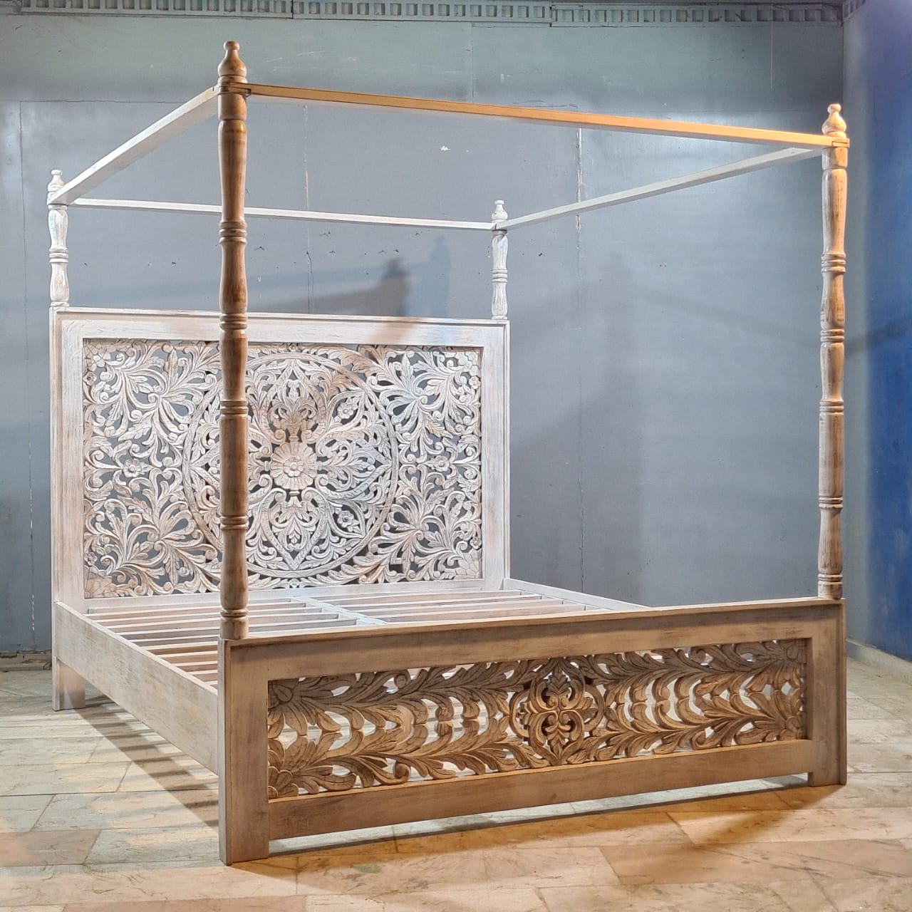 Indian Handmade Carved Solid Hard Wood King Sized Bed Frame With 4 Posters