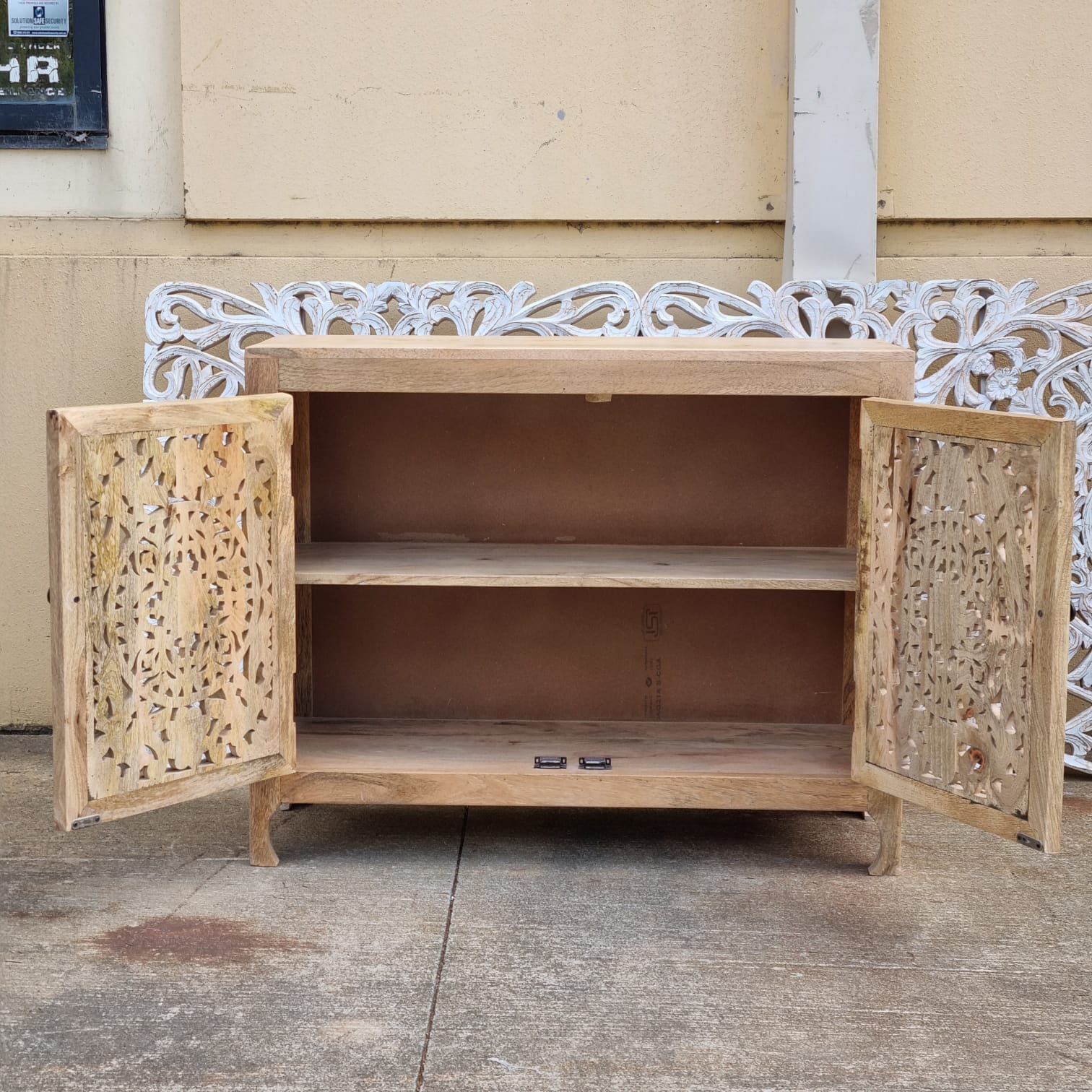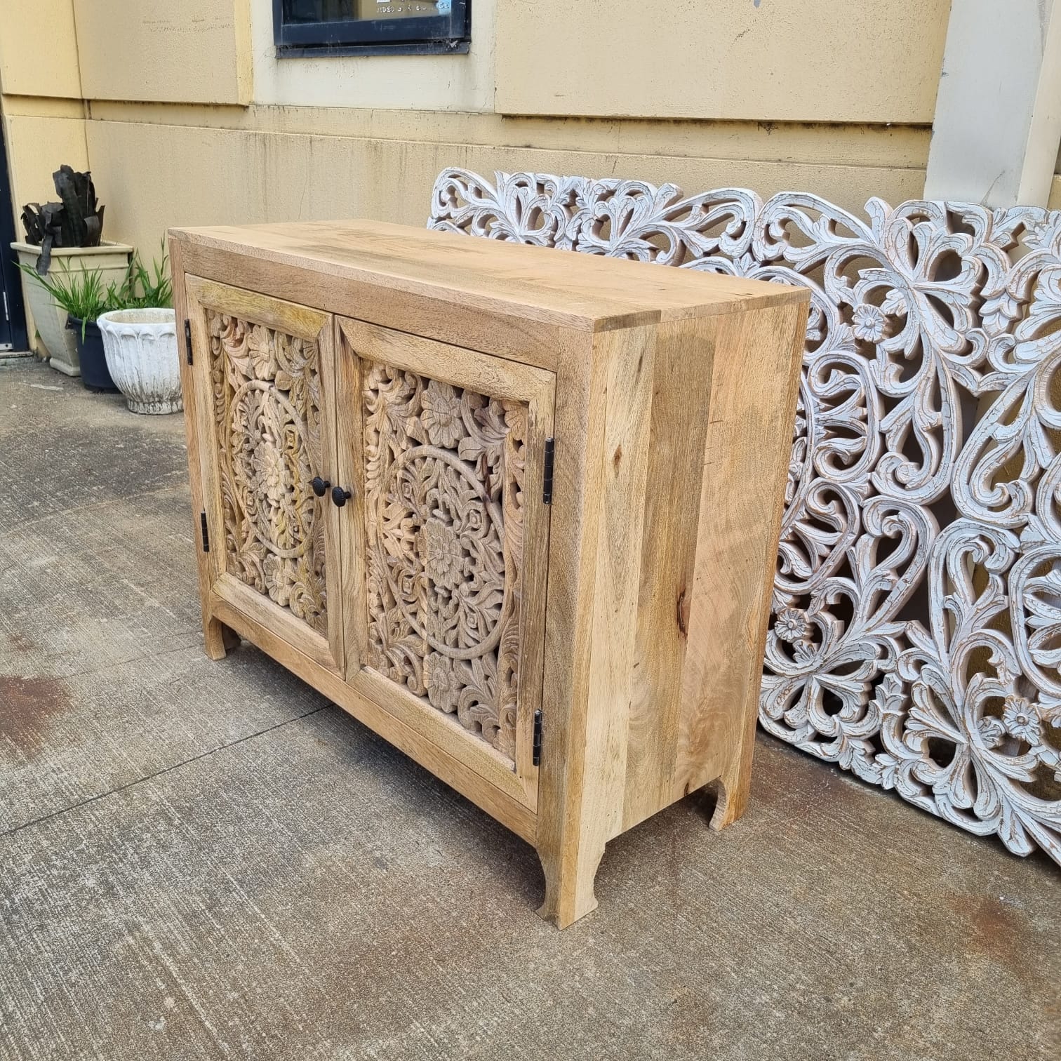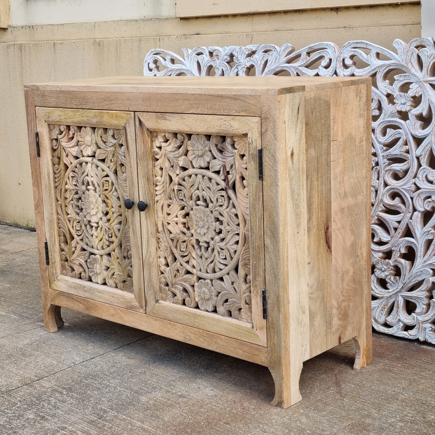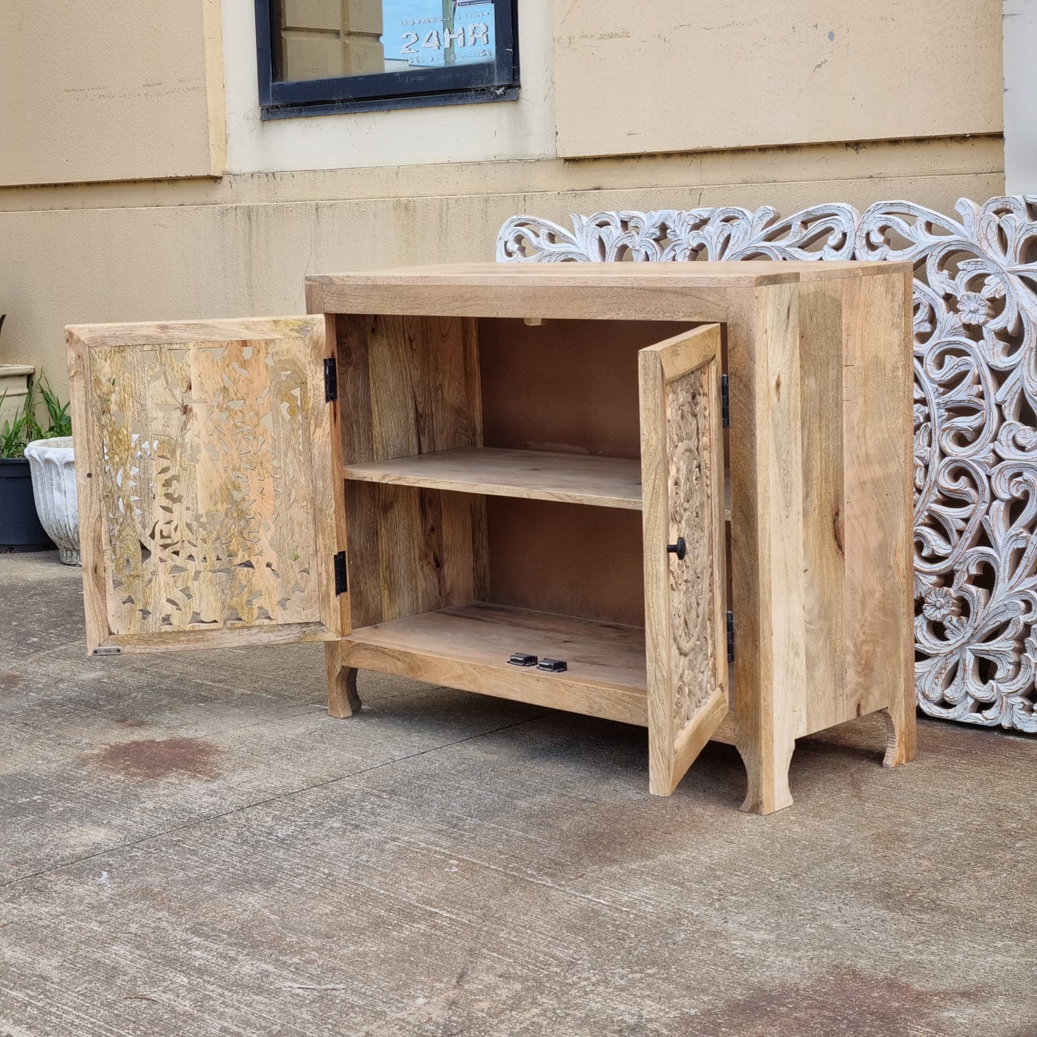 Indian Handmade Carved Wooden 2 Doors Cabinet Natural Color 100x40x80Cm