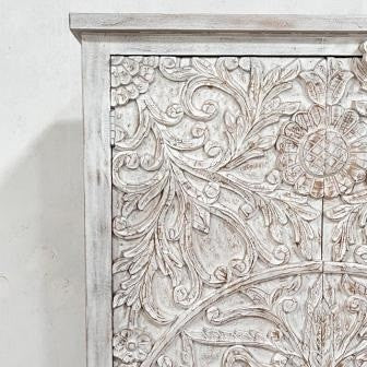 Indian Handmade Solid Hard Wood Cabinet Almirah Floral Carving in Whitewash 95x40x200Cm