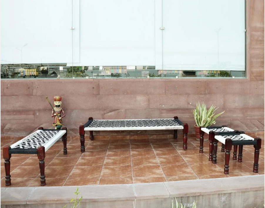 Indian Rajasthani Handmade Wooden Charpai, Bench and 2 Stools Set (Black)