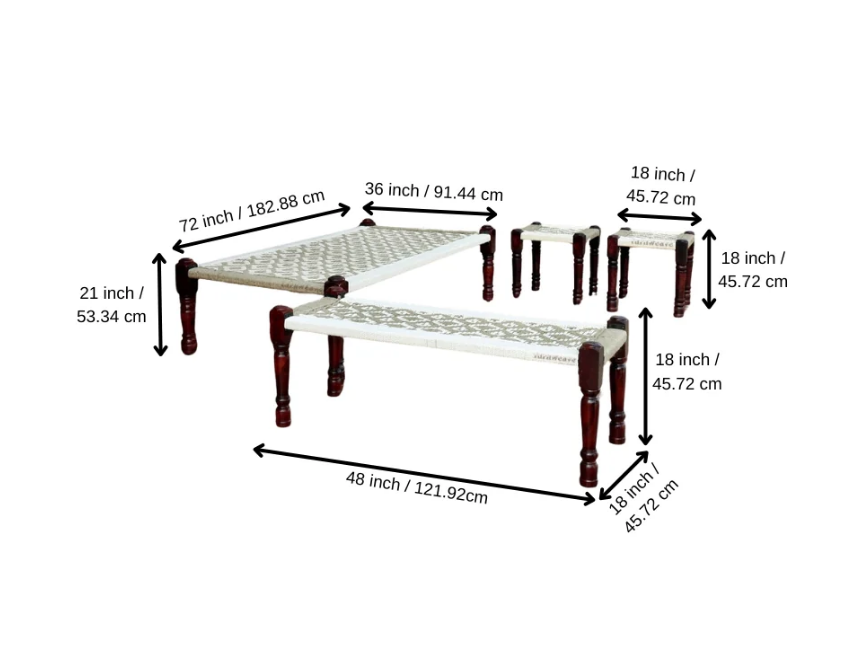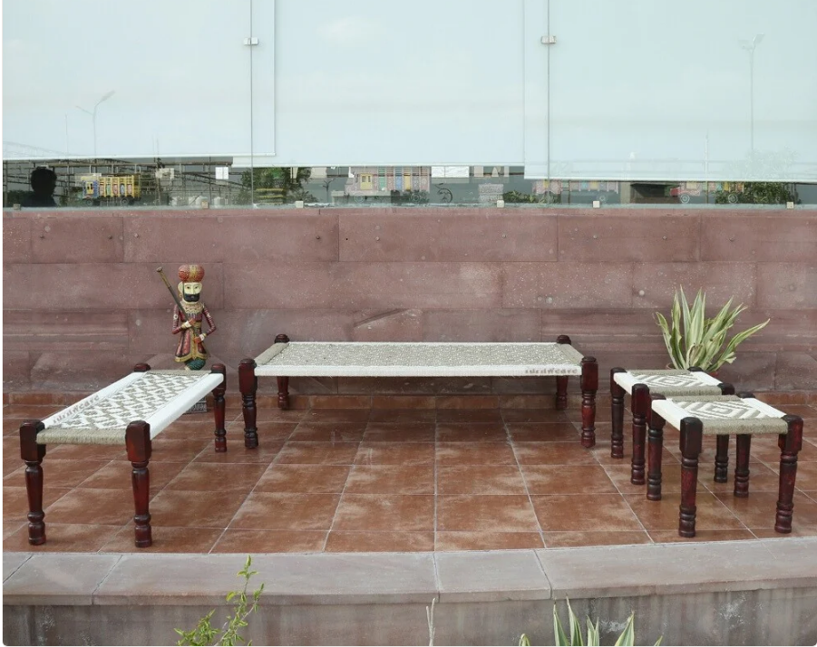 Indian Rajasthani Handmade Wooden Charpai, Bench and 2 Stools Set White