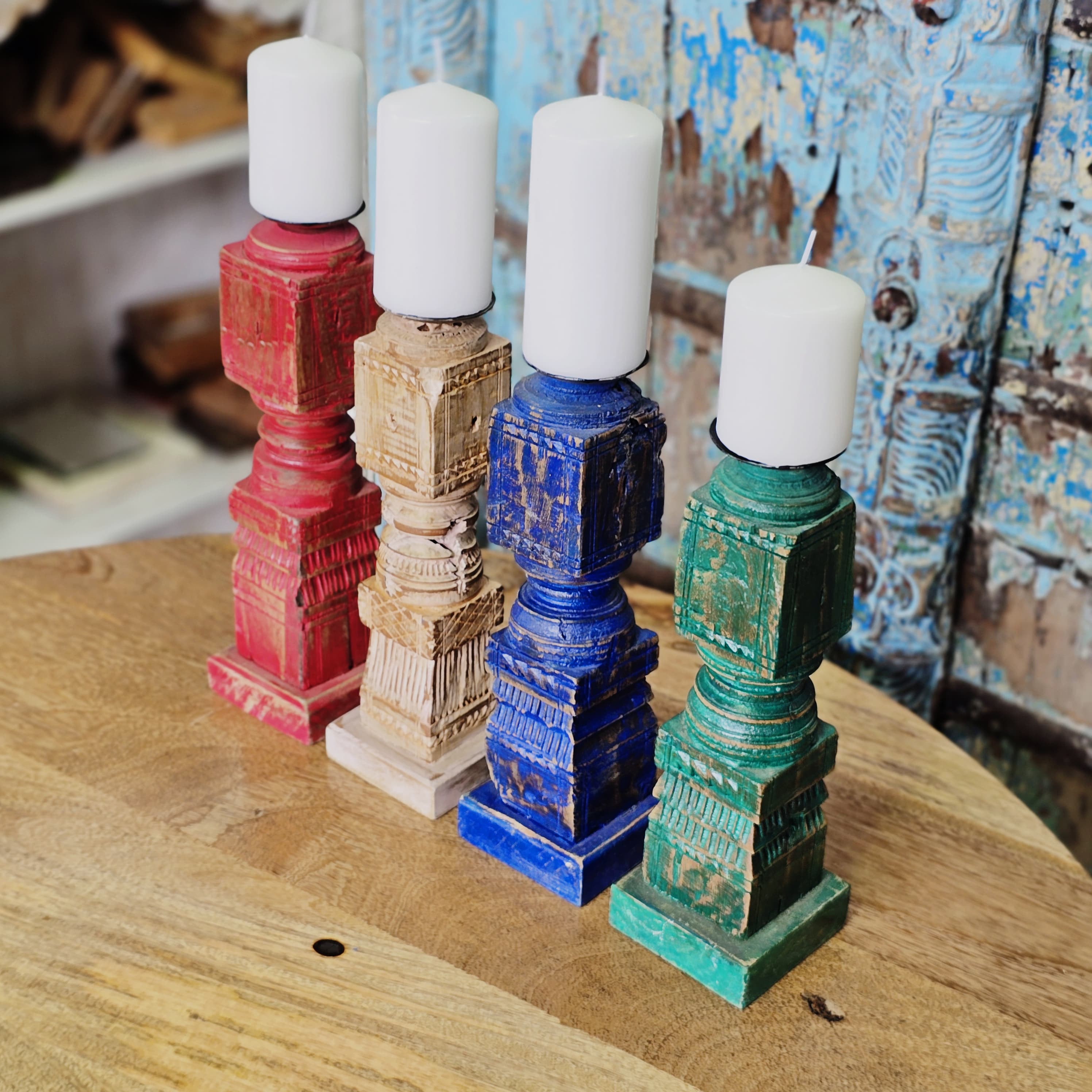Indian Wooden Vintage Pillar Candle Holder Stand (Set of 4) 110