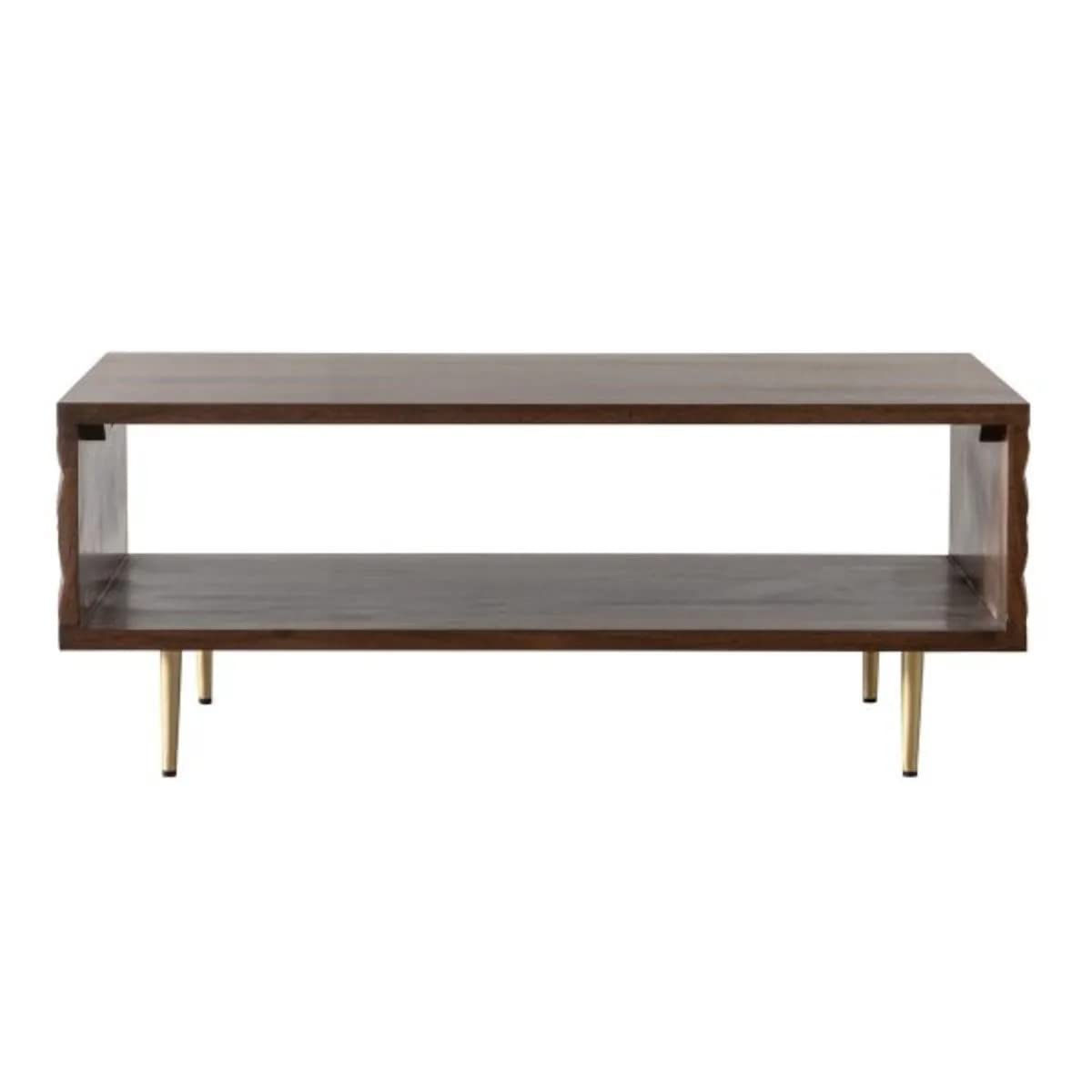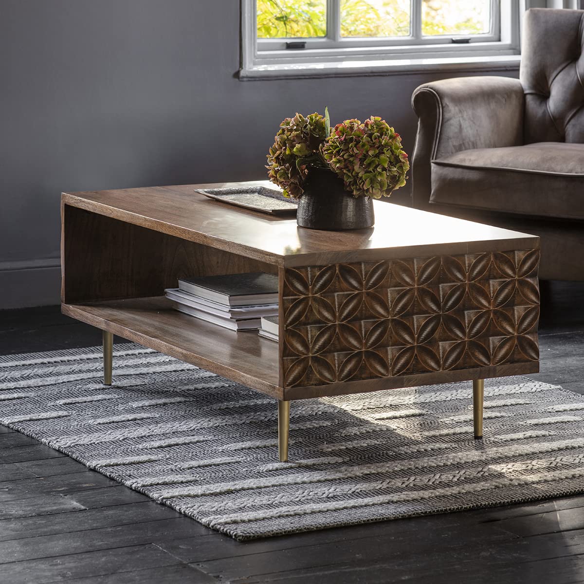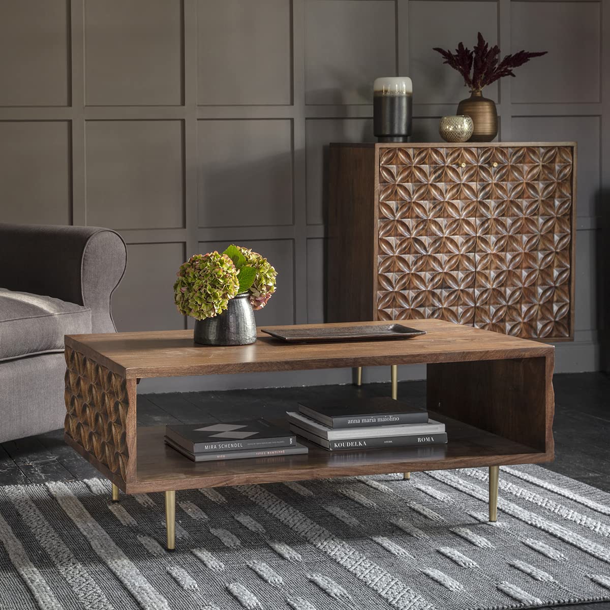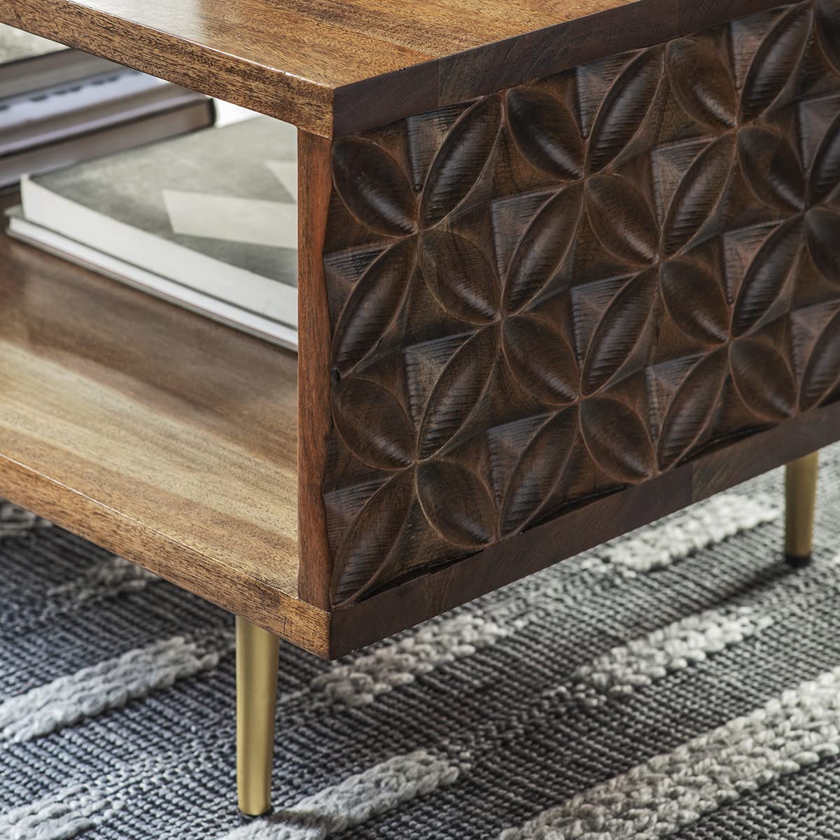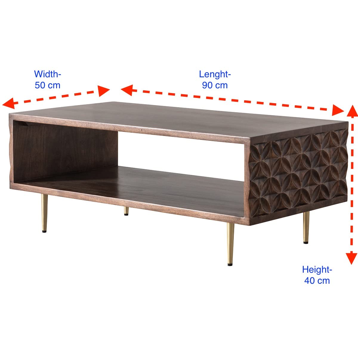 Introducing our exquisite Mango Wood Centre Table, crafted with the finest materials to bring a touch of contemporary elegance to your living space. The table is designed with beautiful flower and circular carvings on its sides, adding a unique and sophisticated touch to its overall aesthetic. The Mango Wood Centre Table features a rich walnut finish that complements the intricate carvings and brings out the natural beauty of the mango wood. The table is supported by sturdy black legs with a golden base, which provide a strong and stable foundation for the table. The table’s ample shelf space offers plenty of room for displaying decorative items, storing books and magazines, or keeping your favorite snacks and drinks close at hand. Its sleek and modern design makes it an ideal addition to any contemporary living room. With its beautiful flower and circular carvings, rich walnut finish, spacious shelf space, and sturdy black legs with golden base, our Mango Wood Centre Table is a stunning piece of furniture that will elevate the look of your living space. So why wait? Add this beautiful table to your home today and enjoy its timeless beauty for years to come!