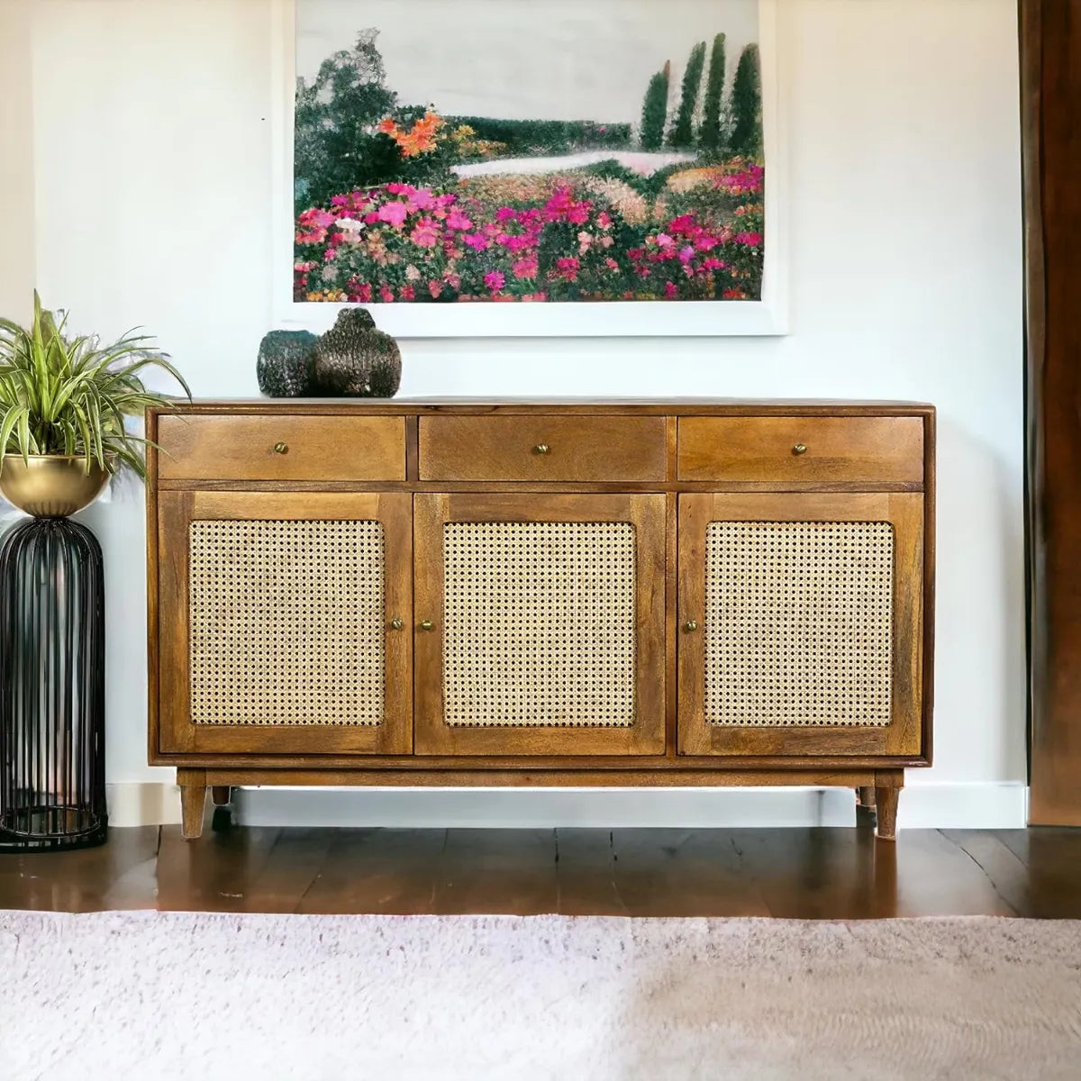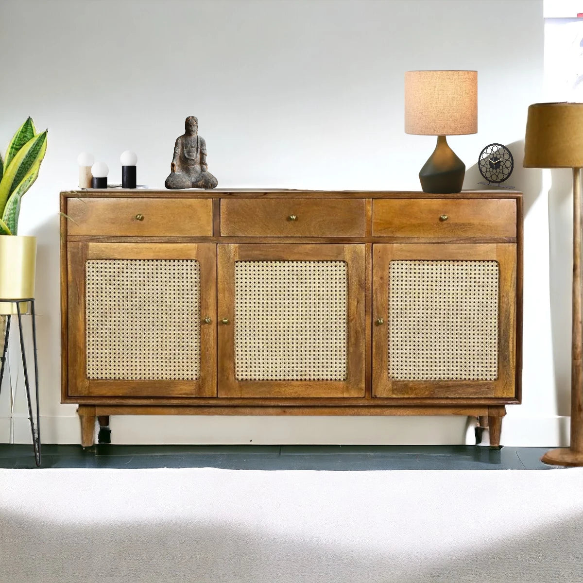 The atalanta sideboard is a versatile and stylish piece of furniture that combines modern design with classic craftsmanship. It features three spacious drawers and three cane / rattan doors that offer ample storage space for your essentials. The sideboard is finished in a warm brown colour that complements any decor. The atalanta sideboard is ideal for your living room, dining room, or hallway, as it adds a touch of elegance and charm to your space. Whether you use it to display your favourite items, store your books and magazines, or organize your tableware, the atalanta sideboard will enhance your home with its beauty and functionality