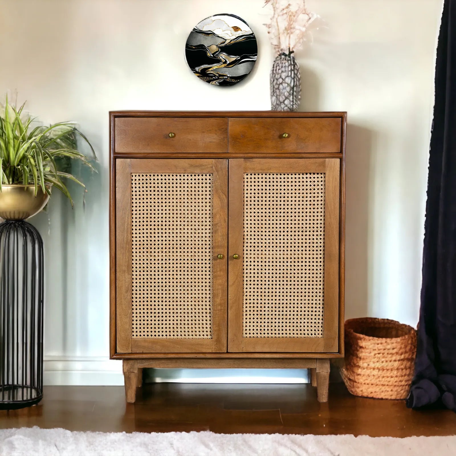 Introducing the Atalanta Sideboard, a symbol of natural beauty and functional elegance. Crafted from the finest mango wood, this sideboard is a testament to the artistry of woodworking. Its warm and inviting light brown finish enhances the wood’s natural grain, creating a piece that’s both visually pleasing and practical. The Atalanta Sideboard features two exquisite cane doors, adding a touch of rustic charm to its design. These doors allow for discreet storage while showcasing the delicate craftsmanship of the cane weave. Additionally, two drawers offer convenient space for organizing your belongings, making it a versatile storage solution for any room in your home. With its understated yet sophisticated appearance, the Atalanta Sideboard effortlessly complements various interior styles, from classic to contemporary. Elevate your living space with this piece of functional artistry, where timeless design meets the warmth of mango wood and the allure of cane, making it a true focal point in your home.