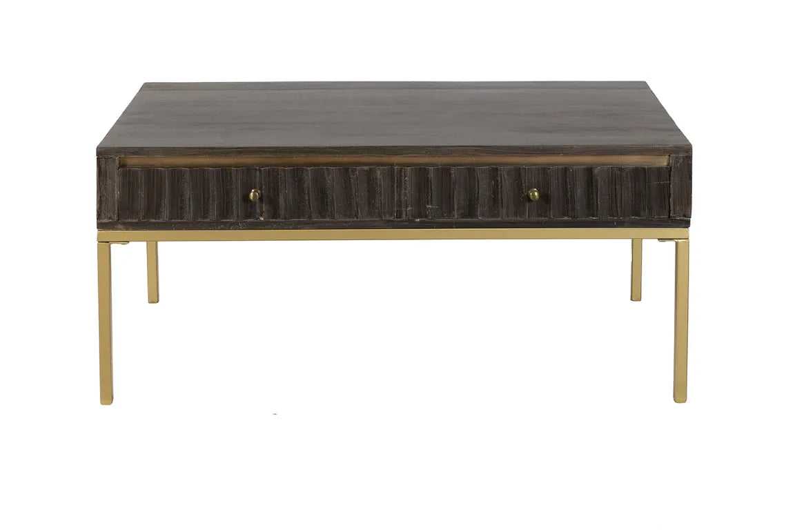 Add the wow factor to the living area with our new Mylan Coffee Table. Crafted from Mango wood with a contrasting gold legs, it’s stunning as well as practical with two handy drawers to keep all those essentials you don’t necessarily want on display. The brass on top of the drawers is given an antique look and adds a touch of luxury to your living space. The fluted design is carving done on CNC machine to bring out contemporary charm while the tobacco brown finish is ideal for a modern decor setup.