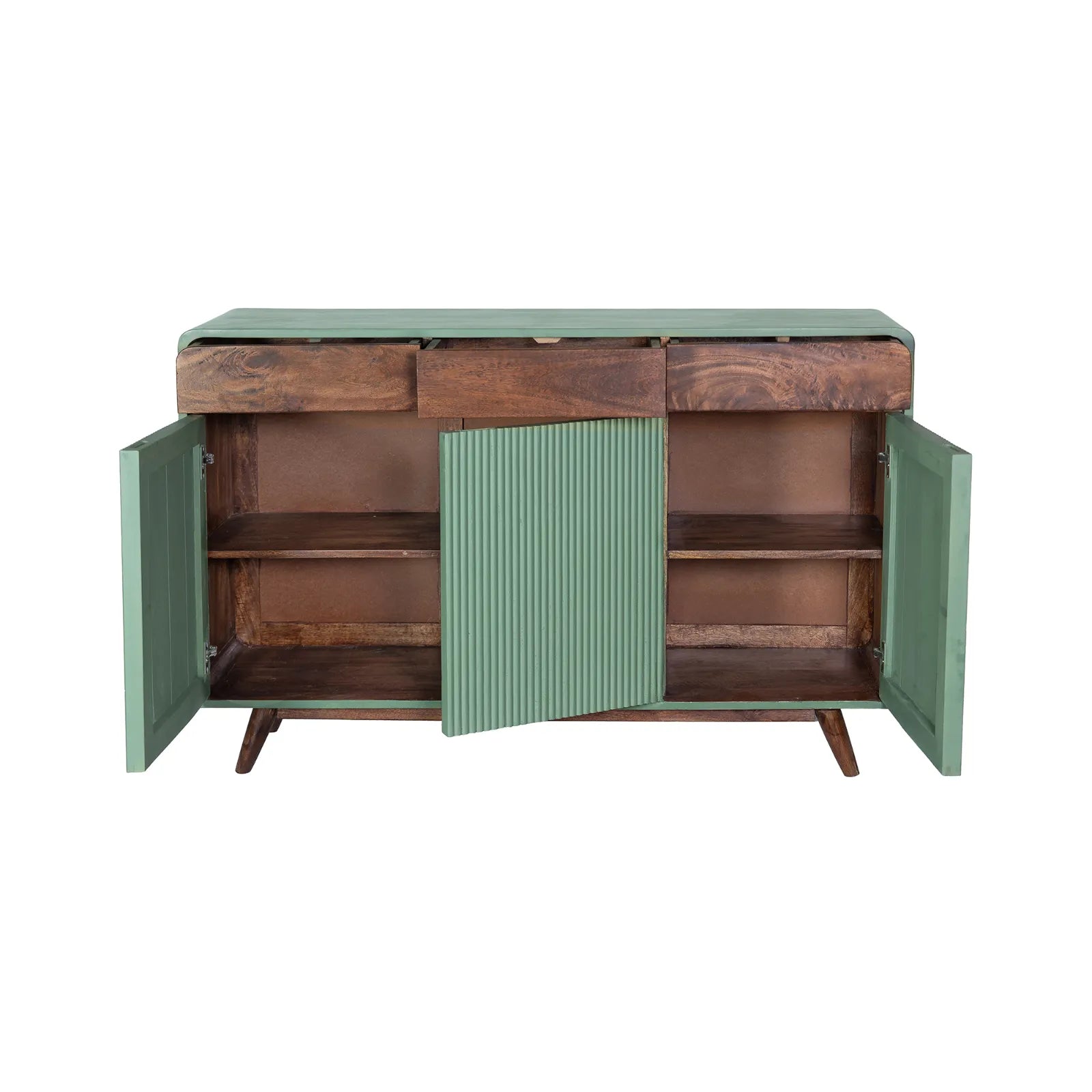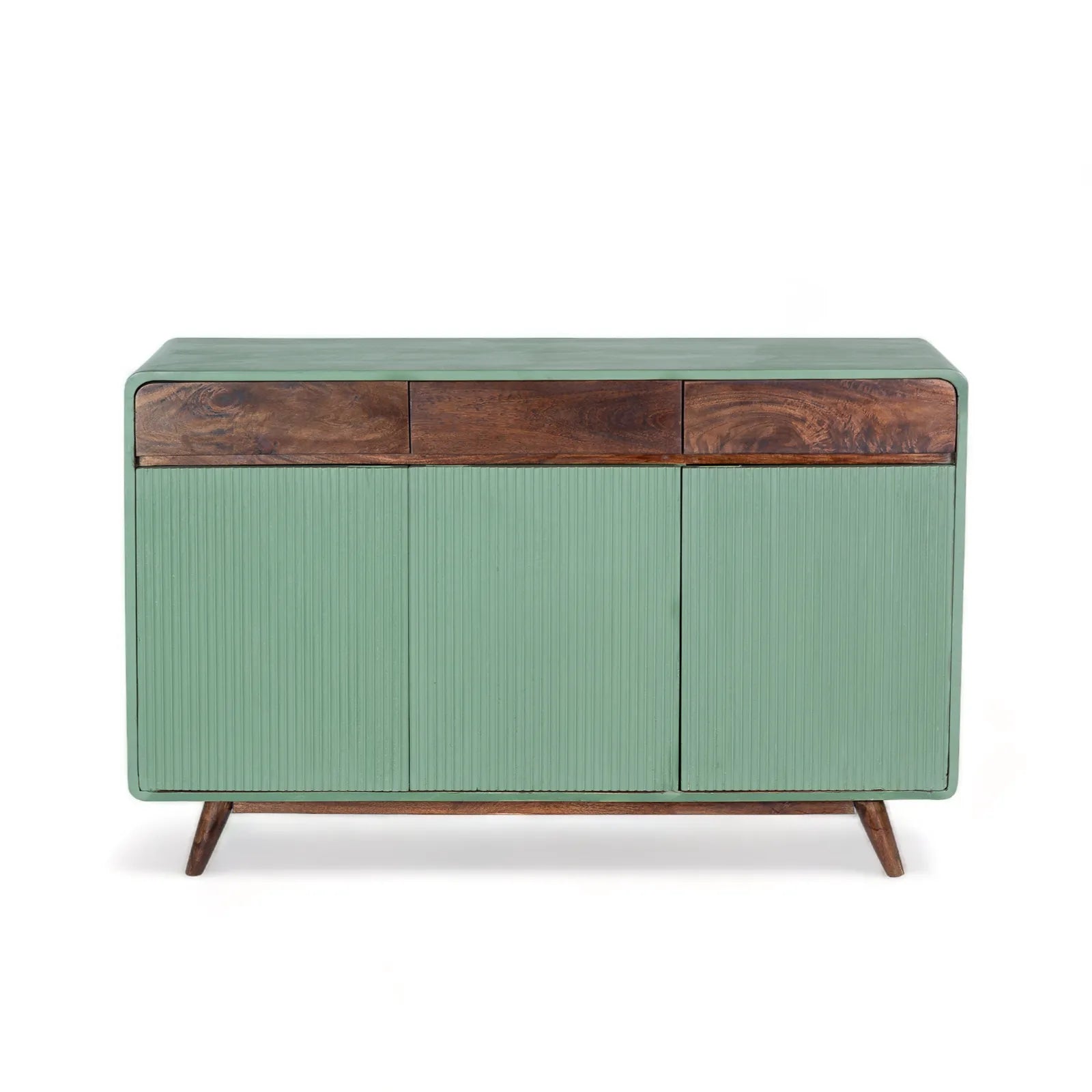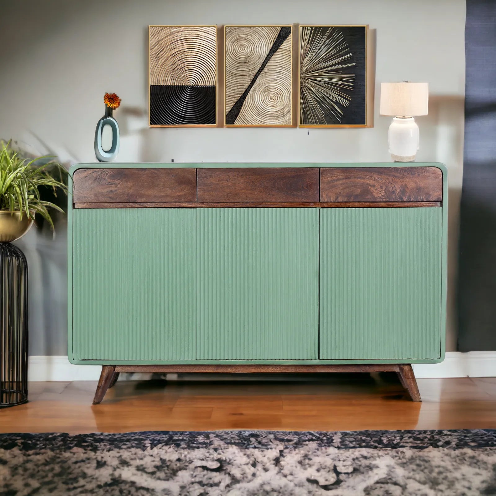 Introducing the Rodondo Sideboard: a masterpiece crafted from exquisite mango wood, blending timeless elegance with practicality. This sideboard boasts three intricately carved fluted doors that add a touch of artistry to your living space. With three spacious drawers, it provides ample storage for your essentials. The Rodondo Sideboard is distinguished by its gracefully rounded edges, embodying a harmonious fusion of form and function. Its premium finish in a captivating olive green hue, accented with the rich and inviting tubaq color, exudes a sense of opulence that complements any décor style. Elevate your home with the Rodondo Sideboard, where exceptional craftsmanship meets sophisticated design, offering a versatile and stunning addition to your living space.