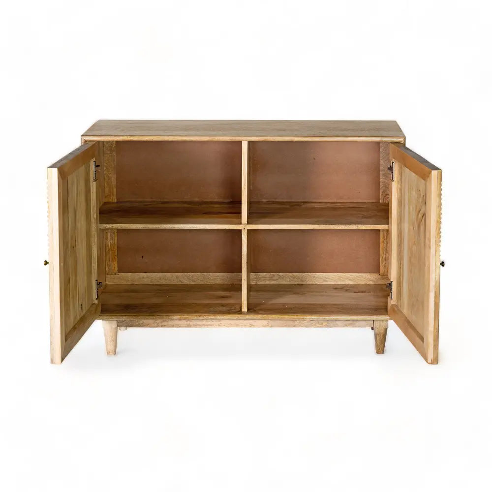 Introducing the Rodondo Sideboard: a masterpiece crafted from exquisite mango wood, blending timeless elegance with practicality. This sideboard boasts three intricately carved fluted doors that add a touch of artistry to your living space. With three spacious drawers, it provides ample storage for your essentials. The Rodondo Sideboard is distinguished by its gracefully rounded edges, embodying a harmonious fusion of form and function. Its premium finish in a captivating olive green hue, accented with the rich and inviting tubaq color, exudes a sense of opulence that complements any décor style. Elevate your home with the Rodondo Sideboard, where exceptional craftsmanship meets sophisticated design, offering a versatile and stunning addition to your living space.