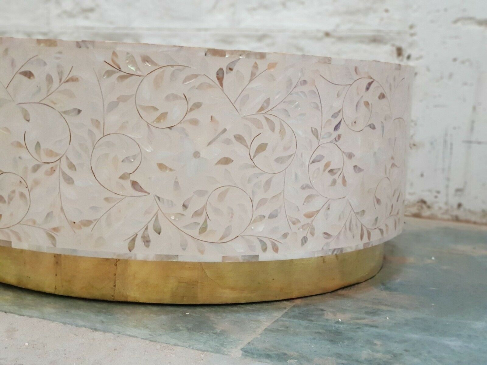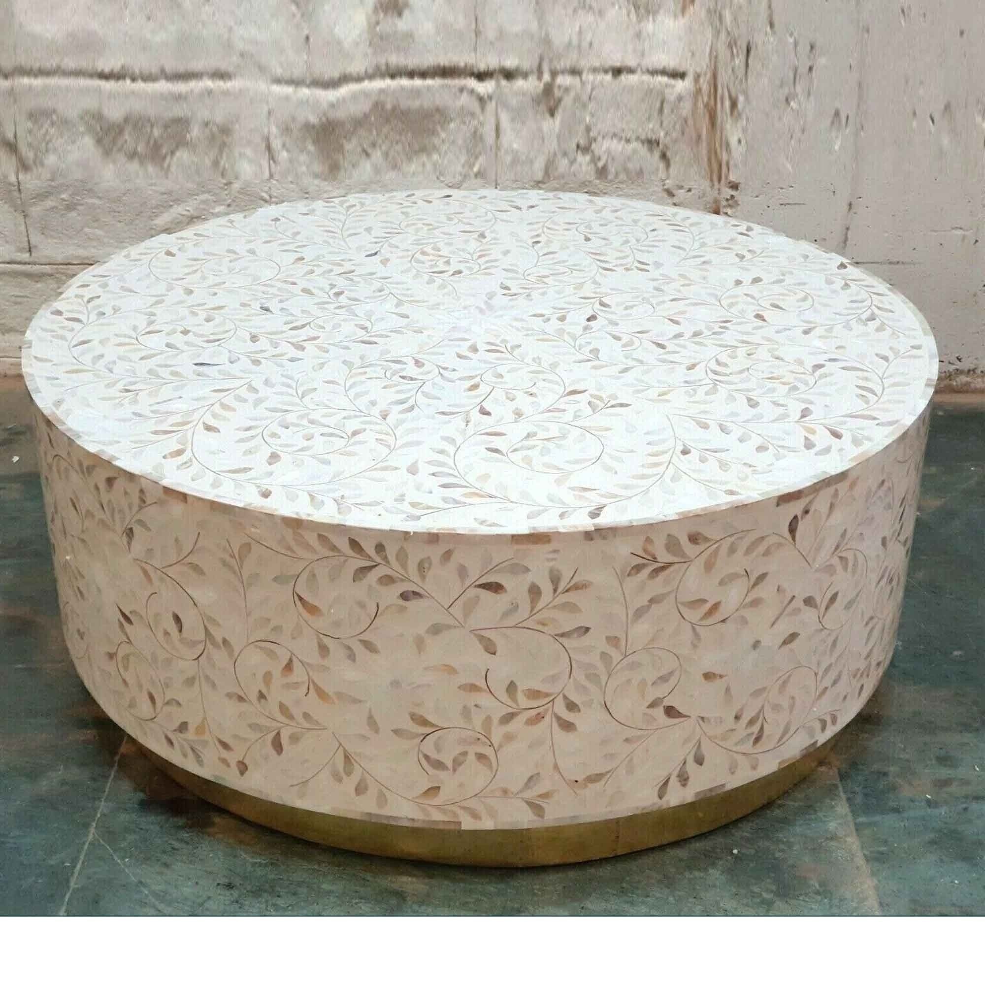 Maaya Bone Inlay Mother of Pearl Drum Round Coffee Table with brass base