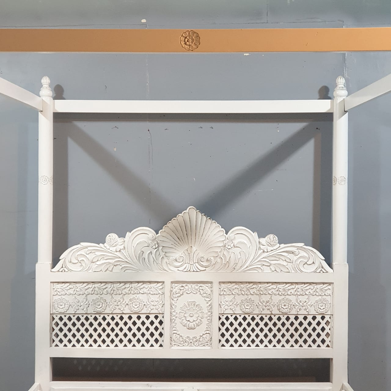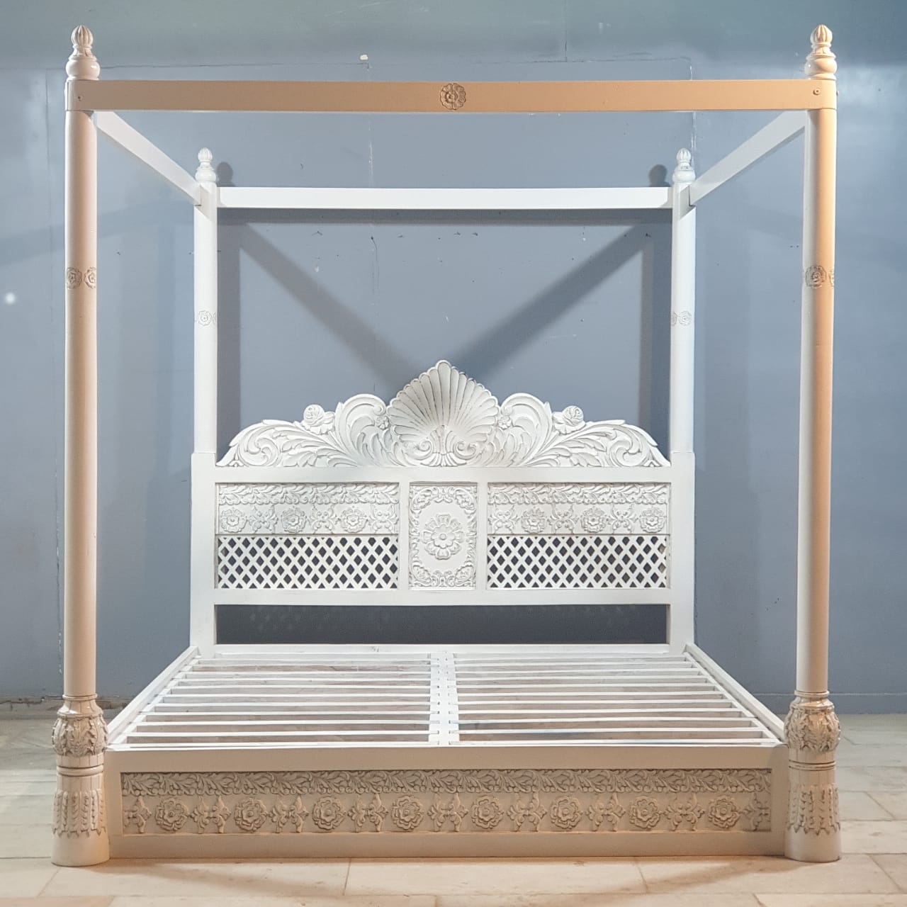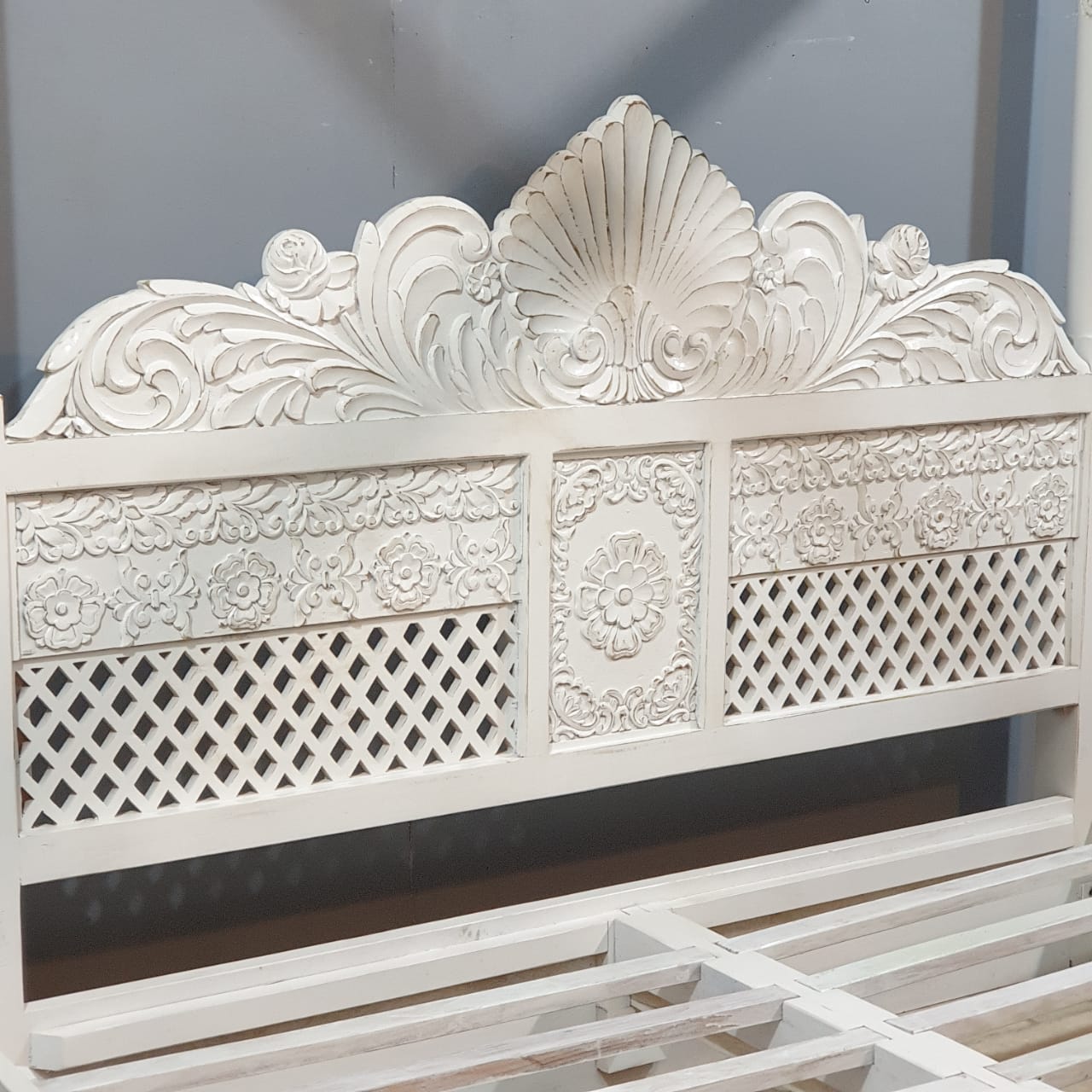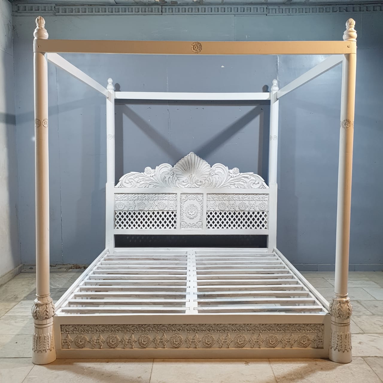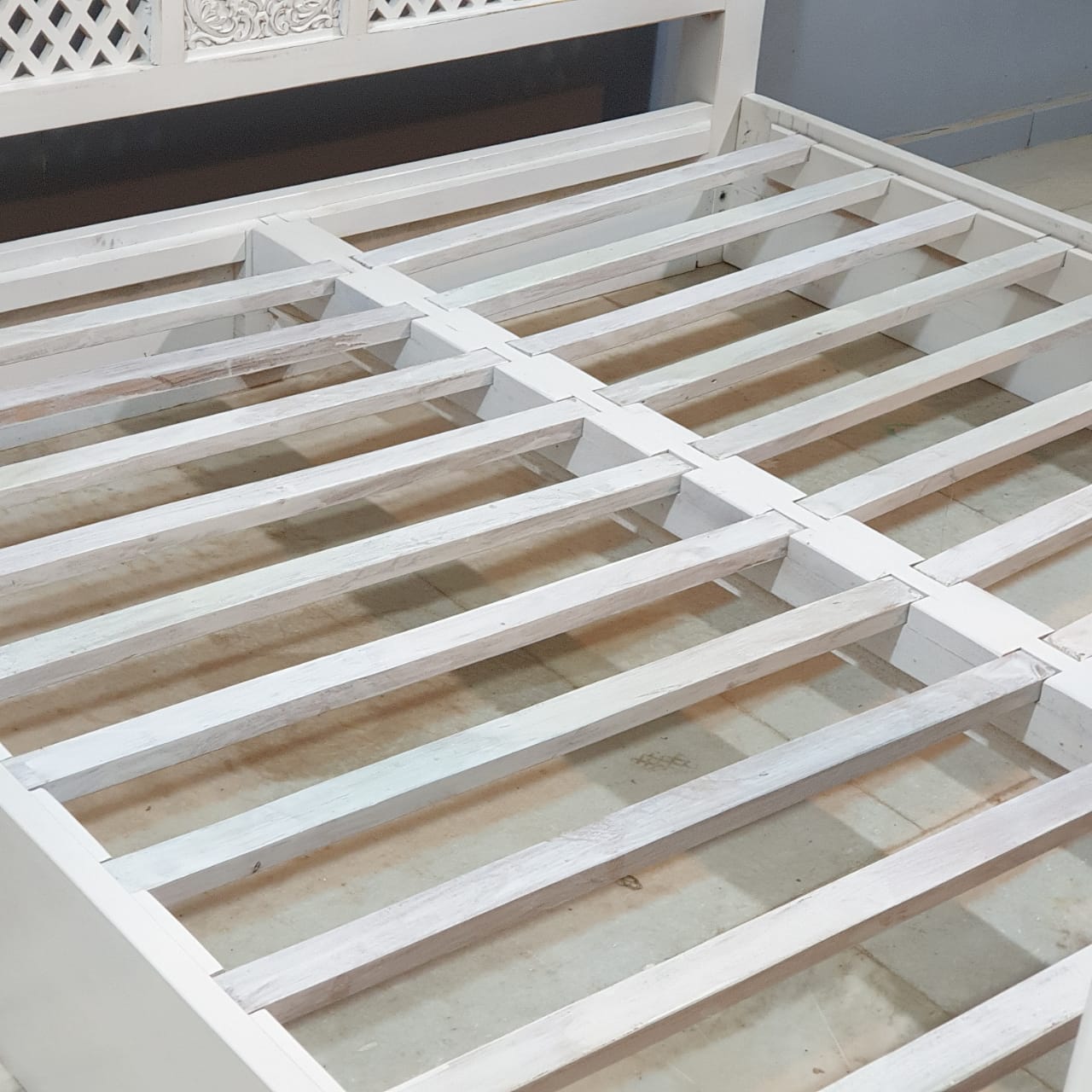 Maharaja Hand Carved Mango Wood Bed rustic Whitewash