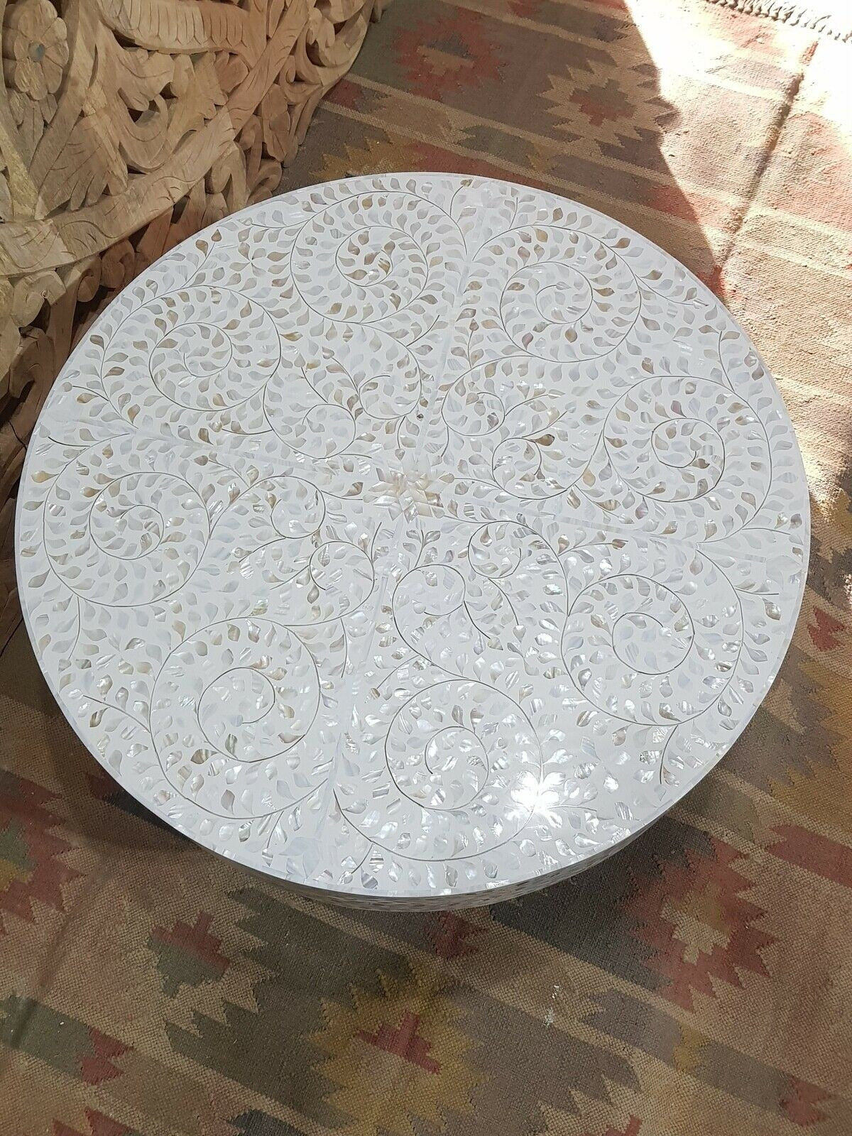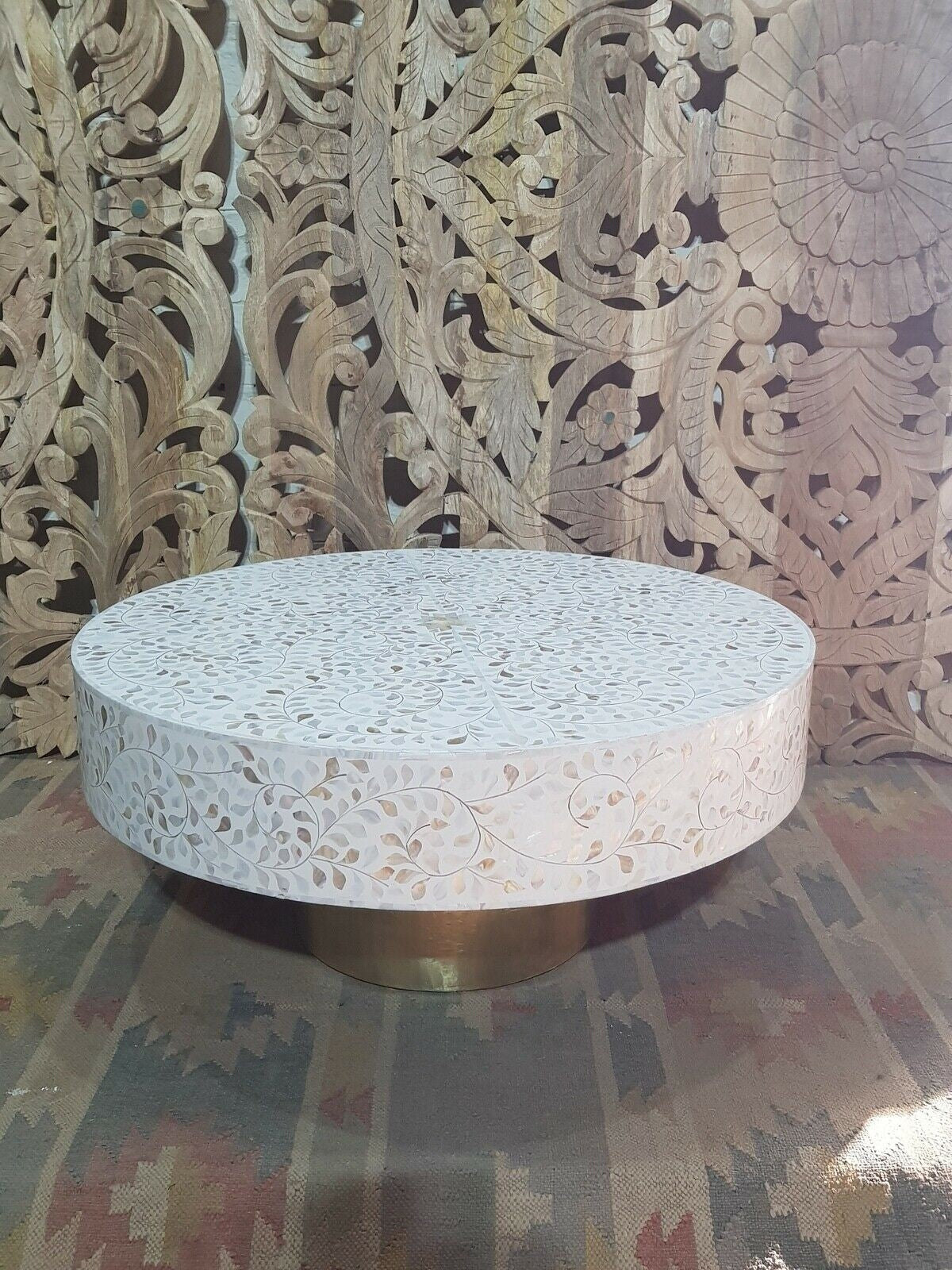 Maya Bone Inlay Indian Solid Wood Round Coffee Table Floral Pattern White